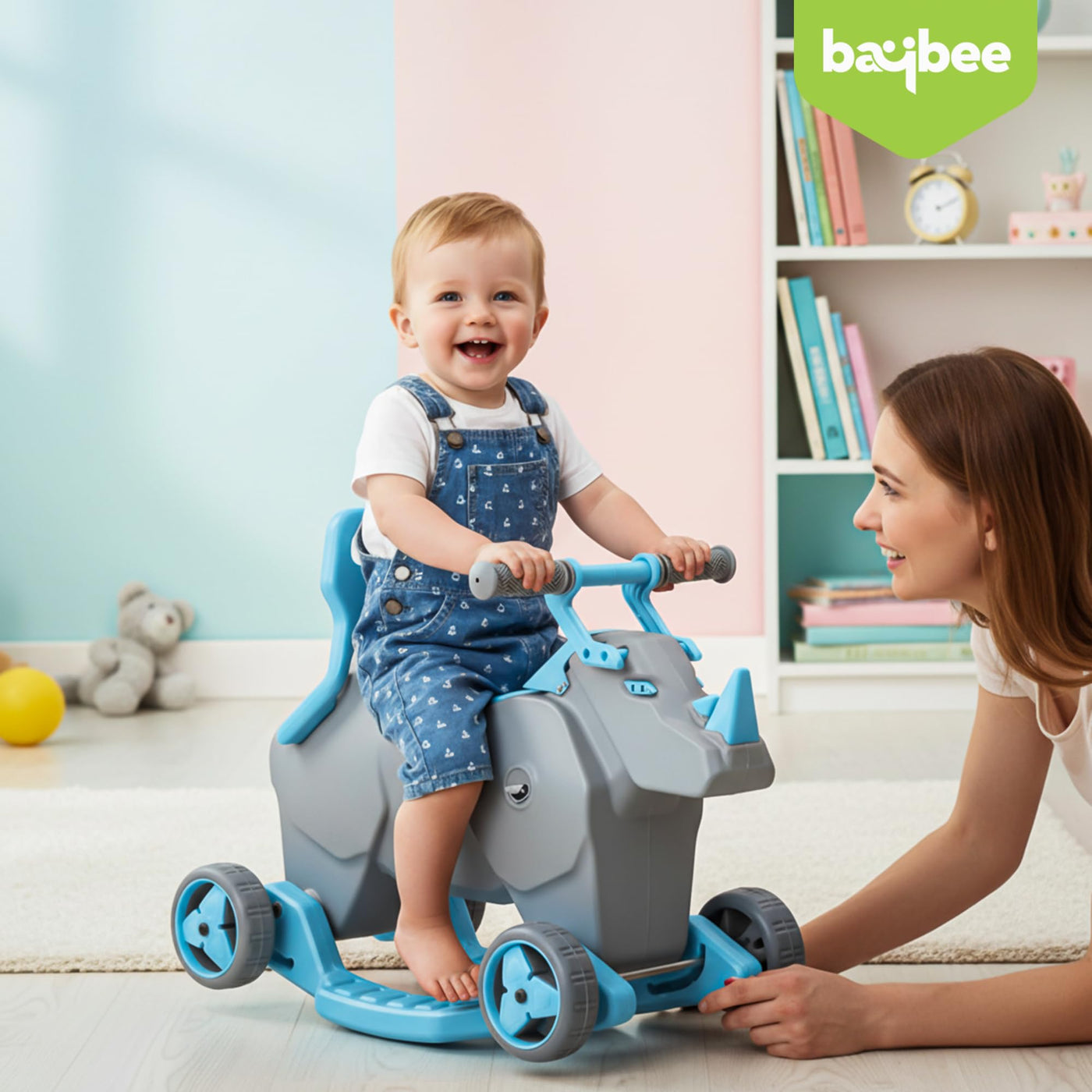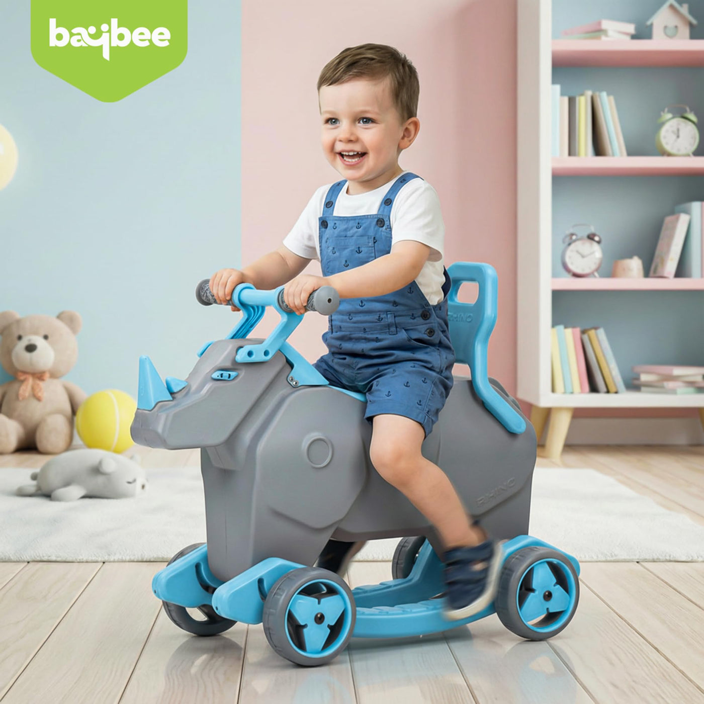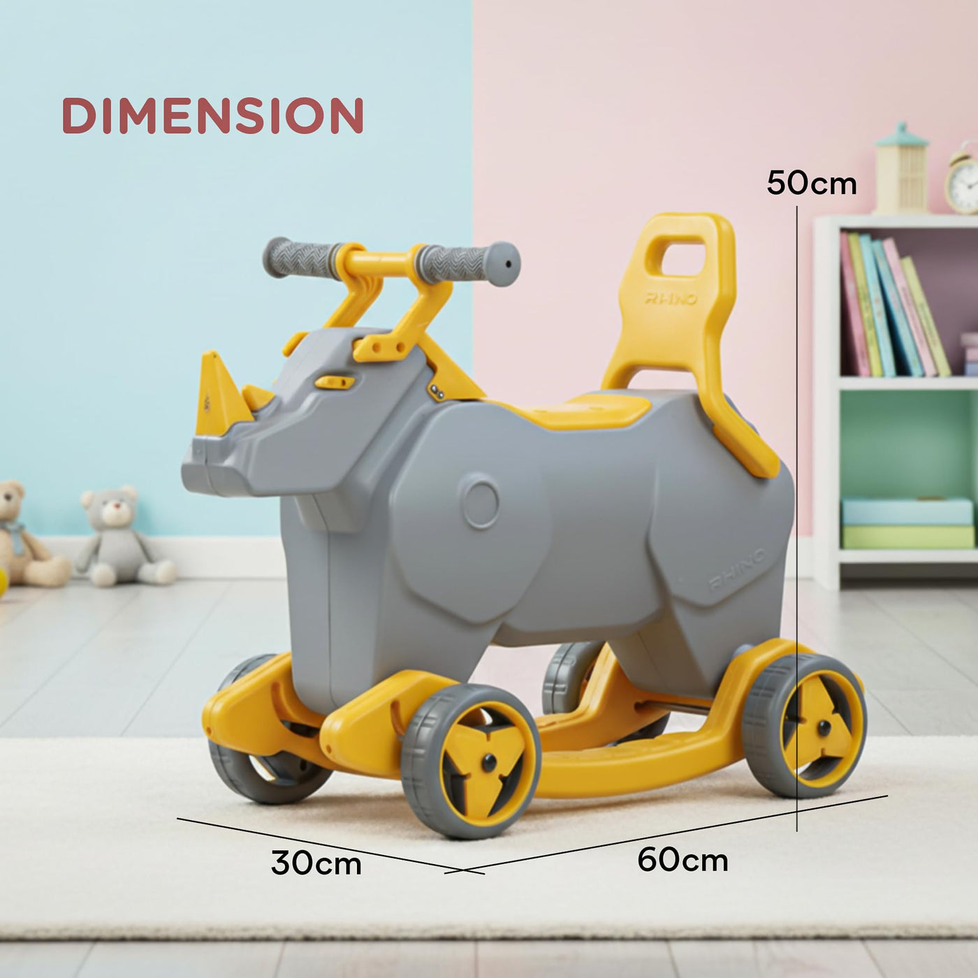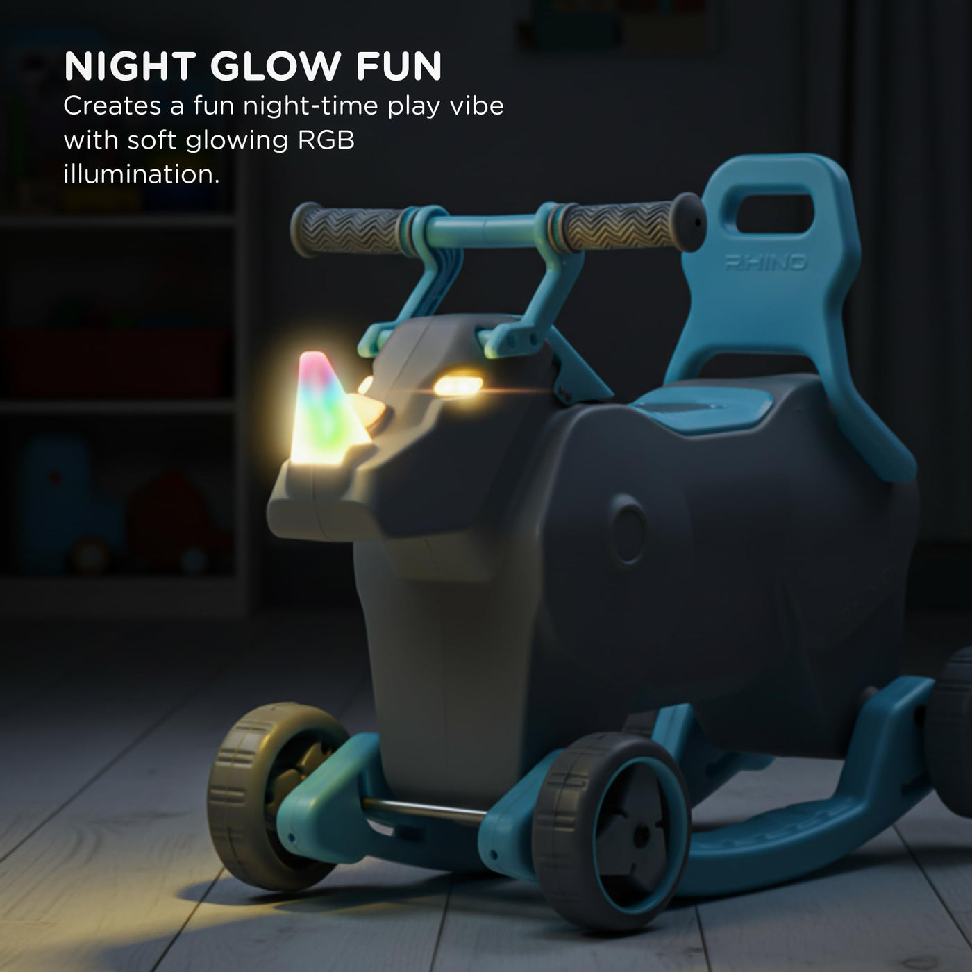 The versatile Baybee Rhino 2-in-1 Ride-On & Rocker is perfect for ride on cars for kids 1-5 years as it easily transitions between Ride-On and Rocking modes, offering double the fun and development opportunities for your child. This toy promotes balancing & motor skill development, making it ideal for baby car for 0 to 3 year baby, helping your little one enhance their motor skills and balance in a fun and safe way. Crafted with a sturdy, durable design, it includes non-slip handles, a robust footrest, and silent wheels, ensuring safety and comfort, making it a great choice for a kids car. The Baybee Rhino is perfect for boosting confidence and is ideal as a push car for kids 1-5 years. It features a unique Night Glow Fun function, with soft RGB lighting that adds a calming, nighttime play vibe, making it an excellent choice for a kids car for 2-5 years boy. For added excitement, the toy comes equipped with built-in music and sound effects, ensuring endless fun for your child, making it a fantastic option for ride on toys for 2+ year old. Designed with easy storage in mind, it is perfect for keeping in a playroom or nursery, and works wonderfully as a rocking chair for babies. The backrest and footrest provide excellent comfort during playtime, whether in rocking or riding mode, making it a great rider for kids. Additionally, it engages multiple senses with visual, tactile, and auditory stimuli, making it an ideal rocking chair for kids 1-5 years, encouraging sensory development. The Baybee Rhino is not only a fun way for kids to play but also a developmental tool for your child’s growth, offering both entertainment and valuable learning experiences.