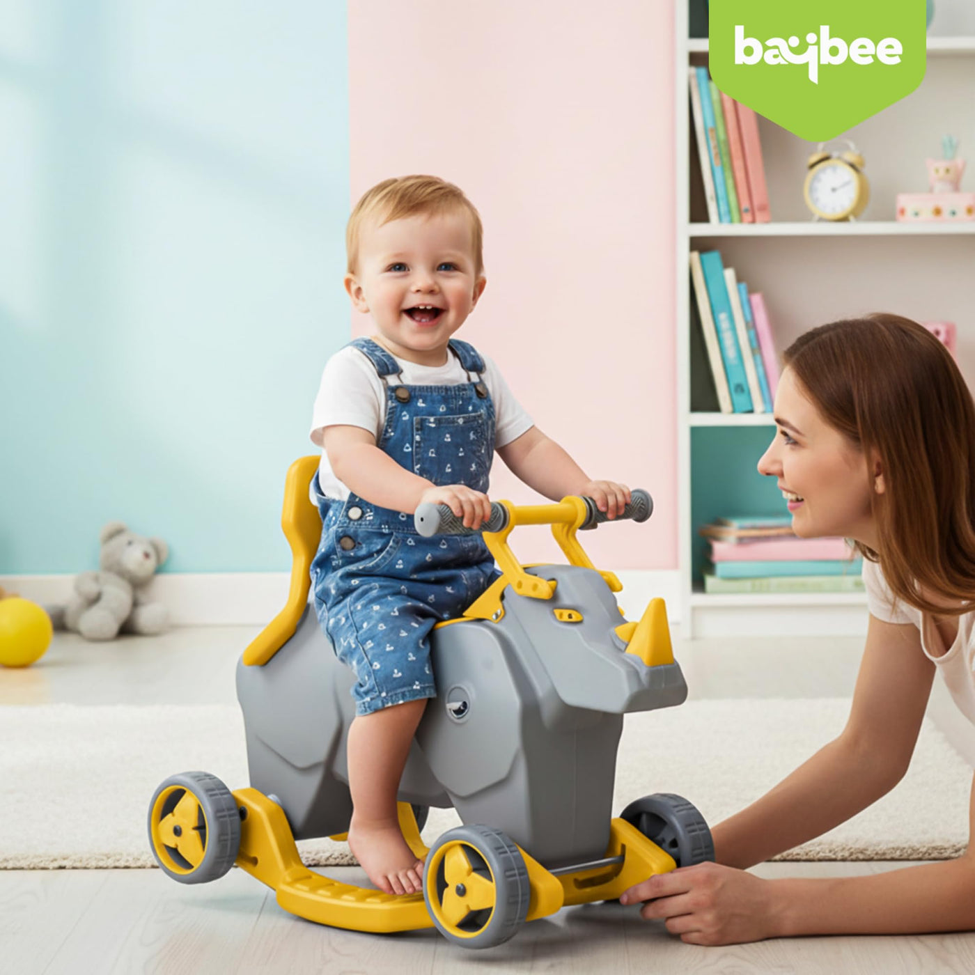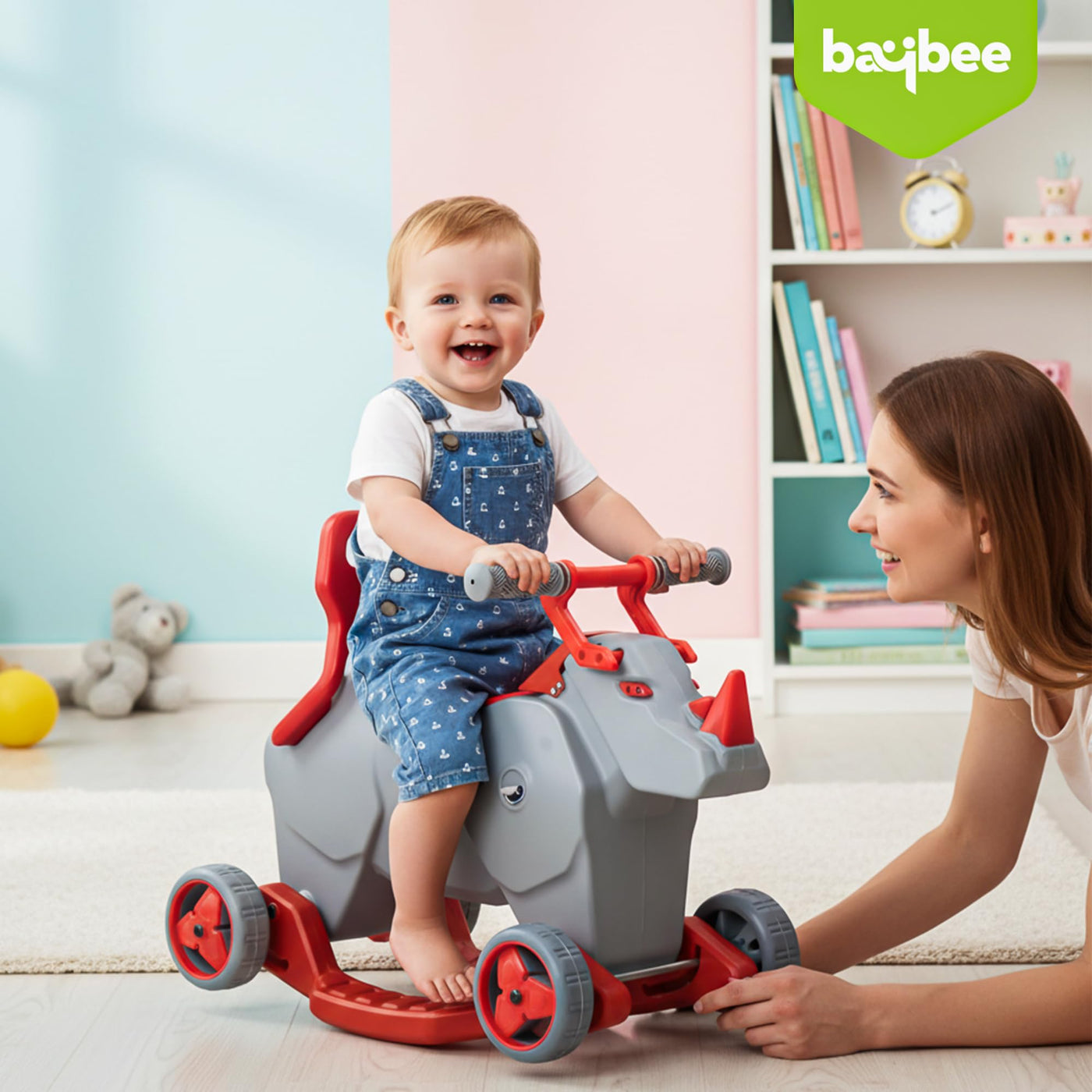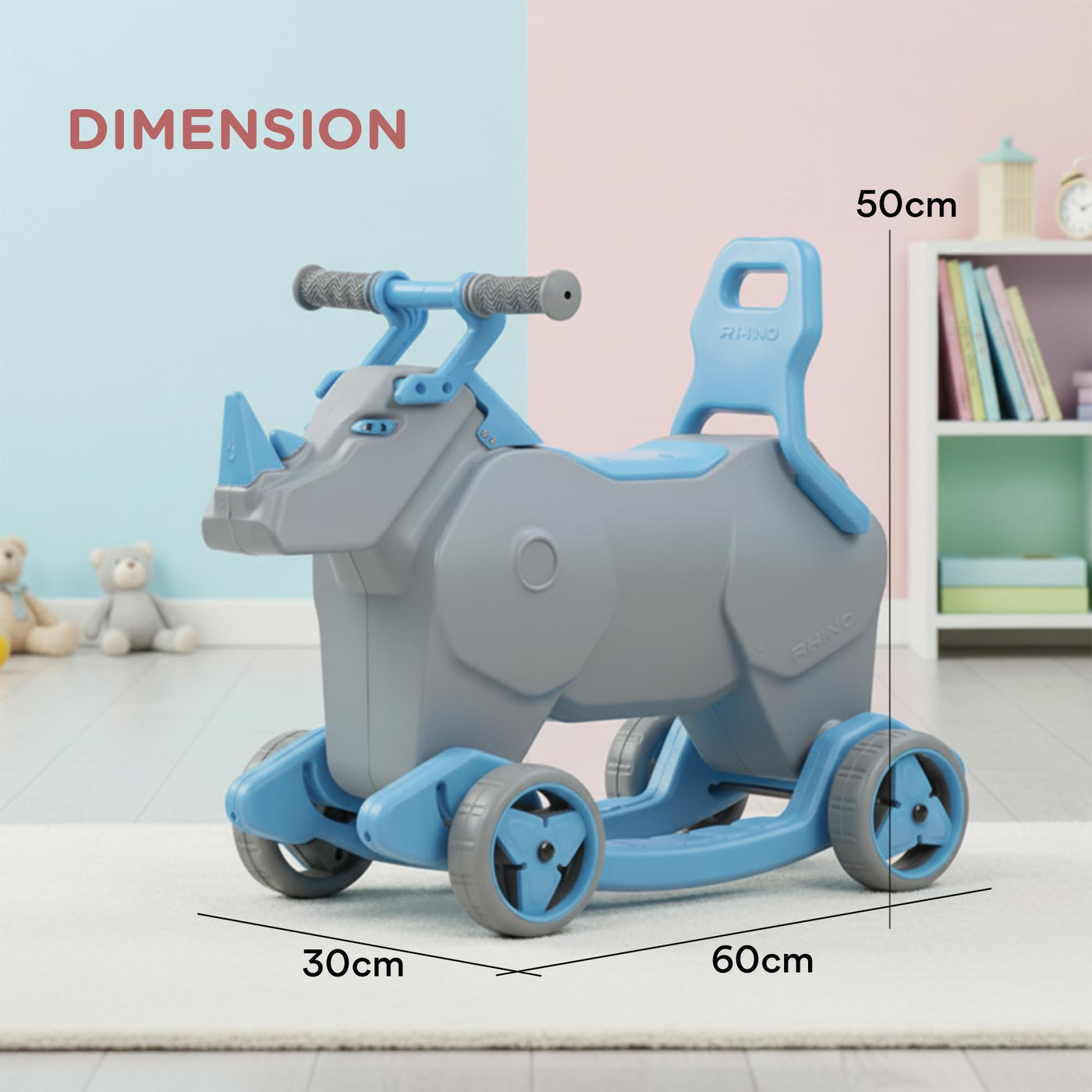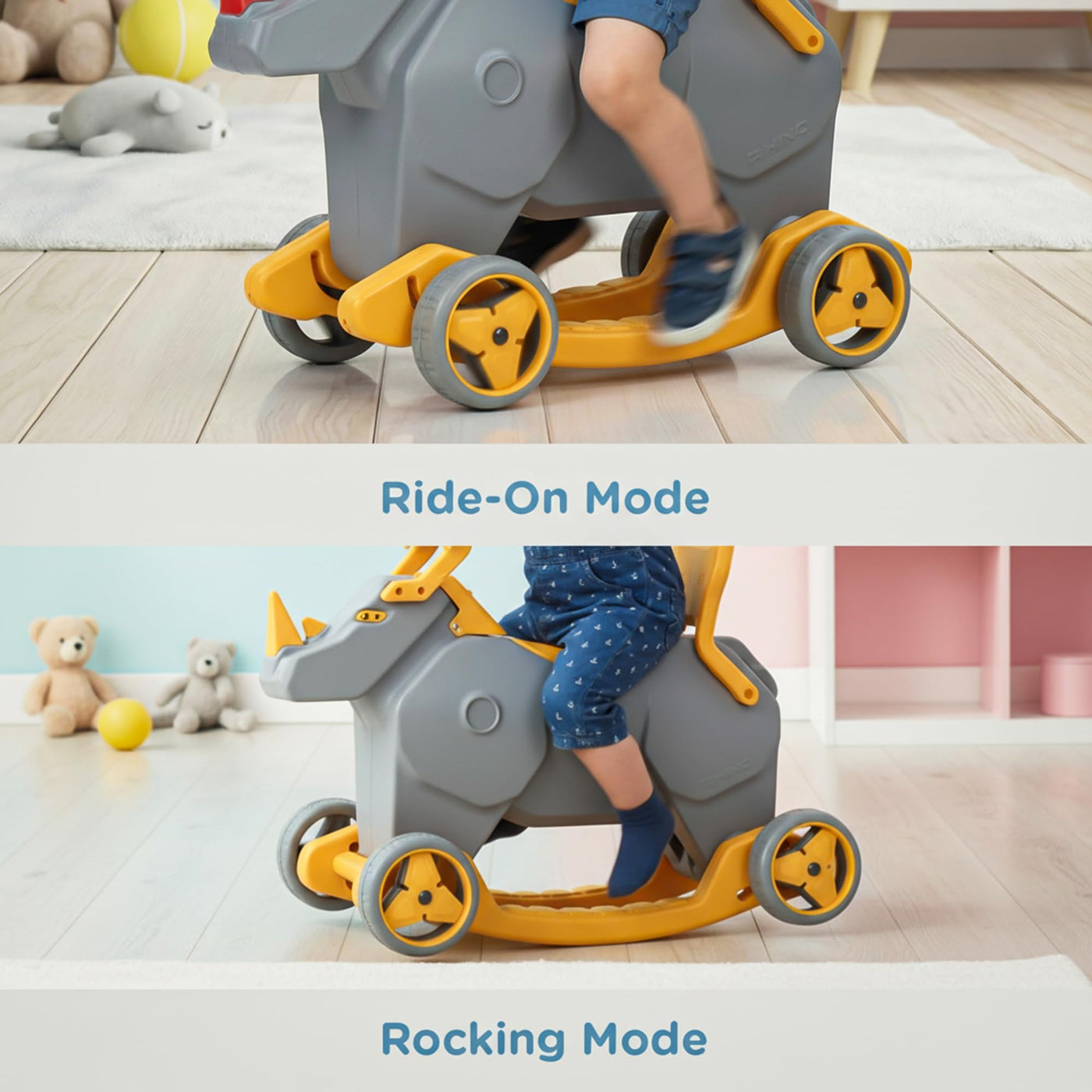 The versatile Baybee Rhino 2-in-1 Ride-On & Rocker is perfect for ride on cars for kids 1-5 years as it easily transitions between Ride-On and Rocking modes, offering double the fun and development opportunities for your child. This toy promotes balancing & motor skill development, making it ideal for baby car for 0 to 3 year baby, helping your little one enhance their motor skills and balance in a fun and safe way. Crafted with a sturdy, durable design, it includes non-slip handles, a robust footrest, and silent wheels, ensuring safety and comfort, making it a great choice for a kids car. The Baybee Rhino is perfect for boosting confidence and is ideal as a push car for kids 1-5 years. It features a unique Night Glow Fun function, with soft RGB lighting that adds a calming, nighttime play vibe, making it an excellent choice for a kids car for 2-5 years boy. For added excitement, the toy comes equipped with built-in music and sound effects, ensuring endless fun for your child, making it a fantastic option for ride on toys for 2+ year old. Designed with easy storage in mind, it is perfect for keeping in a playroom or nursery, and works wonderfully as a rocking chair for babies. The backrest and footrest provide excellent comfort during playtime, whether in rocking or riding mode, making it a great rider for kids. Additionally, it engages multiple senses with visual, tactile, and auditory stimuli, making it an ideal rocking chair for kids 1-5 years, encouraging sensory development. The Baybee Rhino is not only a fun way for kids to play but also a developmental tool for your child’s growth, offering both entertainment and valuable learning experiences.