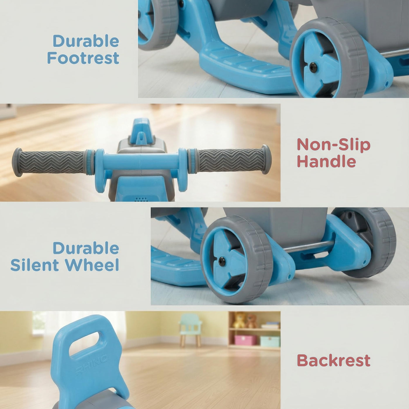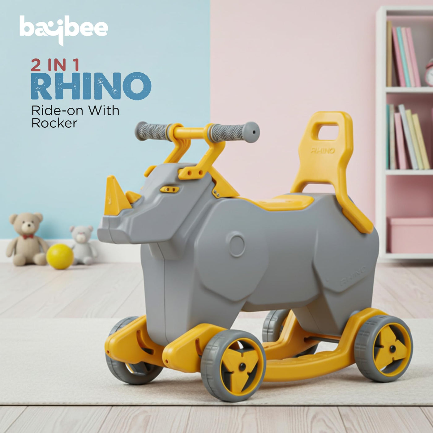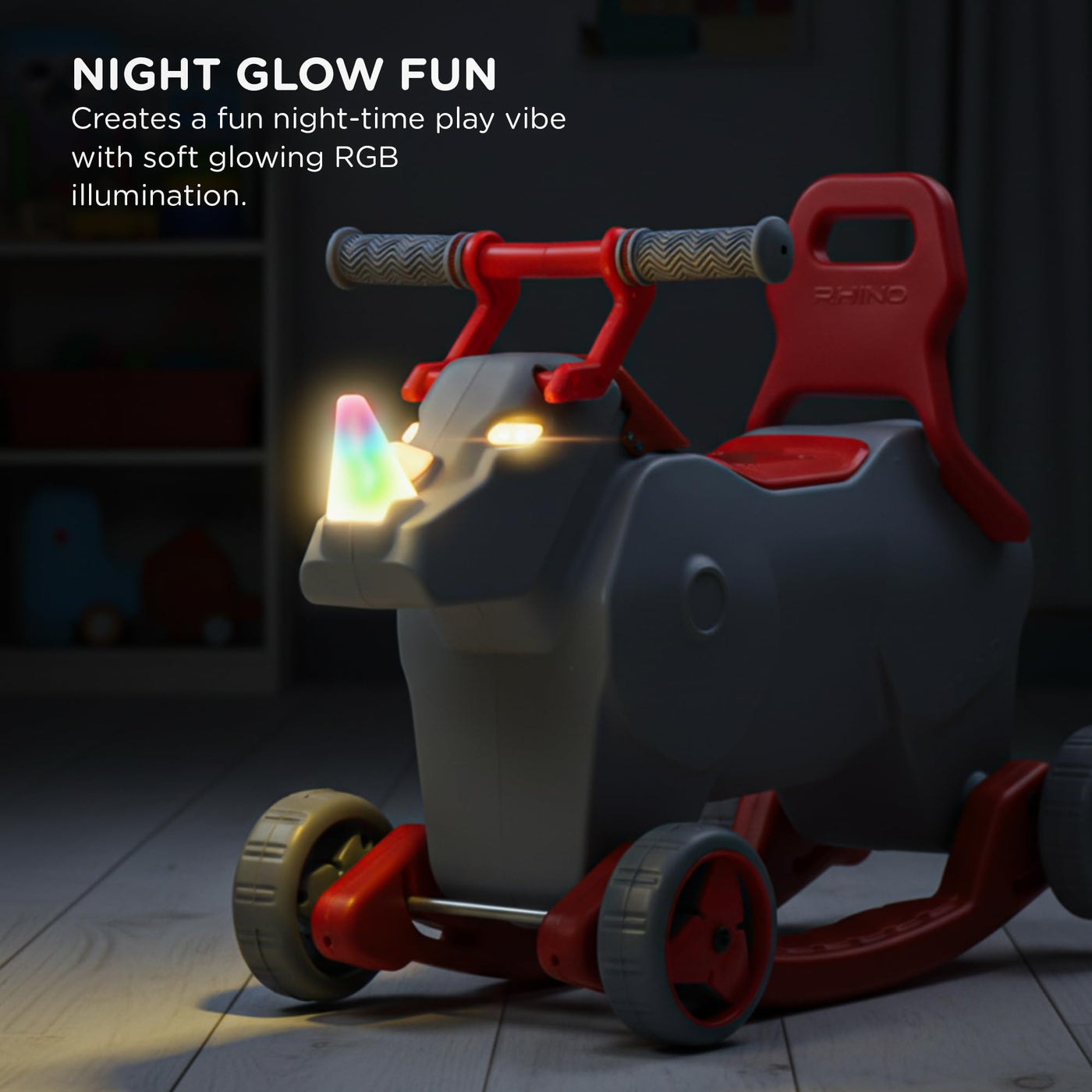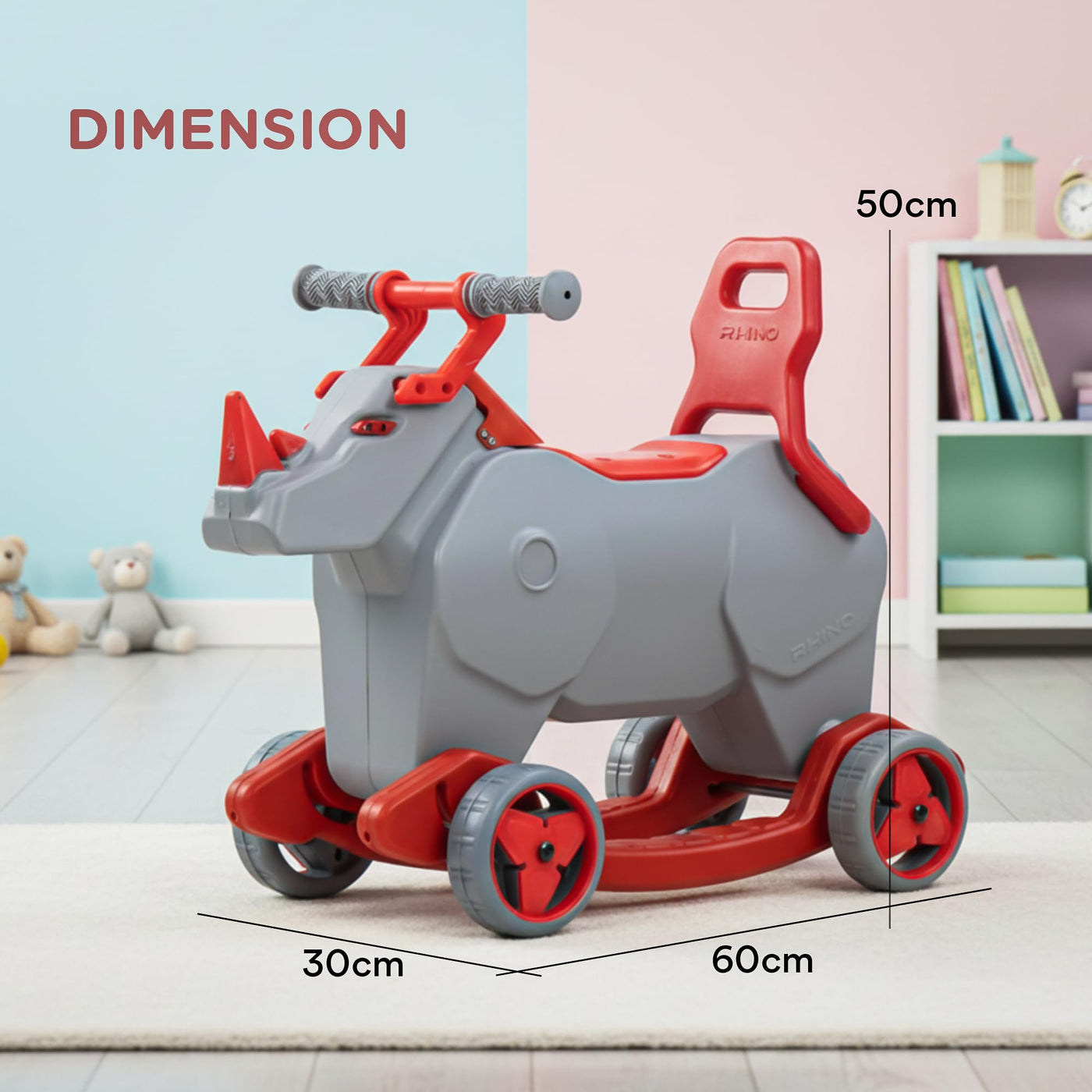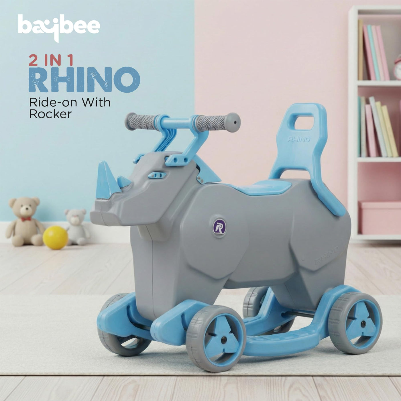 The versatile Baybee Rhino 2-in-1 Ride-On & Rocker is perfect for ride on cars for kids 1-5 years as it easily transitions between Ride-On and Rocking modes, offering double the fun and development opportunities for your child. This toy promotes balancing & motor skill development, making it ideal for baby car for 0 to 3 year baby, helping your little one enhance their motor skills and balance in a fun and safe way. Crafted with a sturdy, durable design, it includes non-slip handles, a robust footrest, and silent wheels, ensuring safety and comfort, making it a great choice for a kids car. The Baybee Rhino is perfect for boosting confidence and is ideal as a push car for kids 1-5 years. It features a unique Night Glow Fun function, with soft RGB lighting that adds a calming, nighttime play vibe, making it an excellent choice for a kids car for 2-5 years boy. For added excitement, the toy comes equipped with built-in music and sound effects, ensuring endless fun for your child, making it a fantastic option for ride on toys for 2+ year old. Designed with easy storage in mind, it is perfect for keeping in a playroom or nursery, and works wonderfully as a rocking chair for babies. The backrest and footrest provide excellent comfort during playtime, whether in rocking or riding mode, making it a great rider for kids. Additionally, it engages multiple senses with visual, tactile, and auditory stimuli, making it an ideal rocking chair for kids 1-5 years, encouraging sensory development. The Baybee Rhino is not only a fun way for kids to play but also a developmental tool for your child’s growth, offering both entertainment and valuable learning experiences.