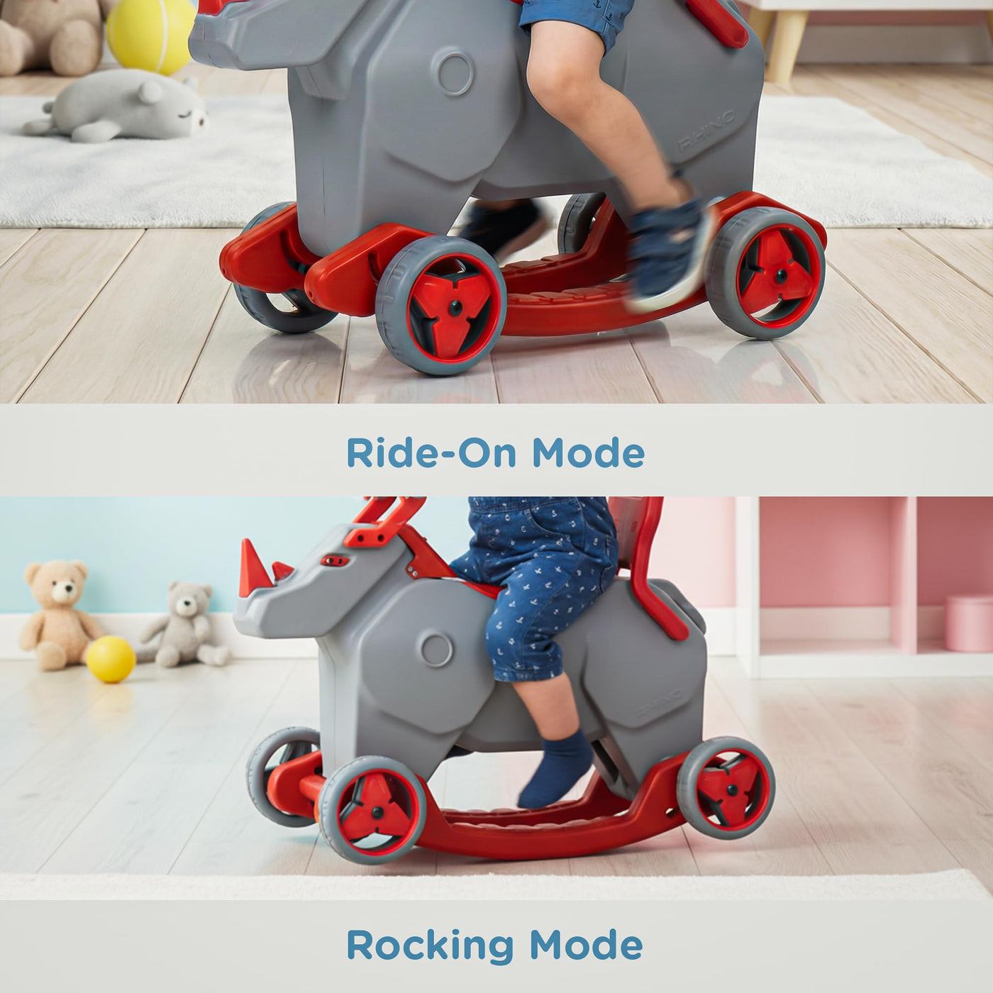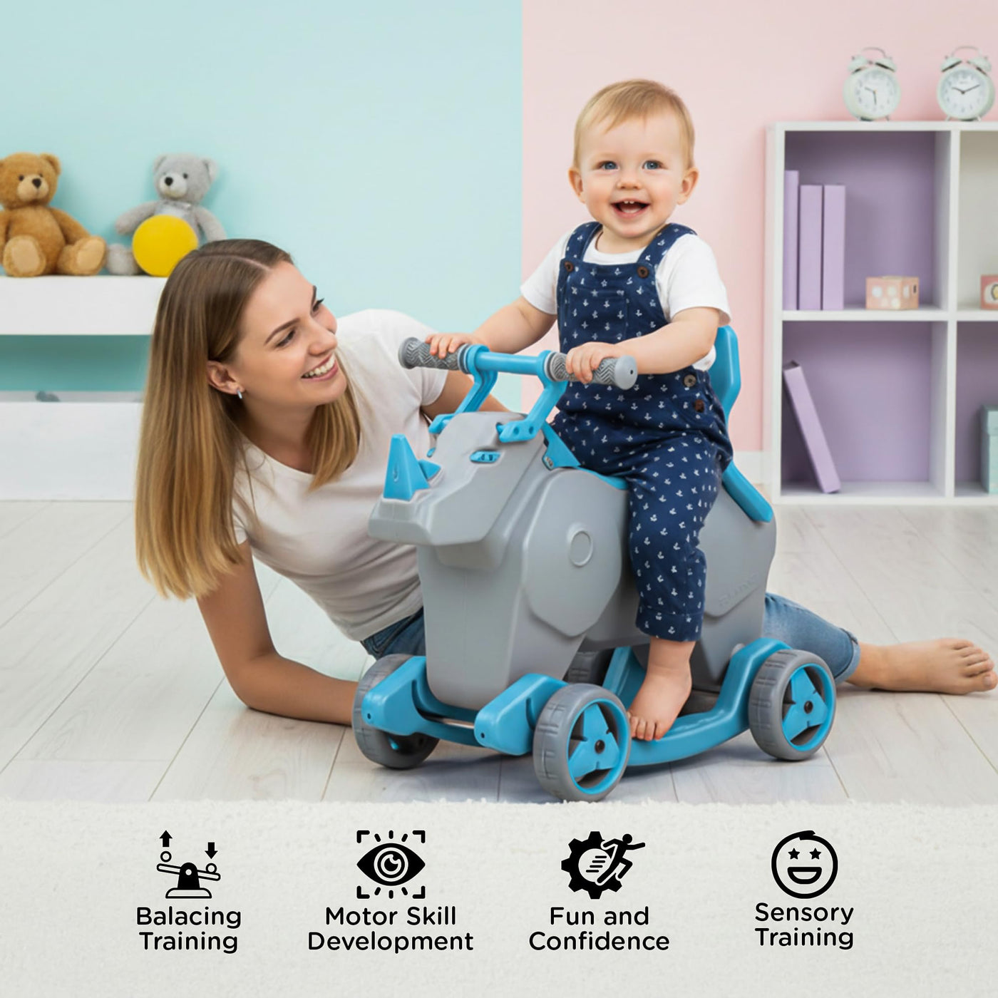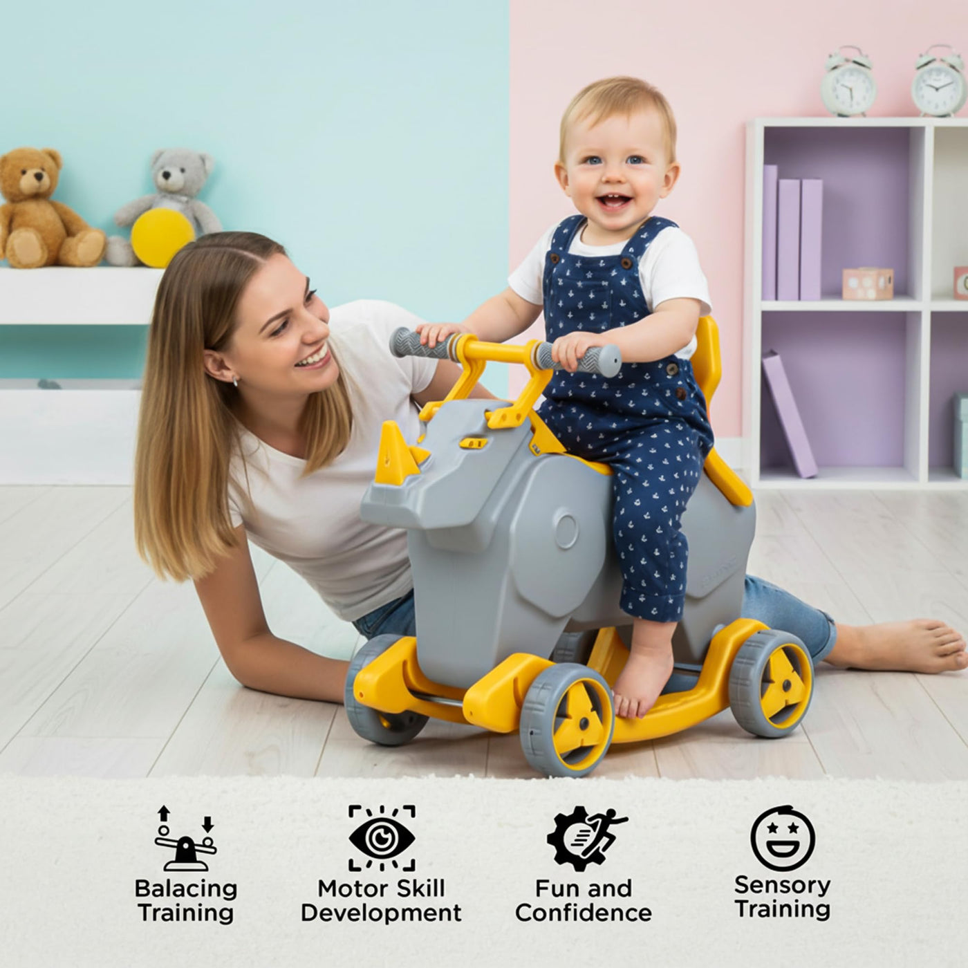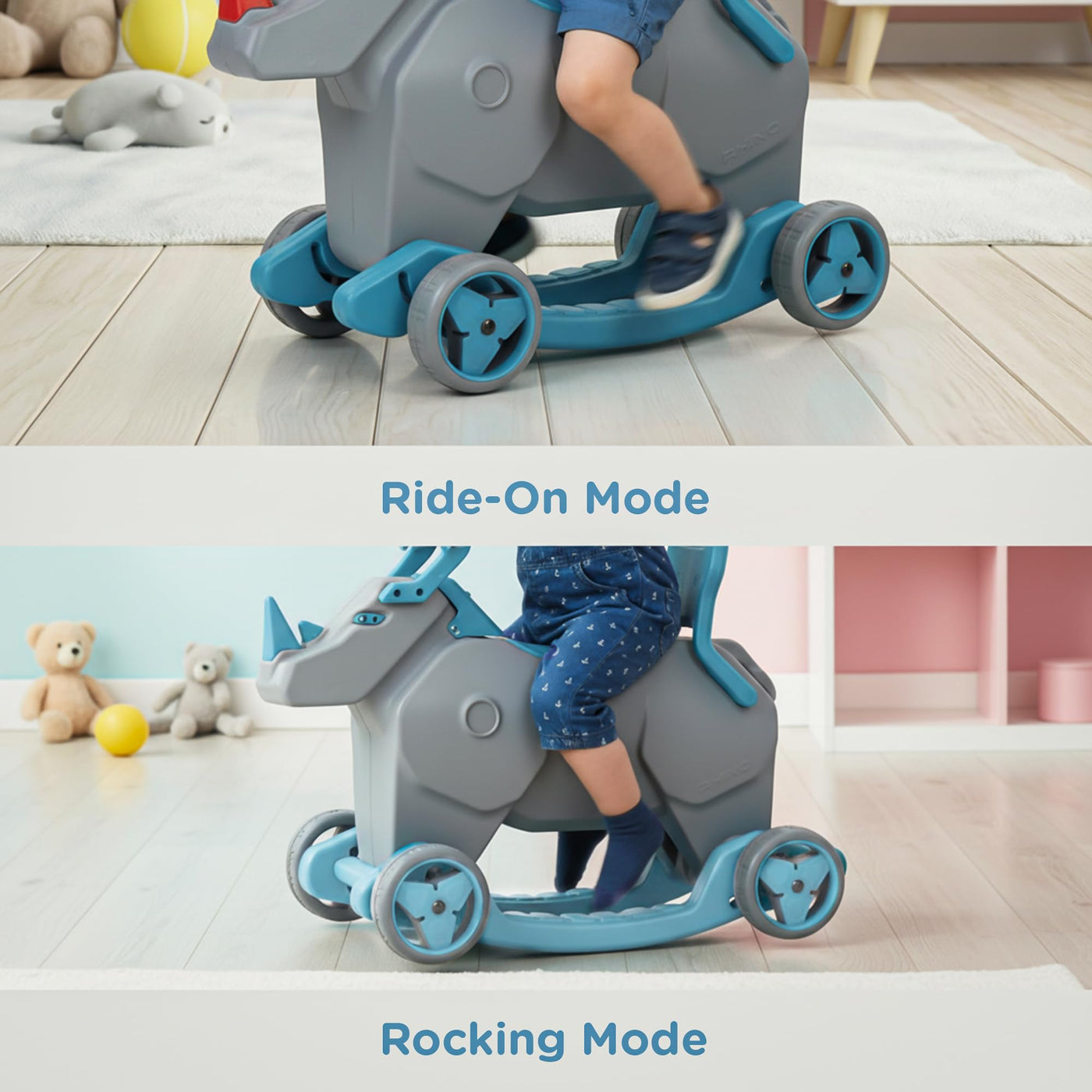 The versatile Baybee Rhino 2-in-1 Ride-On & Rocker is perfect for ride on cars for kids 1-5 years as it easily transitions between Ride-On and Rocking modes, offering double the fun and development opportunities for your child. This toy promotes balancing & motor skill development, making it ideal for baby car for 0 to 3 year baby, helping your little one enhance their motor skills and balance in a fun and safe way. Crafted with a sturdy, durable design, it includes non-slip handles, a robust footrest, and silent wheels, ensuring safety and comfort, making it a great choice for a kids car. The Baybee Rhino is perfect for boosting confidence and is ideal as a push car for kids 1-5 years. It features a unique Night Glow Fun function, with soft RGB lighting that adds a calming, nighttime play vibe, making it an excellent choice for a kids car for 2-5 years boy. For added excitement, the toy comes equipped with built-in music and sound effects, ensuring endless fun for your child, making it a fantastic option for ride on toys for 2+ year old. Designed with easy storage in mind, it is perfect for keeping in a playroom or nursery, and works wonderfully as a rocking chair for babies. The backrest and footrest provide excellent comfort during playtime, whether in rocking or riding mode, making it a great rider for kids. Additionally, it engages multiple senses with visual, tactile, and auditory stimuli, making it an ideal rocking chair for kids 1-5 years, encouraging sensory development. The Baybee Rhino is not only a fun way for kids to play but also a developmental tool for your child’s growth, offering both entertainment and valuable learning experiences.
