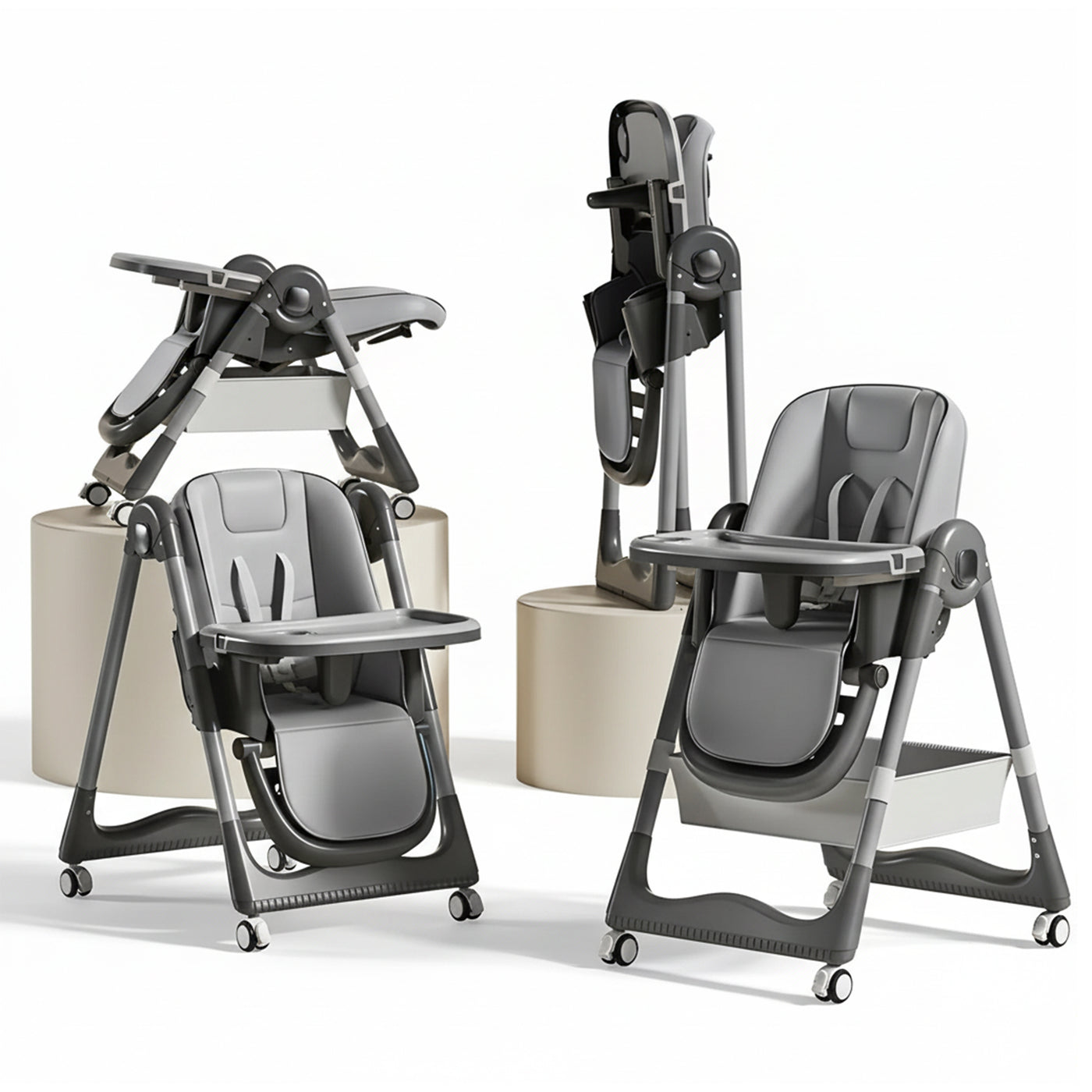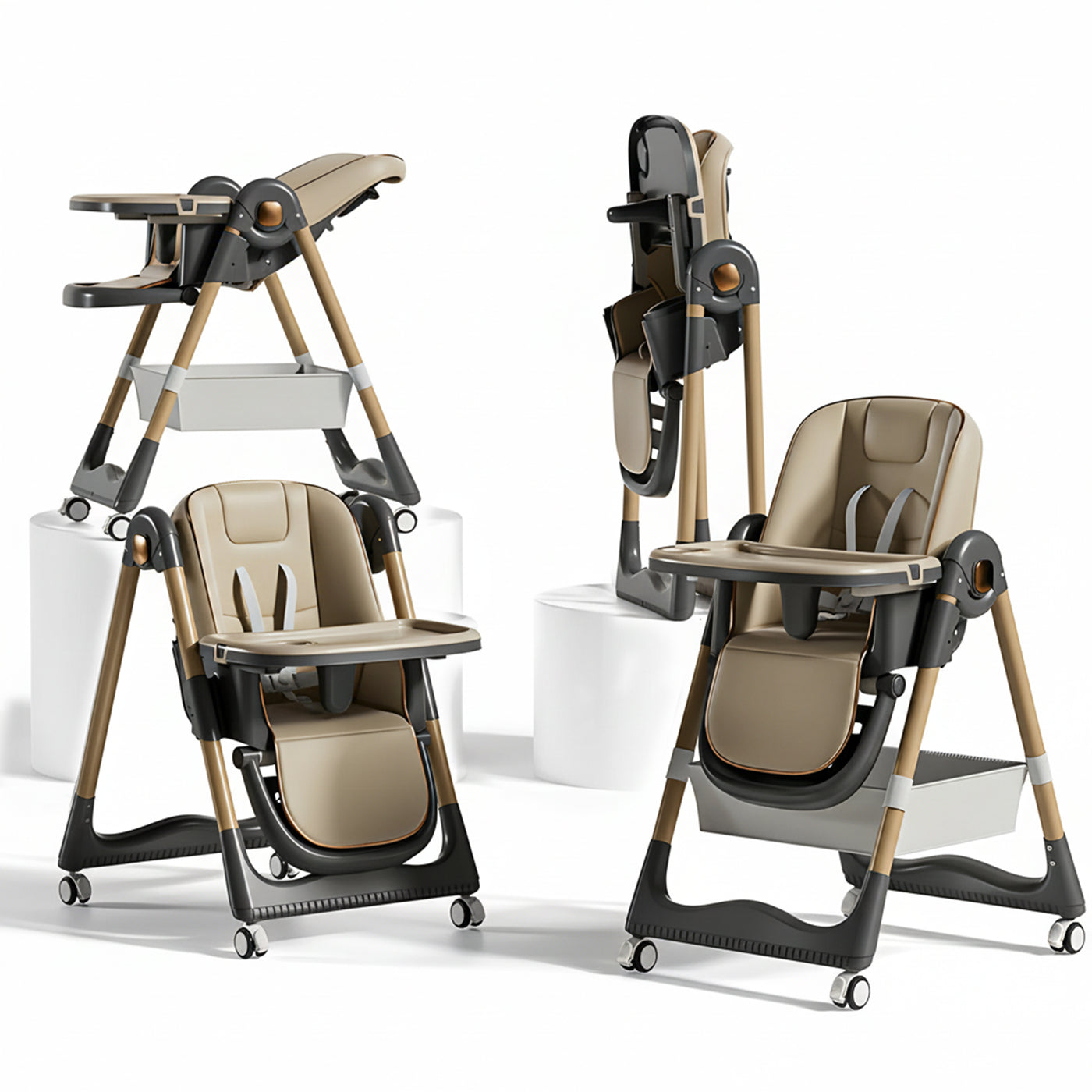 The expanded storage basket holds all your baby's essentials, while the easy-to-remove trays and basket ensure a hygienic dining environment. Built for Safety and Fun Engineered with a robust steel frame and a stable A-type structure, our high chair guarantees your baby's safety without compromising on fun. Equipped with a five-point harness, anti-slip leg design, and lockable wheels, it ensures a safe, enjoyable mealtime.