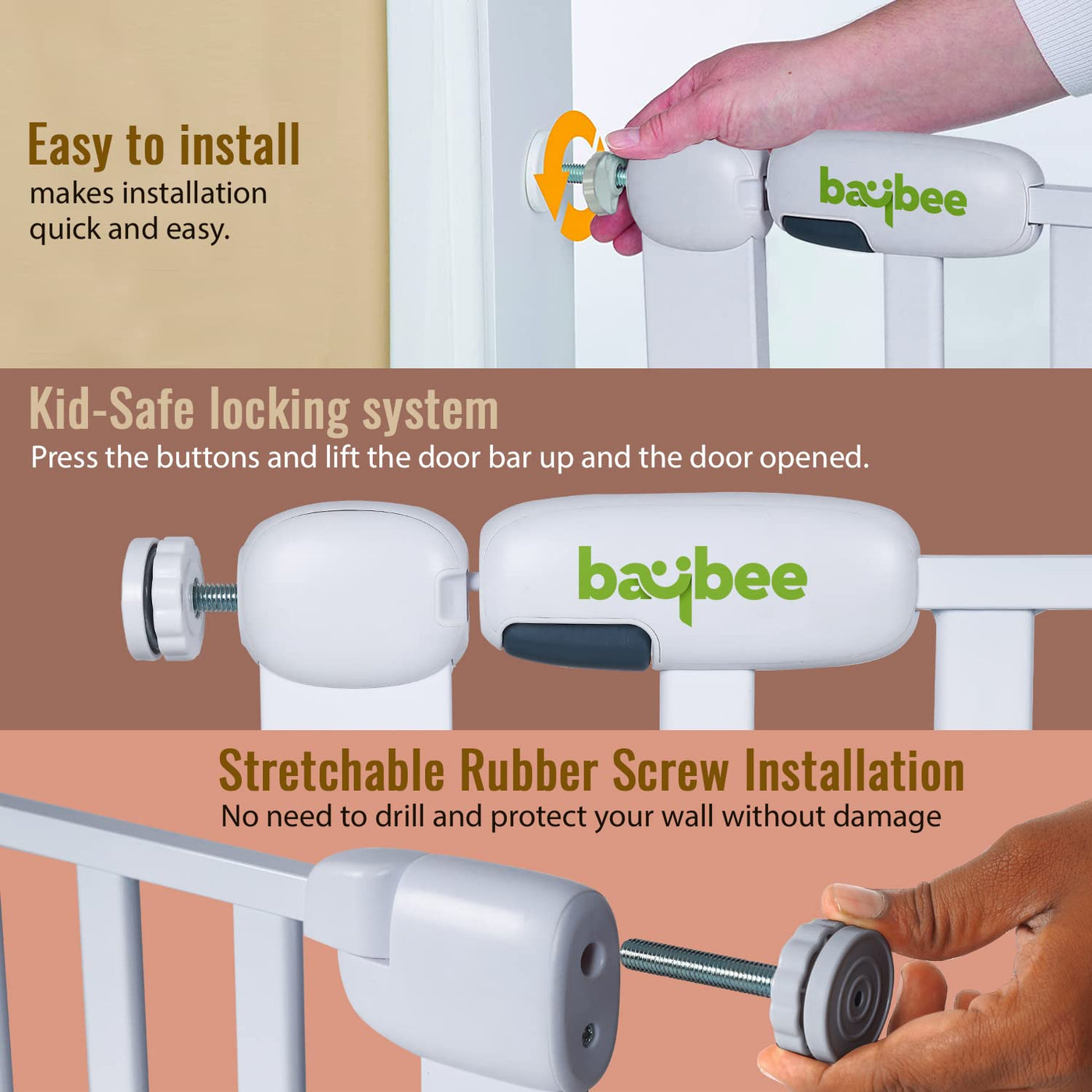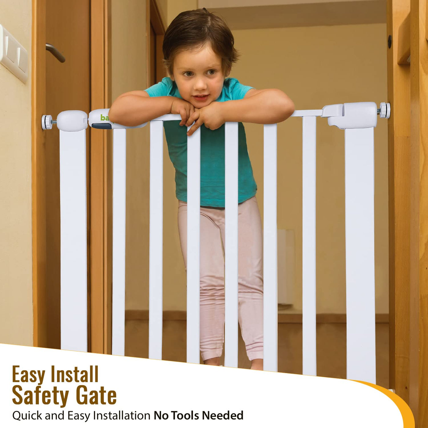 Our Baybee baby gate is designed with a one-touch release easy slide handle safety lock. A secure spring-loaded latch keeps the gate safely closed when not in use. Easy one-handed open and close operation, Fit with extension parts 10cm,20cm,30cm, and 45cm. Extends up to 175cm. No need to worry about forgetting to lock the gate because this one will close itself automatically due to gravity. Open less than 90° and the gate will close itself. Open past 90° and it will stay open. The all-steel design is durable and convenient with a walk-through door. This safety gate conforms to EN1930:2011+EN71 Certified. Easy Open handle features a two-touch release safety lock that's easy for an adult to open but difficult for children. Pressure mount safeguards up to max of 95 Kgs and installs in 5-10 minutes. Providing a level of comfort for parents, the Baybee Easy Step Baby Gate is made of an all-steel construction to hold up to the wear and tear of a toddler. Designed with convenience in mind, the baby gate installs quickly.