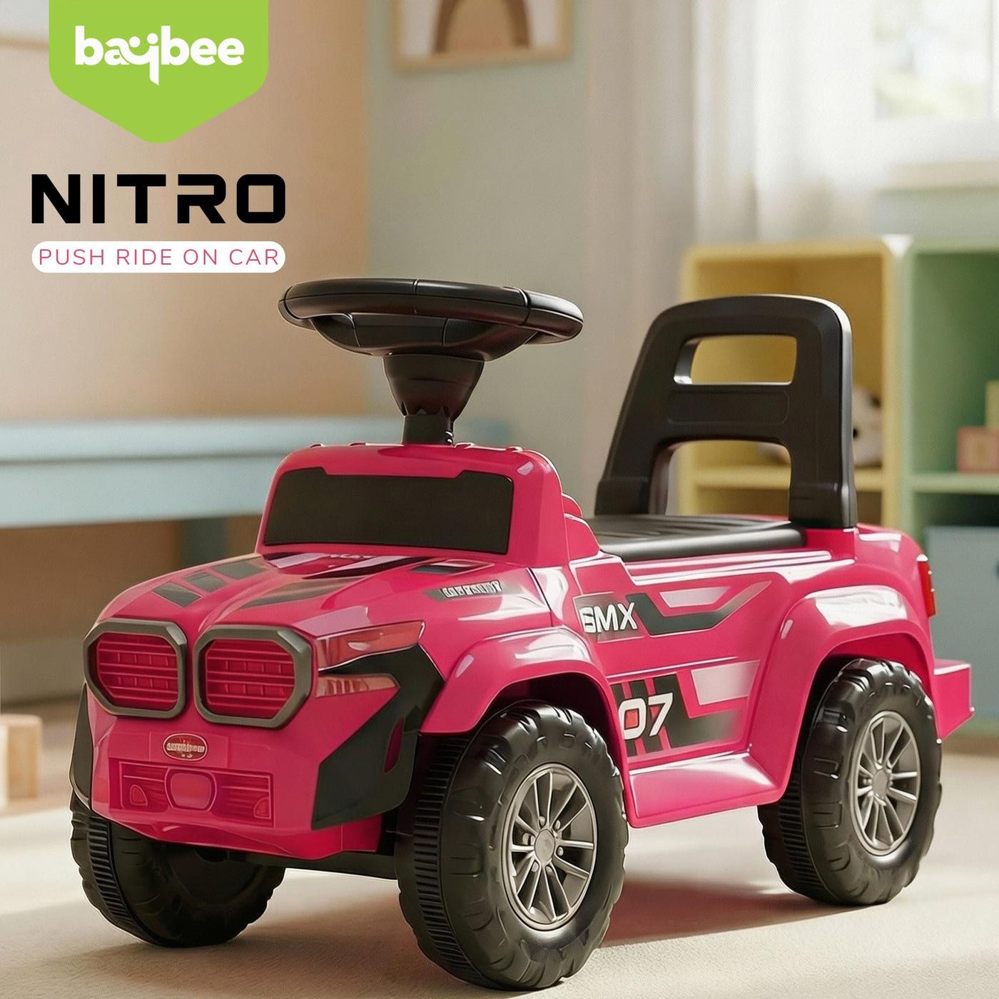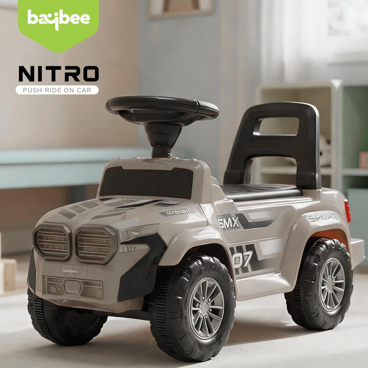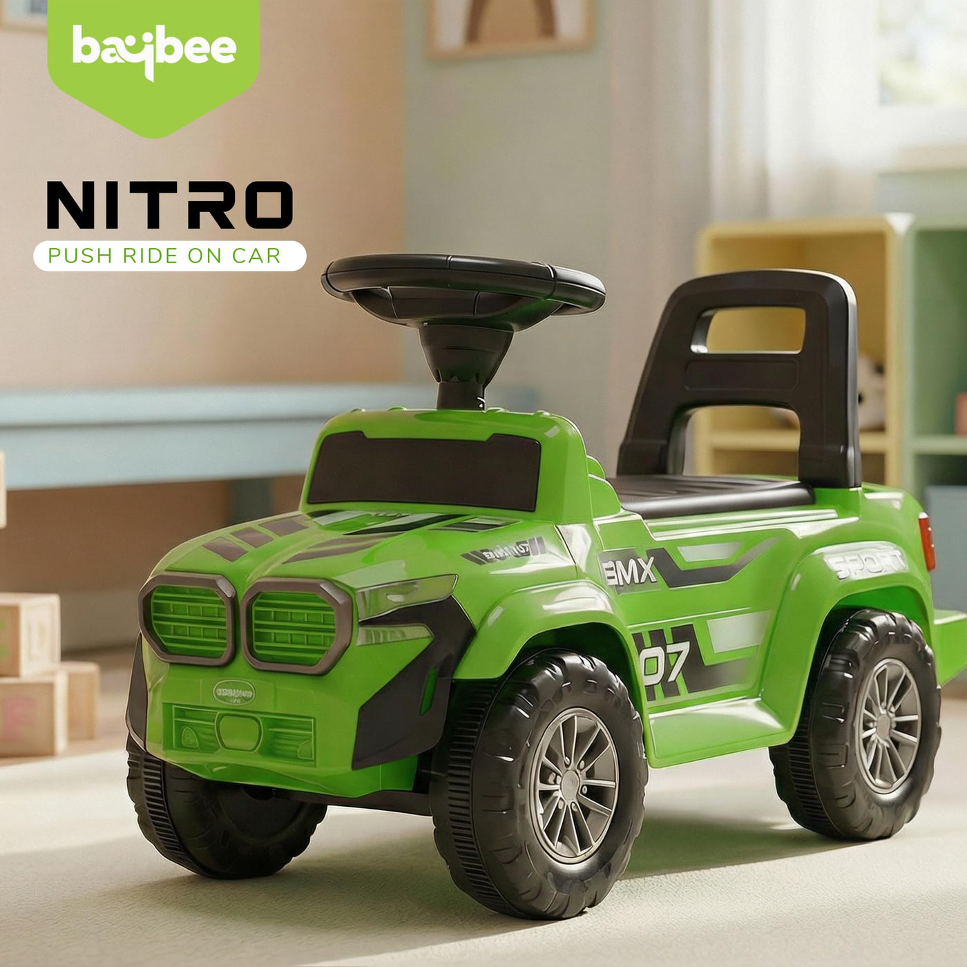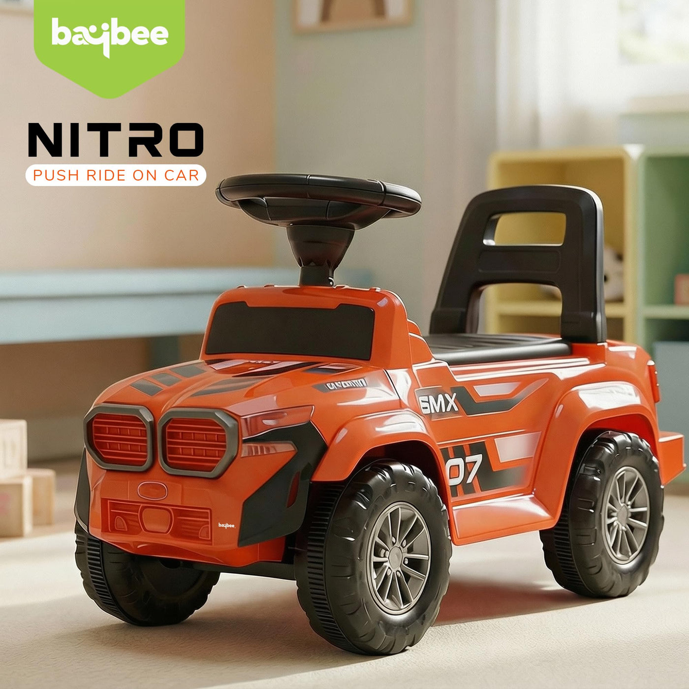 The Baybee Nitro is the perfect baby ride on car for kids, featuring bright LED headlights that enhance play during both day and night, making it ideal for both indoor and outdoor fun. Equipped with an interactive steering wheel, this kids car keeps your little one entertained with engaging music and sounds as they ride.