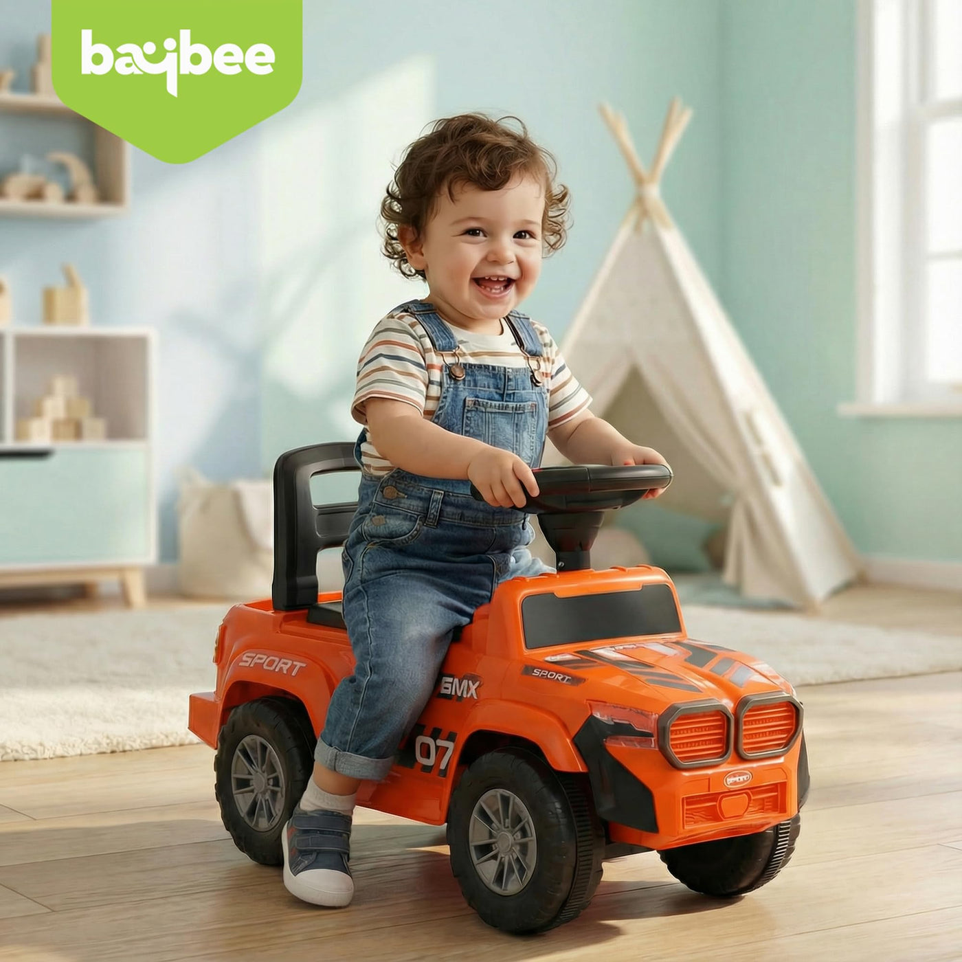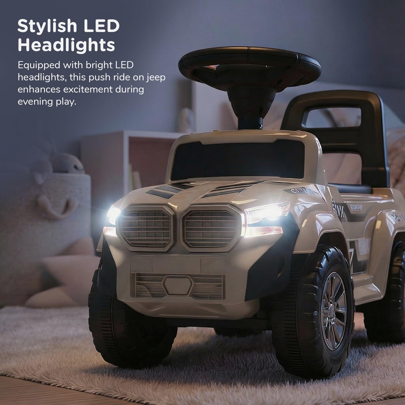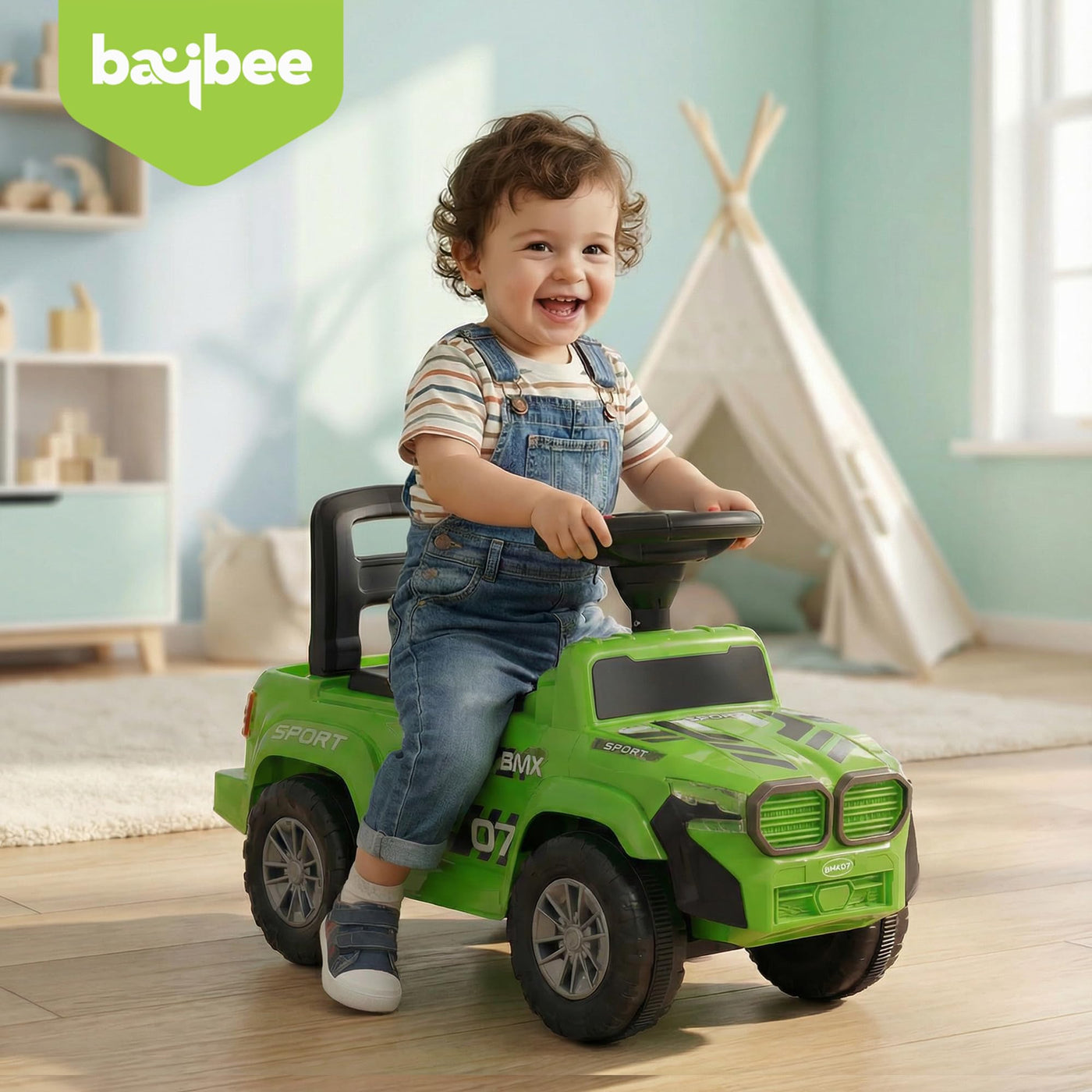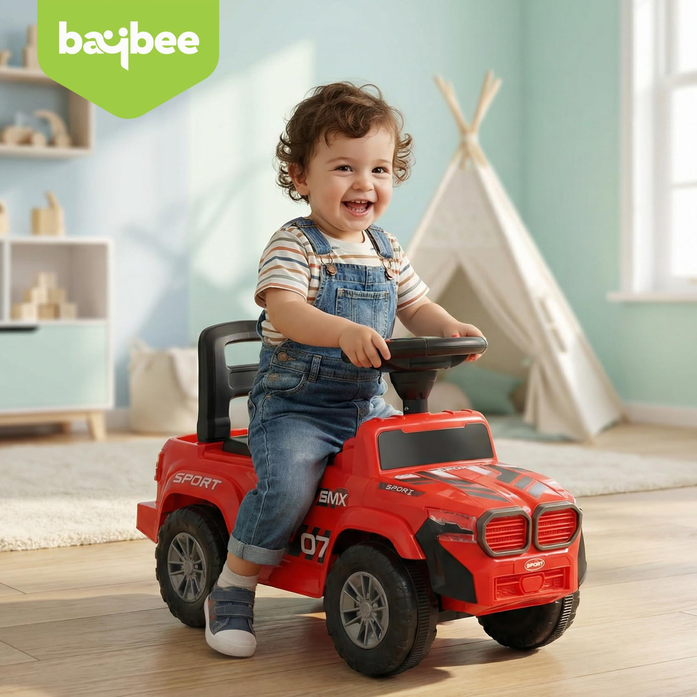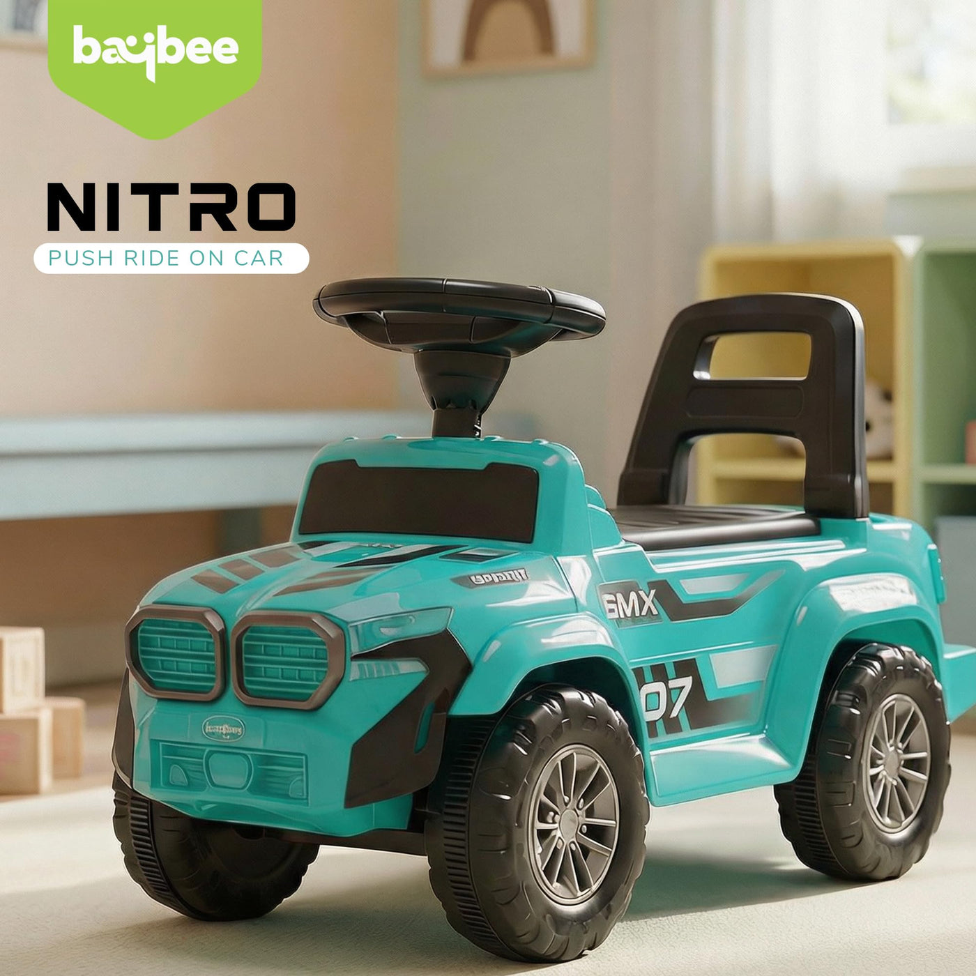 The Baybee Nitro is the perfect baby ride on car for kids, featuring bright LED headlights that enhance play during both day and night, making it ideal for both indoor and outdoor fun. Equipped with an interactive steering wheel, this kids car keeps your little one entertained with engaging music and sounds as they ride.