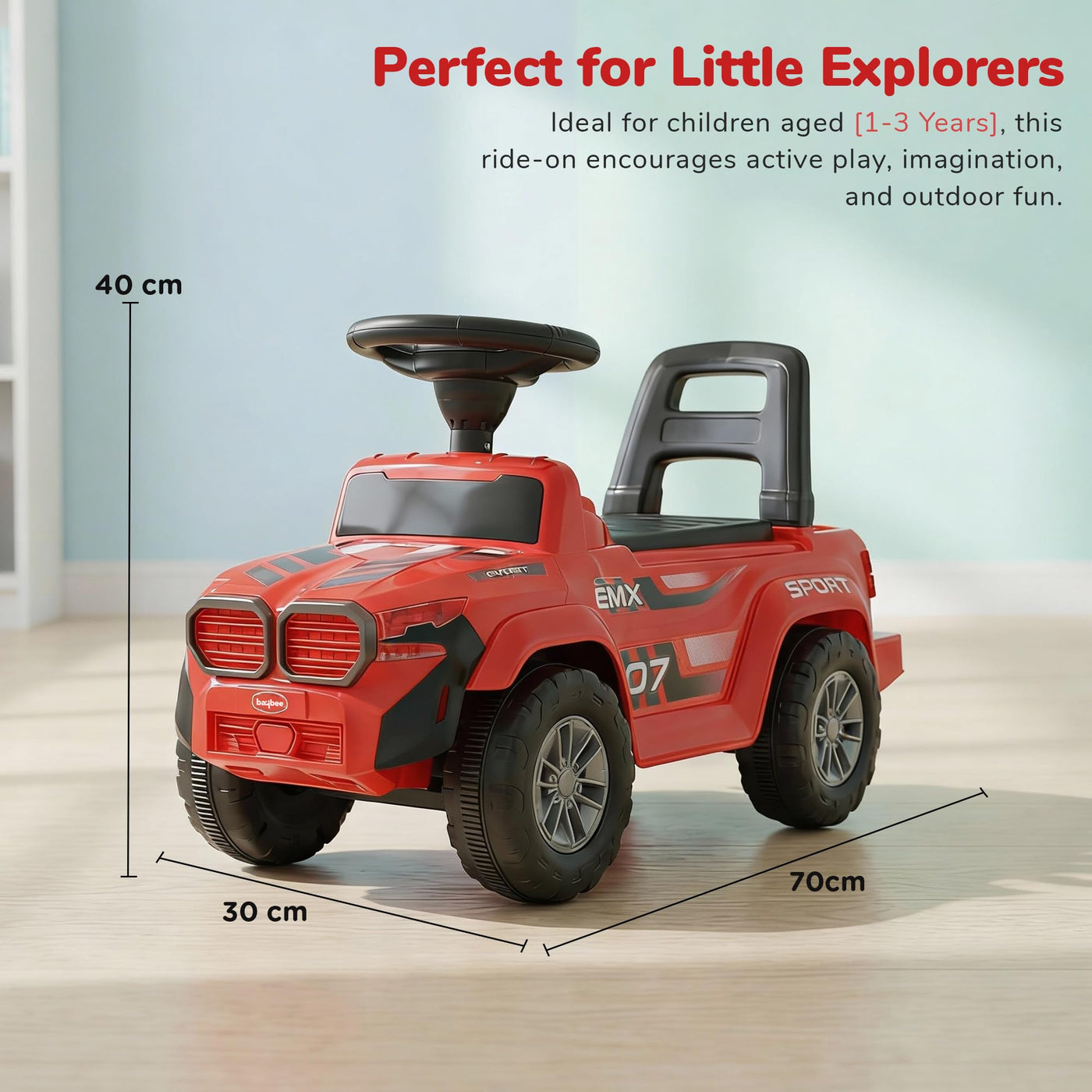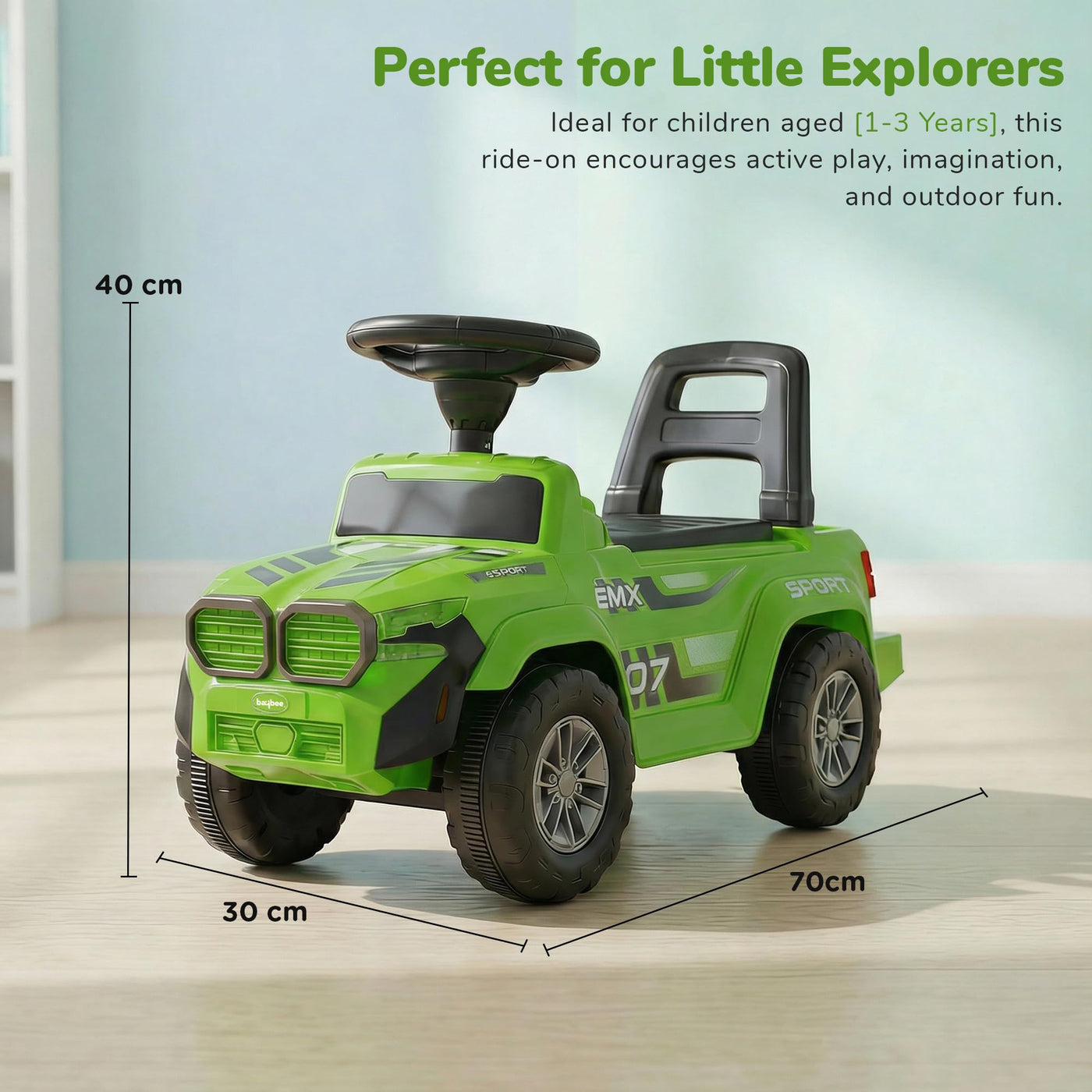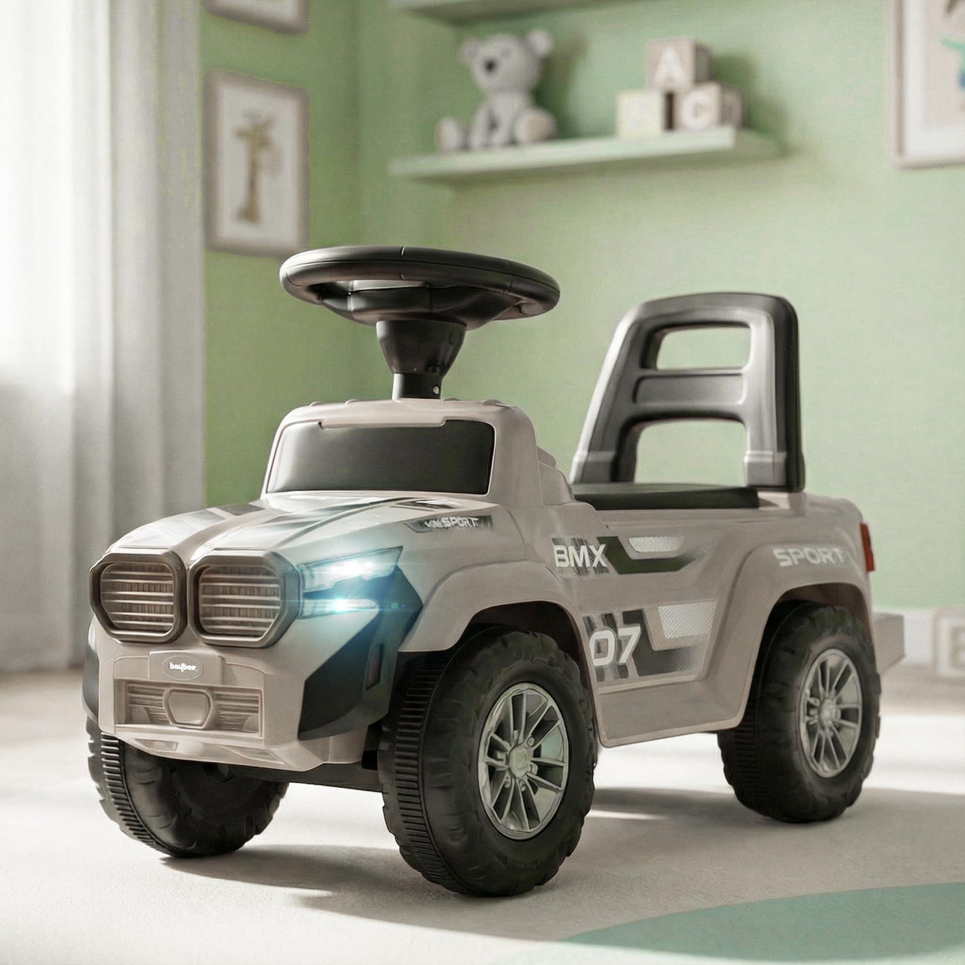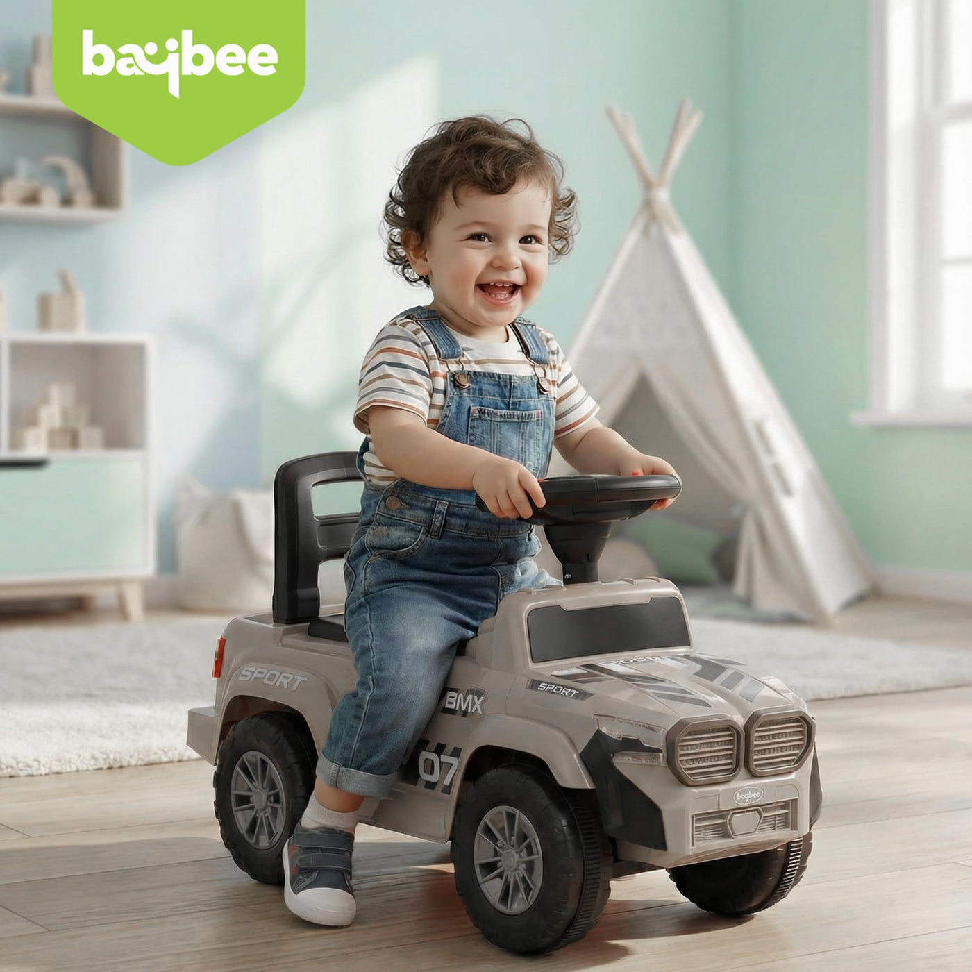 The Baybee Nitro is the perfect baby ride on car for kids, featuring bright LED headlights that enhance play during both day and night, making it ideal for both indoor and outdoor fun. Equipped with an interactive steering wheel, this kids car keeps your little one entertained with engaging music and sounds as they ride.