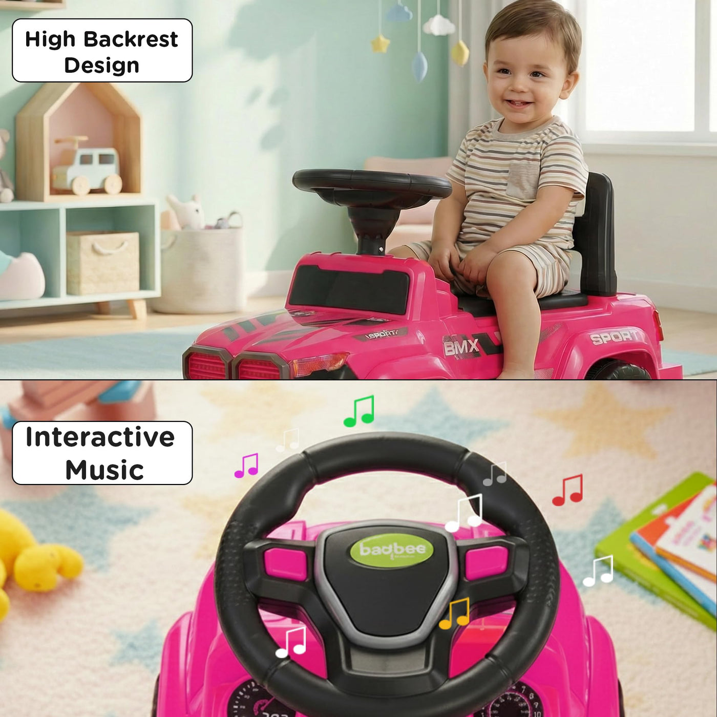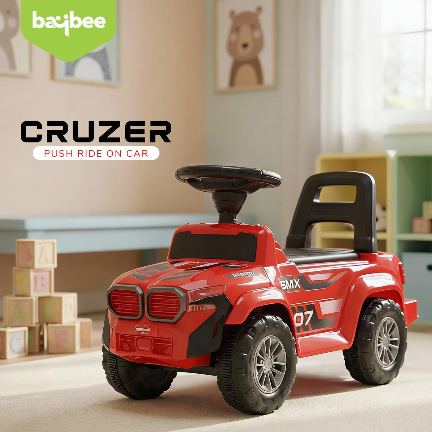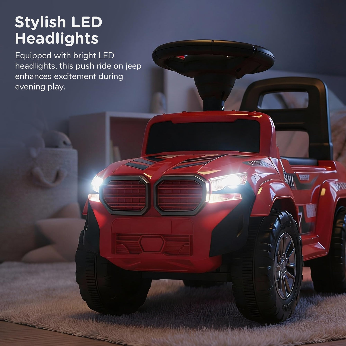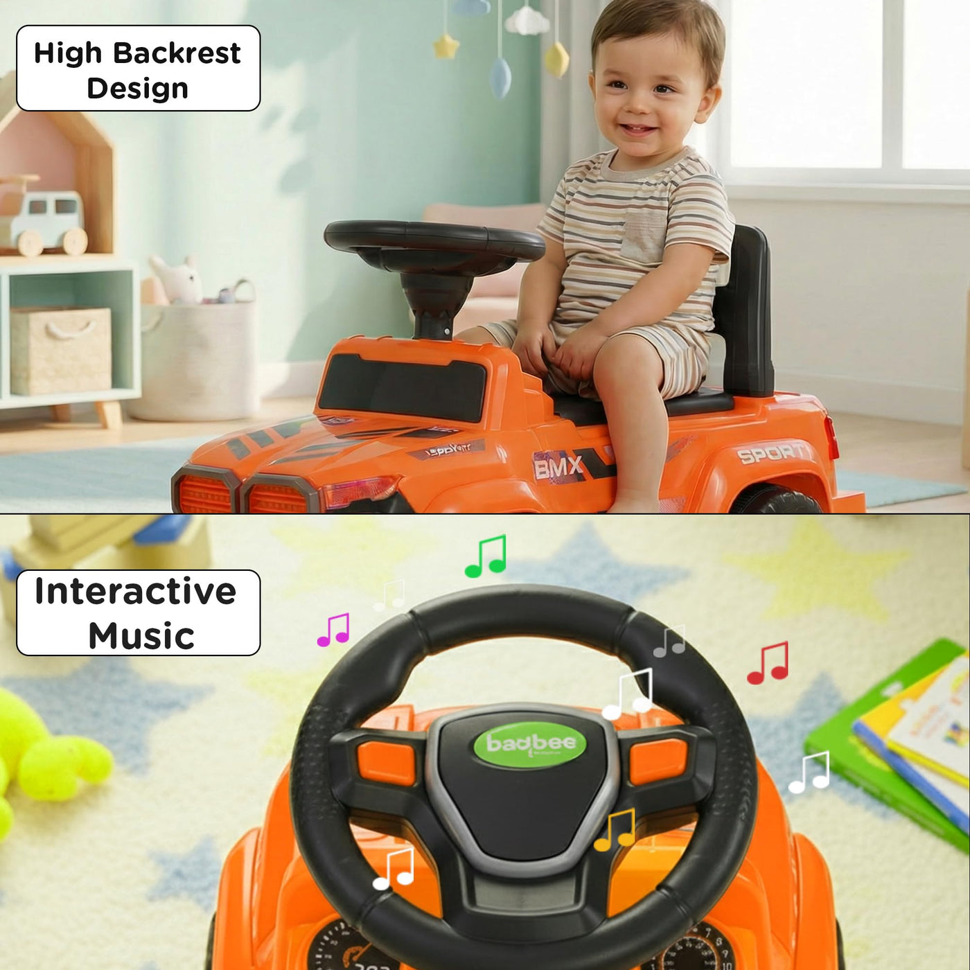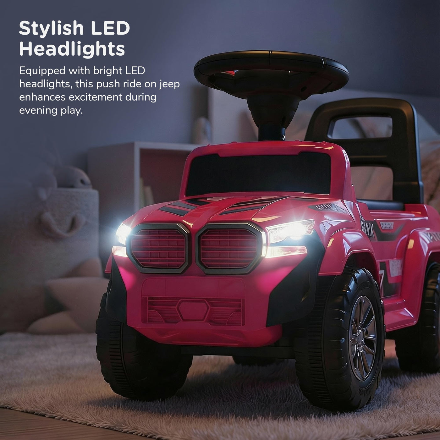 The Baybee Nitro is the perfect baby ride on car for kids, featuring bright LED headlights that enhance play during both day and night, making it ideal for both indoor and outdoor fun. Equipped with an interactive steering wheel, this kids car keeps your little one entertained with engaging music and sounds as they ride.