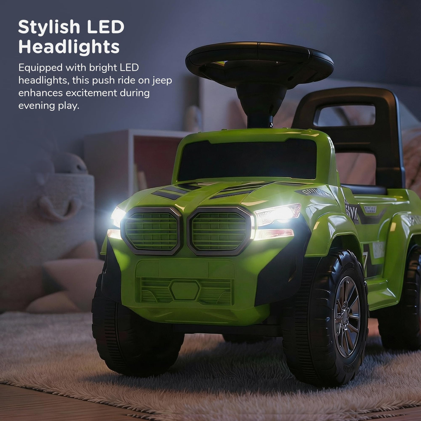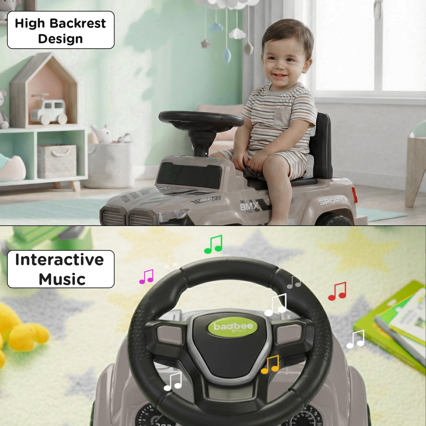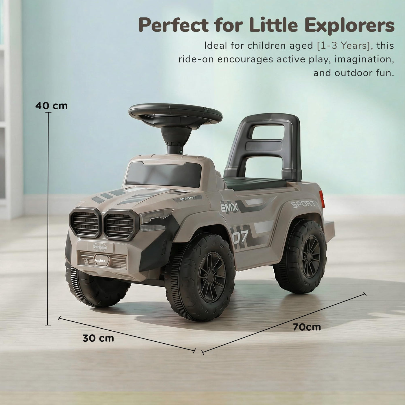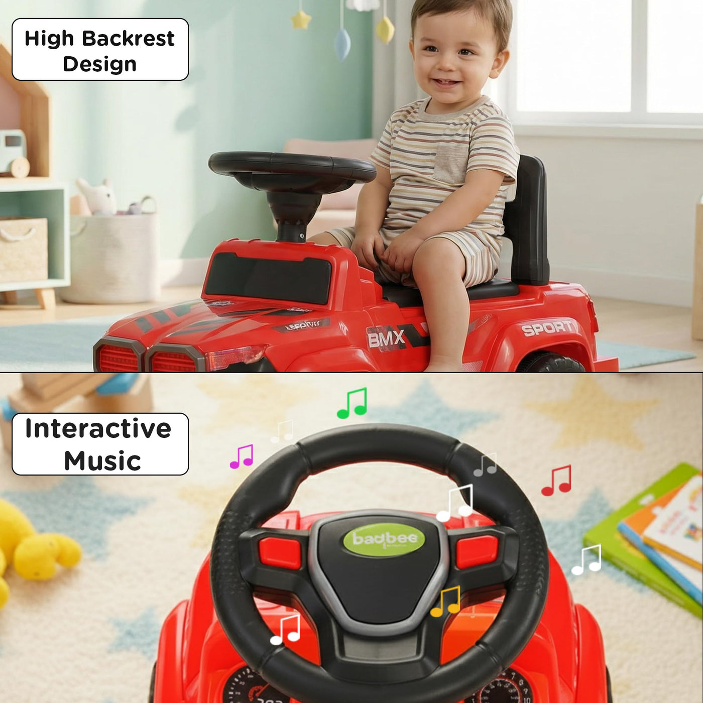 The Baybee Nitro is the perfect baby ride on car for kids, featuring bright LED headlights that enhance play during both day and night, making it ideal for both indoor and outdoor fun. Equipped with an interactive steering wheel, this kids car keeps your little one entertained with engaging music and sounds as they ride.