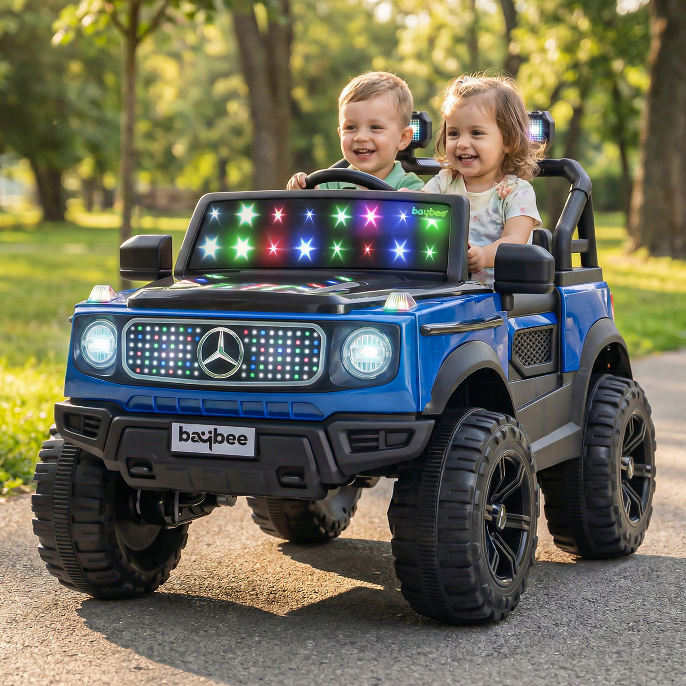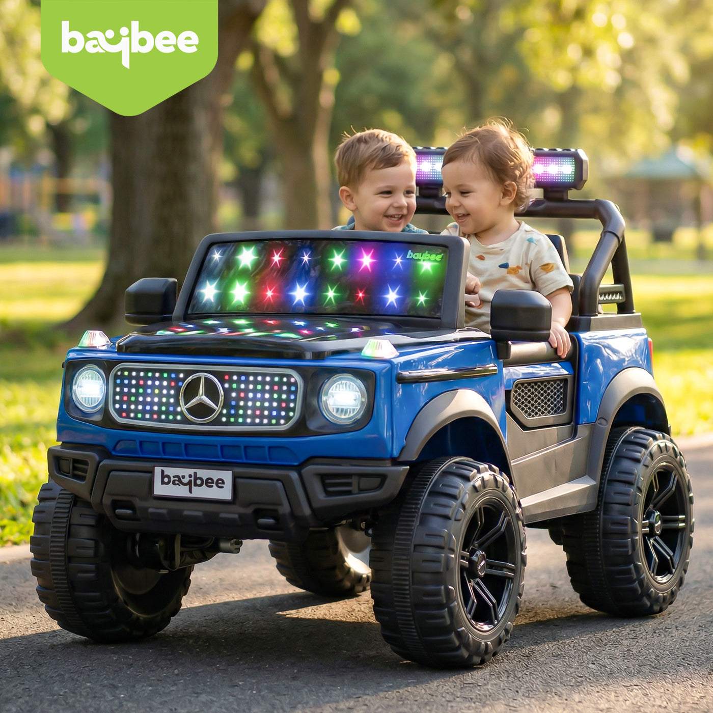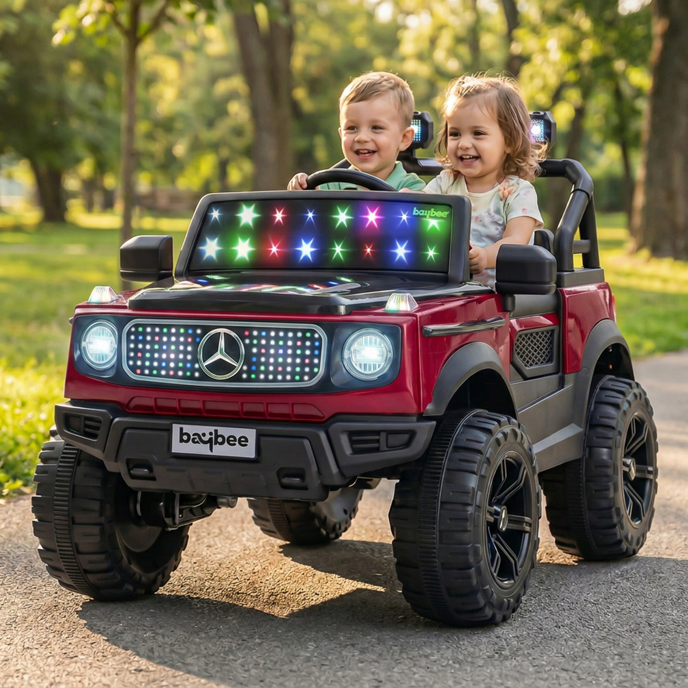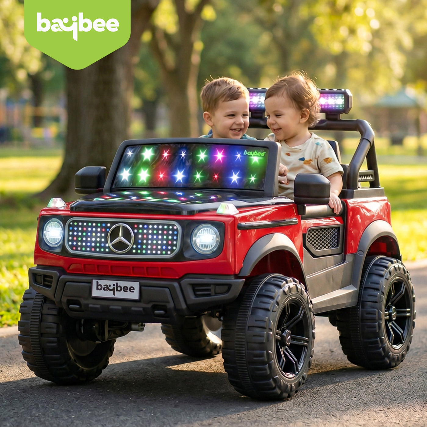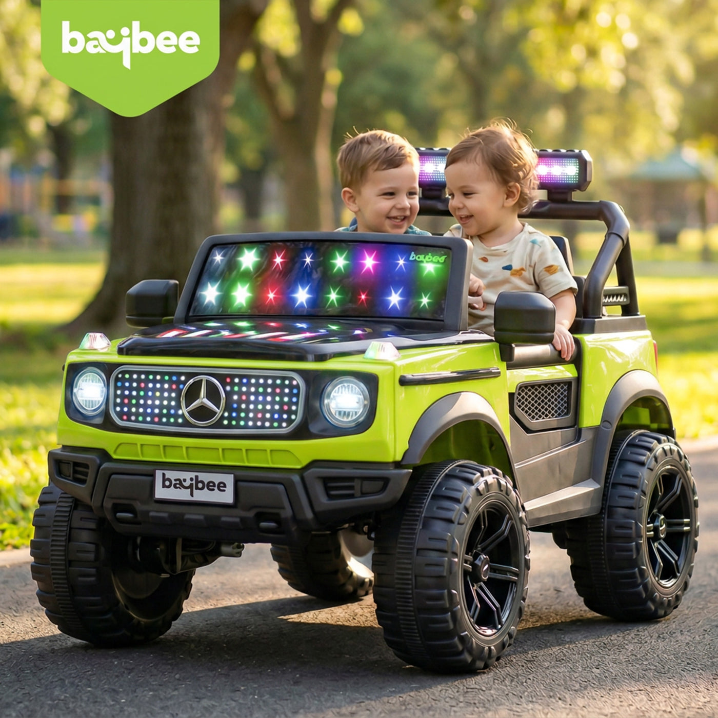 The Baybee Benzie electric jeep for kids offers an exciting and immersive driving experience with dual control modes, allowing both parents and kids to enjoy the fun. Parents can control the jeep using the 2.4G wireless remote, while kids have the opportunity to take the wheel themselves, promoting the development of essential hand-eye-foot coordination. This interactive driving feature ensures a safe and thrilling ride for children. Equipped with Swing Mode, a horn, RGB Windshield, LED headlights, Bluetooth, USB, and Aux connectivity, the Baybee Benzie provides endless entertainment for kids during each ride. The built-in music and stories enhance the immersive driving experience, making it both enjoyable and fun. Safety is a priority with the inclusion of a 4x4 motor, which delivers extra power for off-road adventures while ensuring smooth and controlled driving. The bright LED headlights provide improved visibility, and the smooth steering wheel ensures easy handling during turns. Designed with durable wear-resistant seats and rugged wheels, the electric car is built to withstand various terrains, offering a smooth ride and making it perfect for outdoor adventures. Kids can enjoy endless hours of fun as they drive through their neighborhood or explore different terrains. Powered by a 12V 4.5AH battery, the Baybee Benzie electric jeep offers up to 40 minutes of continuous play, ensuring long-lasting enjoyment for children. Whether it's a fun ride around the neighborhood or an off-road exploration, this baby electric car guarantees extended playtime. Additionally, the Baybee Benzie comes with an easy assembly process, allowing parents to quickly set it up and let their child enjoy their new electric jeep in no time. The included manual provides simple instructions for a hassle-free setup, ensuring that the fun begins immediately. With all these fantastic features, the Baybee Benzie is the perfect choice for kids who love adventure, combining safety, durability, and entertainment in one exciting package.