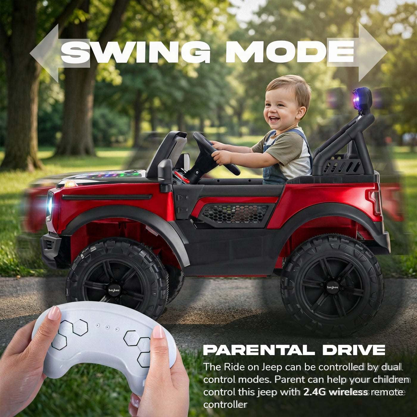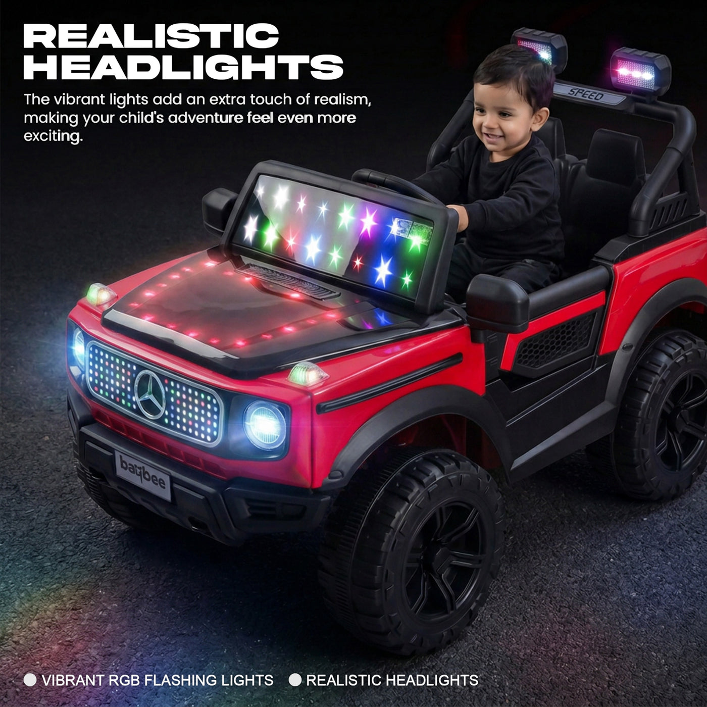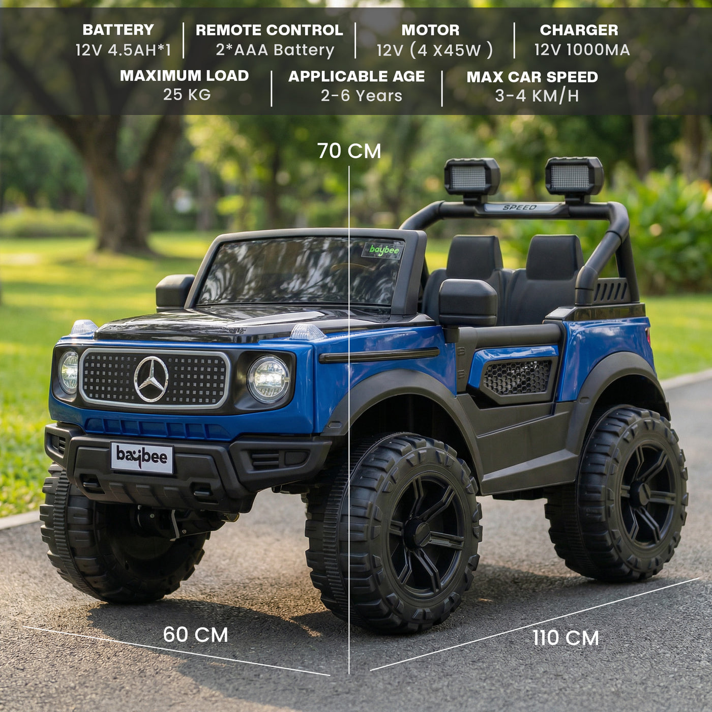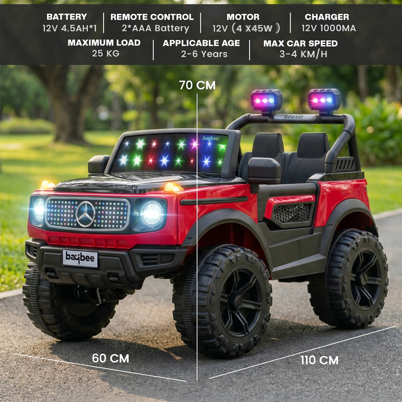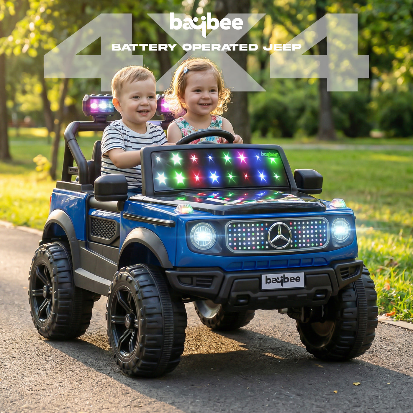 The Baybee Benzie electric jeep for kids offers an exciting and immersive driving experience with dual control modes, allowing both parents and kids to enjoy the fun. Parents can control the jeep using the 2.4G wireless remote, while kids have the opportunity to take the wheel themselves, promoting the development of essential hand-eye-foot coordination. This interactive driving feature ensures a safe and thrilling ride for children. Equipped with Swing Mode, a horn, RGB Windshield, LED headlights, Bluetooth, USB, and Aux connectivity, the Baybee Benzie provides endless entertainment for kids during each ride. The built-in music and stories enhance the immersive driving experience, making it both enjoyable and fun. Safety is a priority with the inclusion of a 4x4 motor, which delivers extra power for off-road adventures while ensuring smooth and controlled driving. The bright LED headlights provide improved visibility, and the smooth steering wheel ensures easy handling during turns. Designed with durable wear-resistant seats and rugged wheels, the electric car is built to withstand various terrains, offering a smooth ride and making it perfect for outdoor adventures. Kids can enjoy endless hours of fun as they drive through their neighborhood or explore different terrains. Powered by a 12V 4.5AH battery, the Baybee Benzie electric jeep offers up to 40 minutes of continuous play, ensuring long-lasting enjoyment for children. Whether it's a fun ride around the neighborhood or an off-road exploration, this baby electric car guarantees extended playtime. Additionally, the Baybee Benzie comes with an easy assembly process, allowing parents to quickly set it up and let their child enjoy their new electric jeep in no time. The included manual provides simple instructions for a hassle-free setup, ensuring that the fun begins immediately. With all these fantastic features, the Baybee Benzie is the perfect choice for kids who love adventure, combining safety, durability, and entertainment in one exciting package.