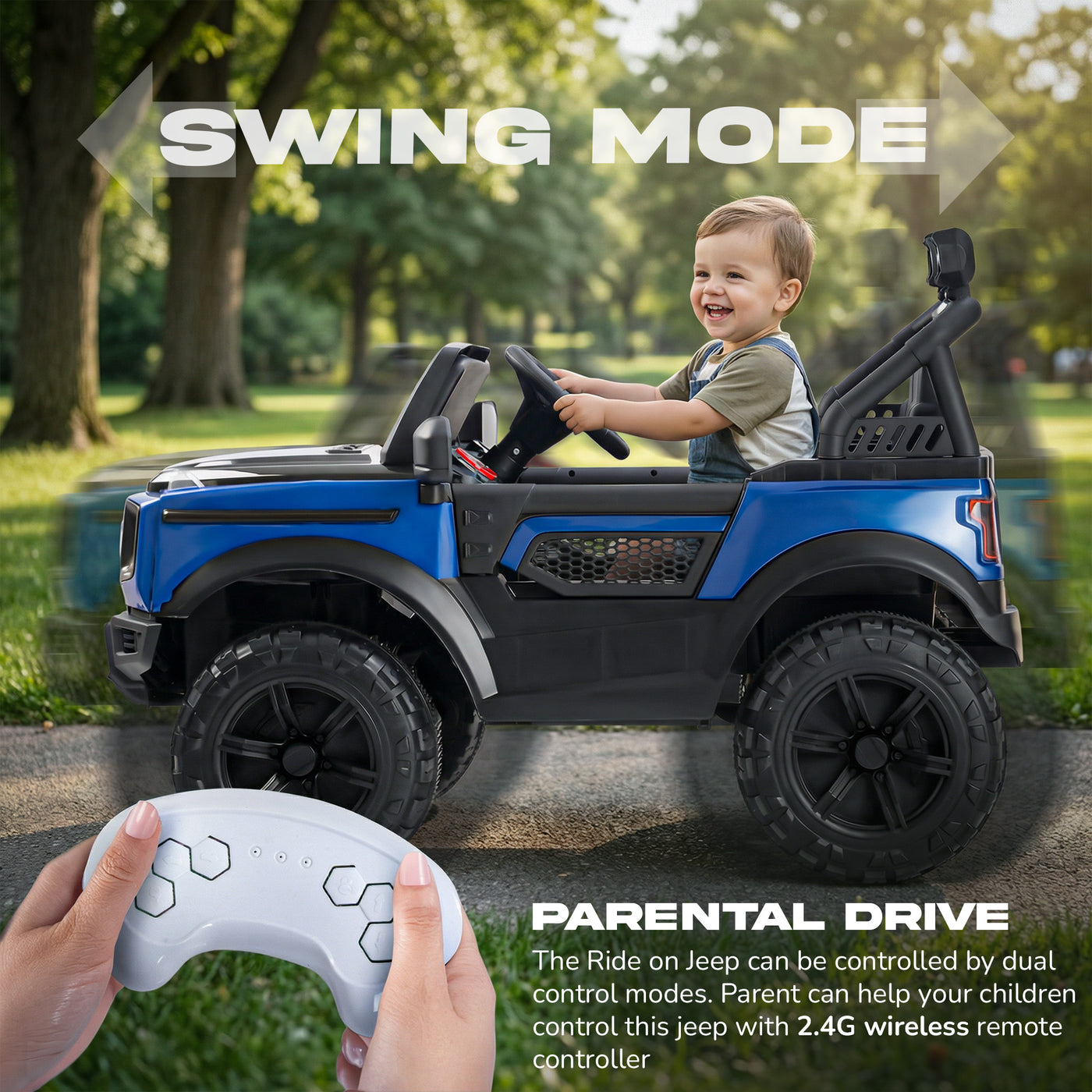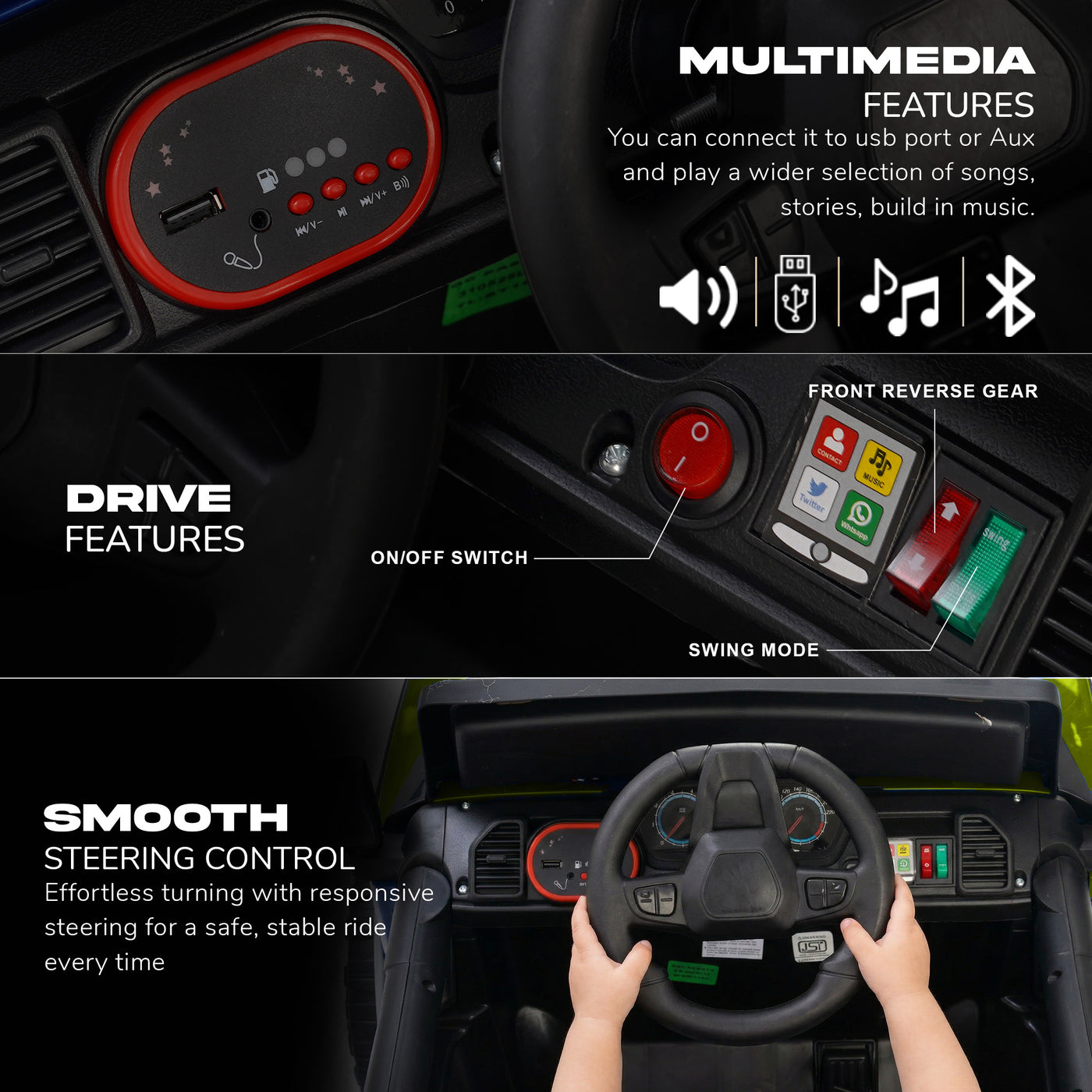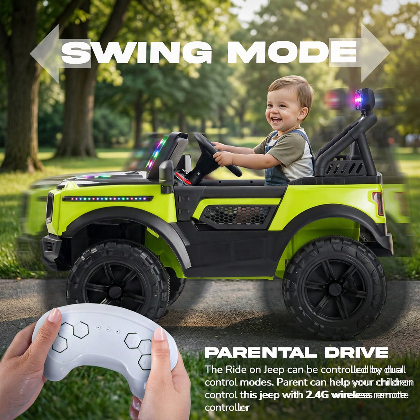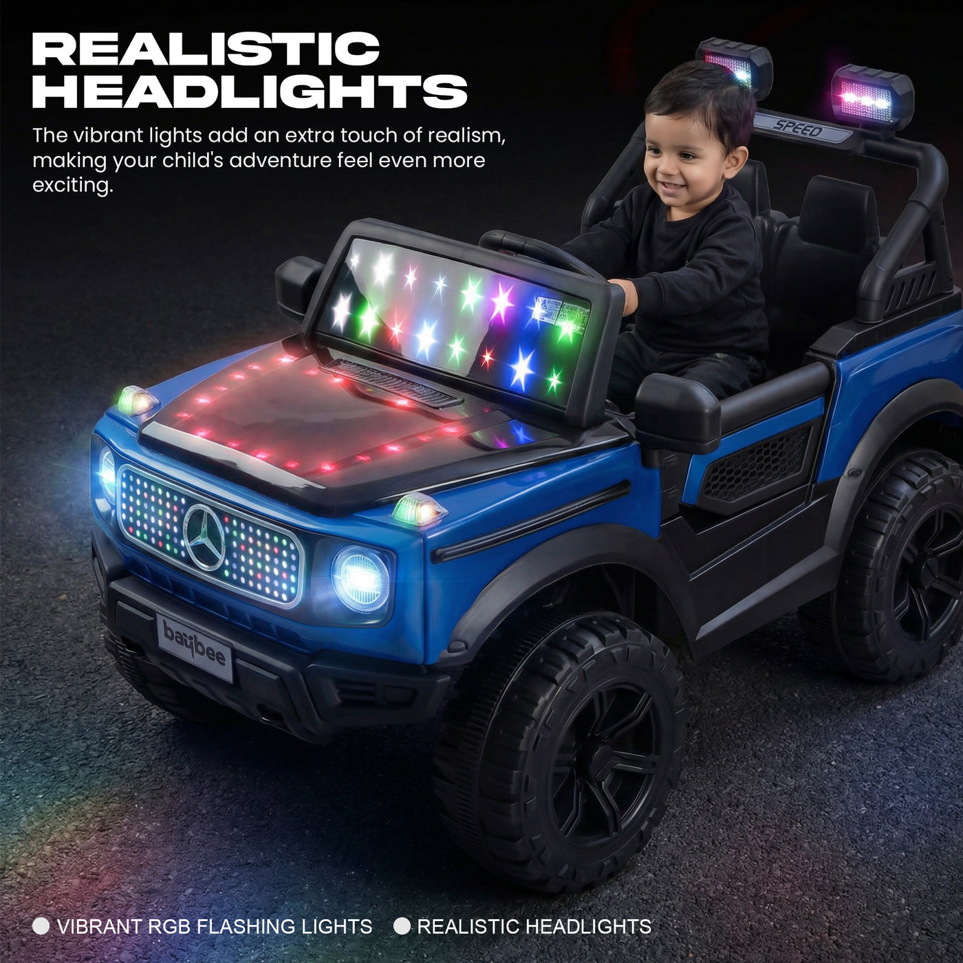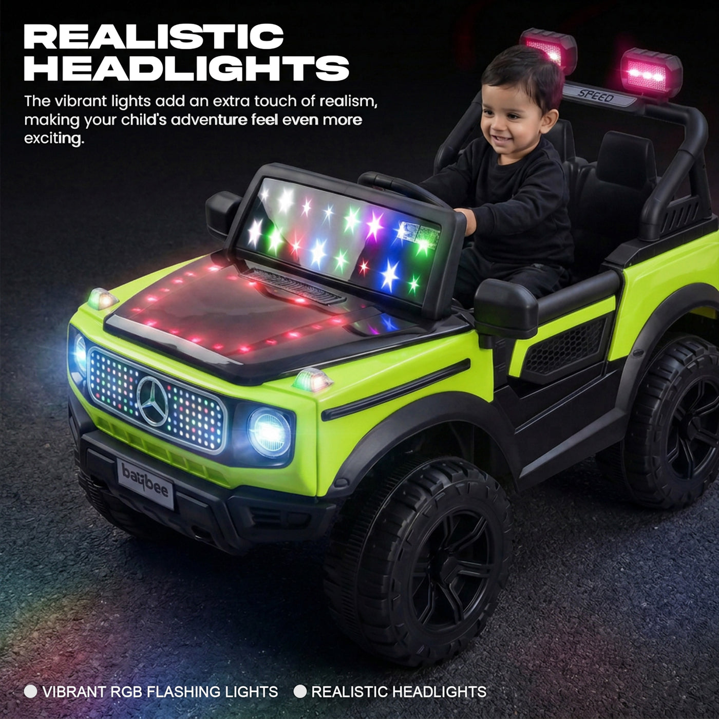 The Baybee Benzie electric jeep for kids offers an exciting and immersive driving experience with dual control modes, allowing both parents and kids to enjoy the fun. Parents can control the jeep using the 2.4G wireless remote, while kids have the opportunity to take the wheel themselves, promoting the development of essential hand-eye-foot coordination. This interactive driving feature ensures a safe and thrilling ride for children. Equipped with Swing Mode, a horn, RGB Windshield, LED headlights, Bluetooth, USB, and Aux connectivity, the Baybee Benzie provides endless entertainment for kids during each ride. The built-in music and stories enhance the immersive driving experience, making it both enjoyable and fun. Safety is a priority with the inclusion of a 4x4 motor, which delivers extra power for off-road adventures while ensuring smooth and controlled driving. The bright LED headlights provide improved visibility, and the smooth steering wheel ensures easy handling during turns. Designed with durable wear-resistant seats and rugged wheels, the electric car is built to withstand various terrains, offering a smooth ride and making it perfect for outdoor adventures. Kids can enjoy endless hours of fun as they drive through their neighborhood or explore different terrains. Powered by a 12V 4.5AH battery, the Baybee Benzie electric jeep offers up to 40 minutes of continuous play, ensuring long-lasting enjoyment for children. Whether it's a fun ride around the neighborhood or an off-road exploration, this baby electric car guarantees extended playtime. Additionally, the Baybee Benzie comes with an easy assembly process, allowing parents to quickly set it up and let their child enjoy their new electric jeep in no time. The included manual provides simple instructions for a hassle-free setup, ensuring that the fun begins immediately. With all these fantastic features, the Baybee Benzie is the perfect choice for kids who love adventure, combining safety, durability, and entertainment in one exciting package.