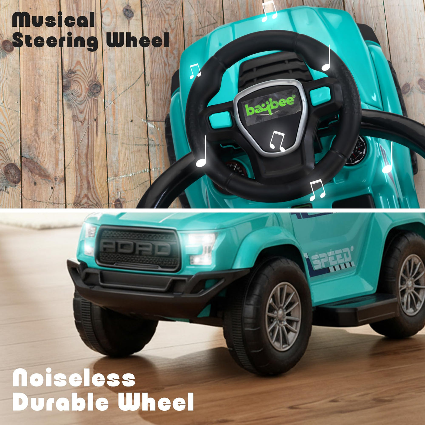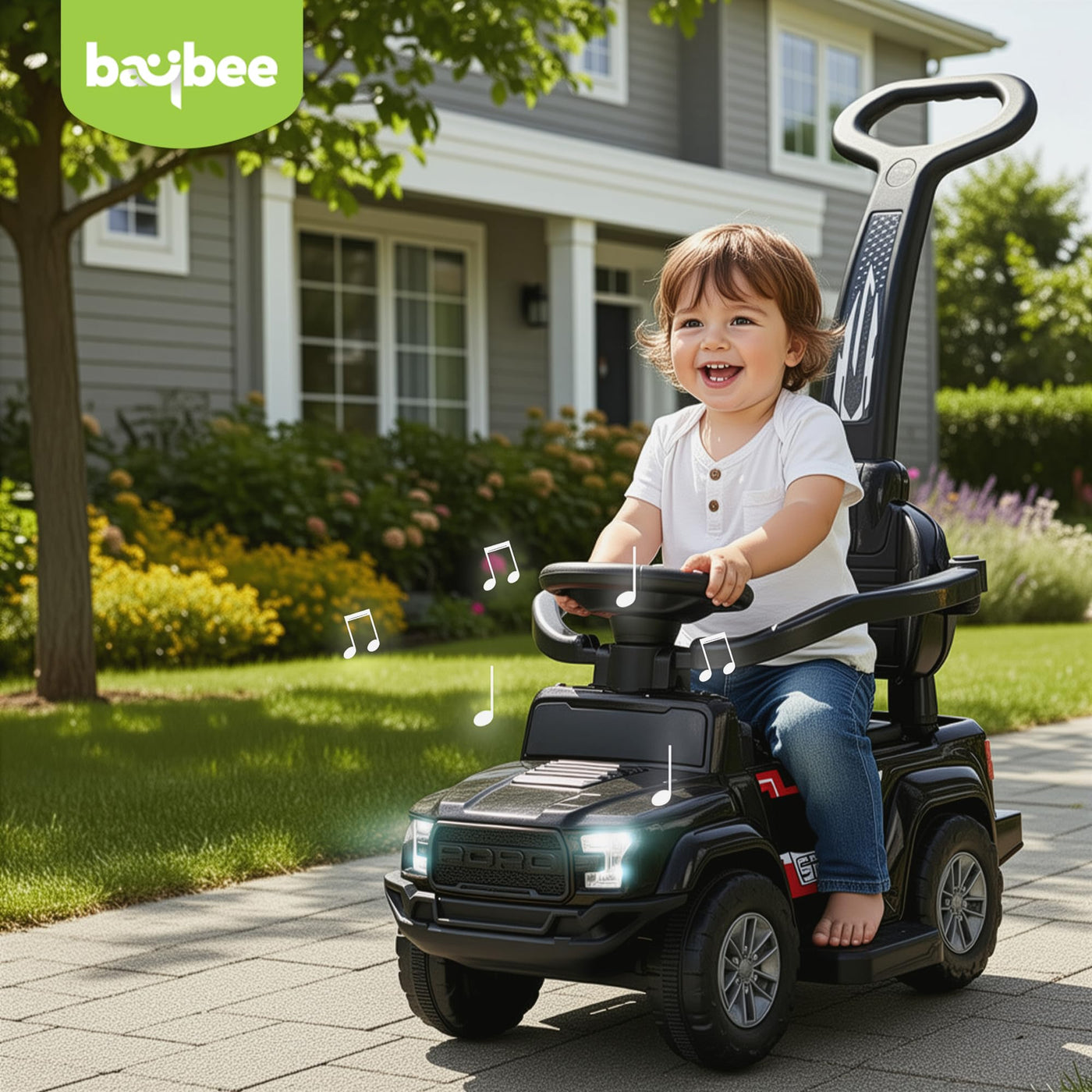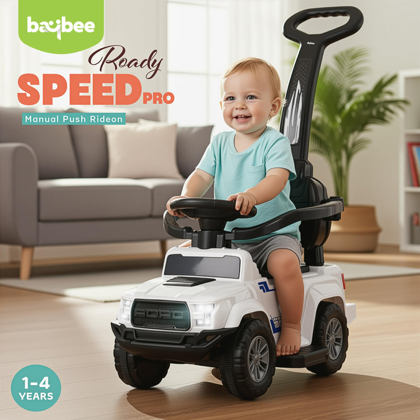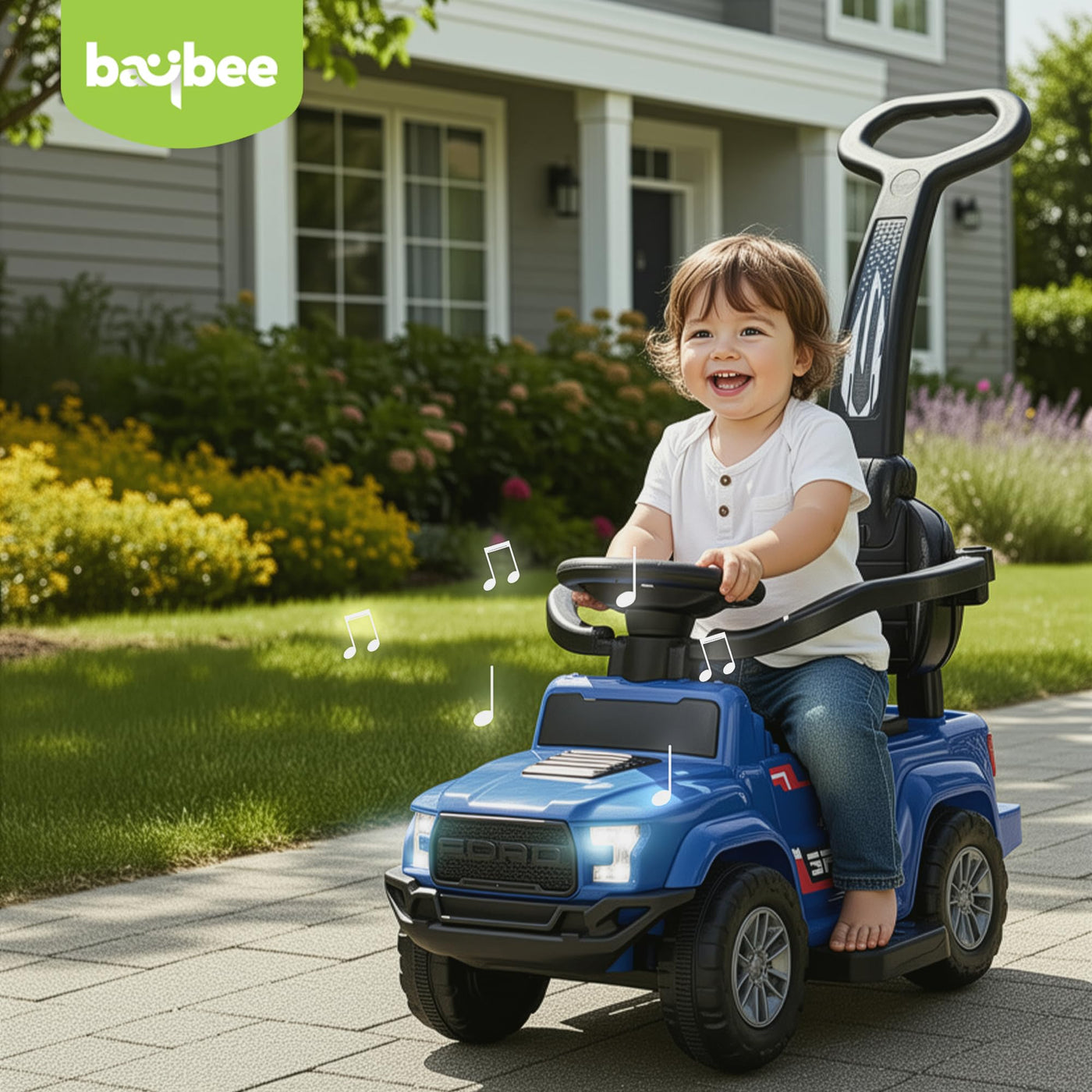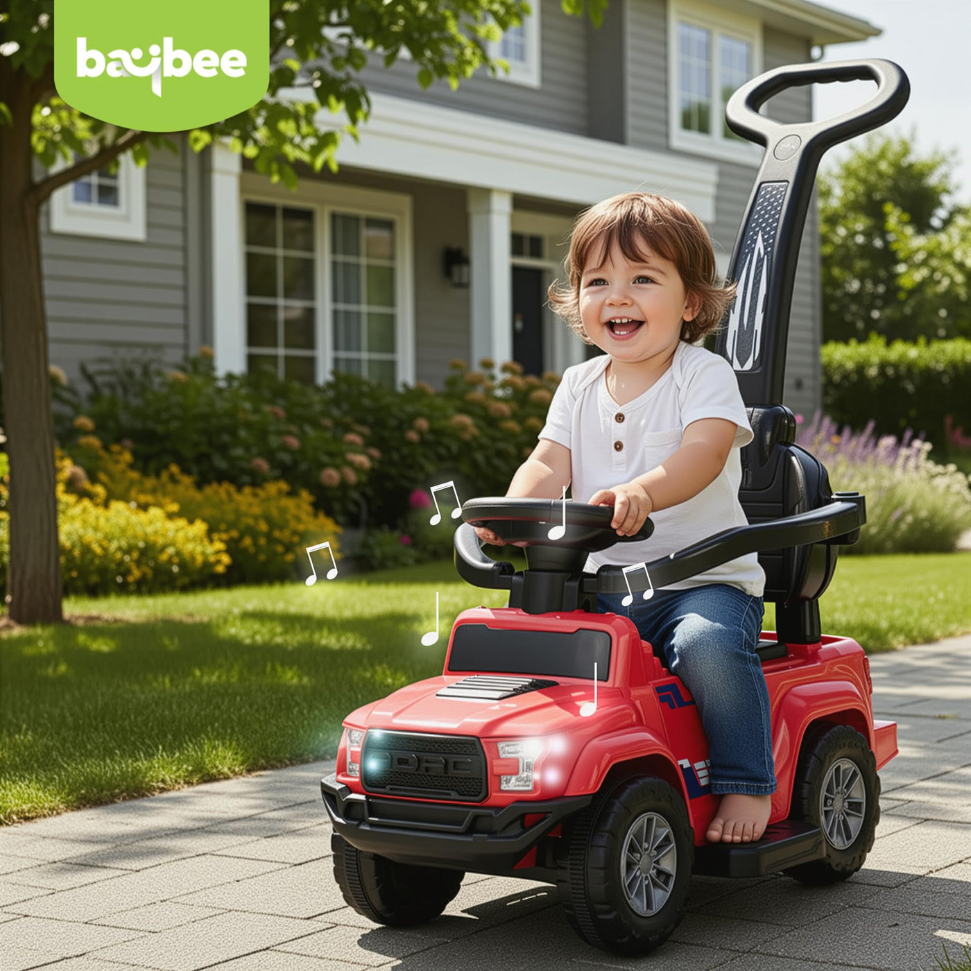 The Baybee Roady Pro Ride-On Baby Car is designed to offer both fun and safety for toddlers aged 1–3 years. With built-in music and LED lights, it keeps little ones entertained while the comfortable backrest and sturdy design ensure a secure and enjoyable ride. Crafted from high-quality, child-friendly materials, this push ride-on Jeep is equipped with durable wheels and an anti-rollover design, providing stability and peace of mind for parents.