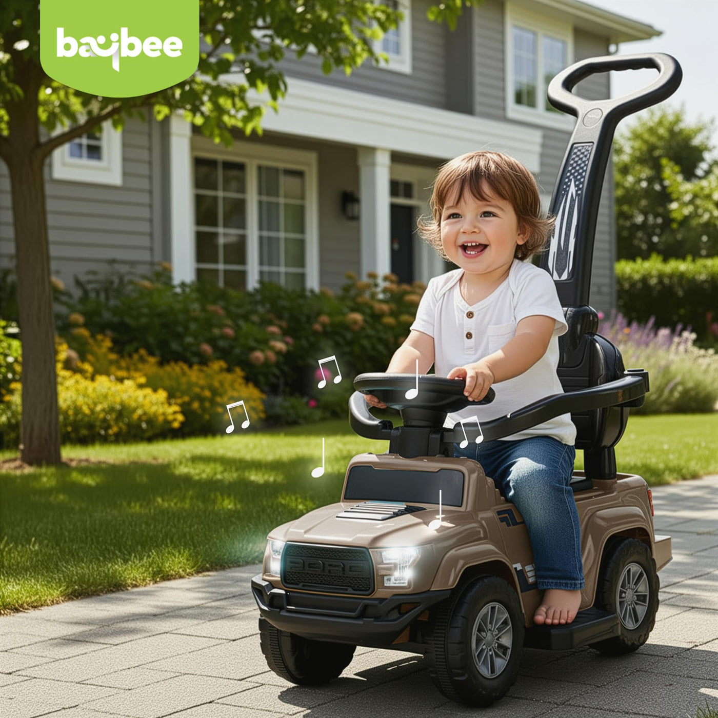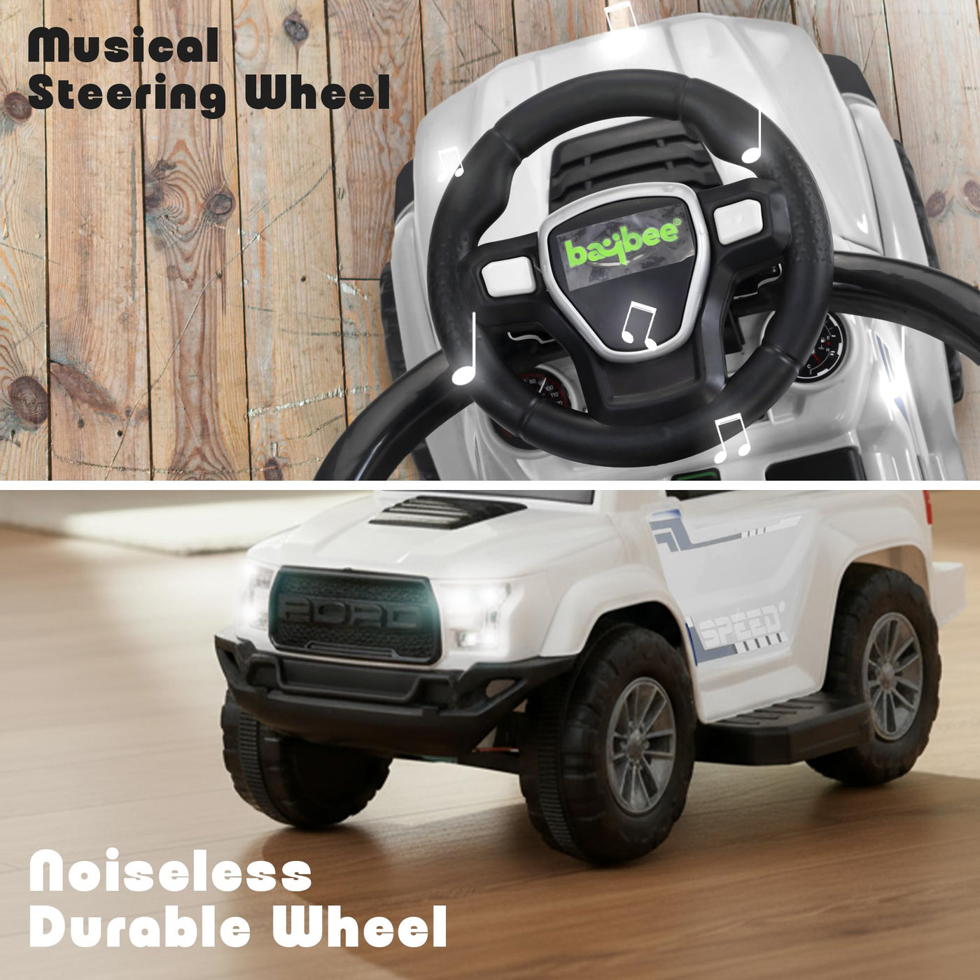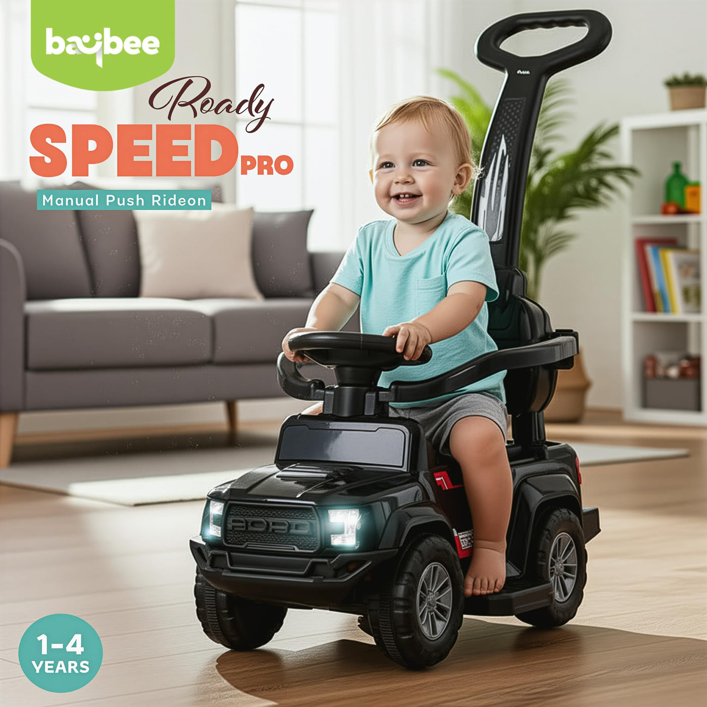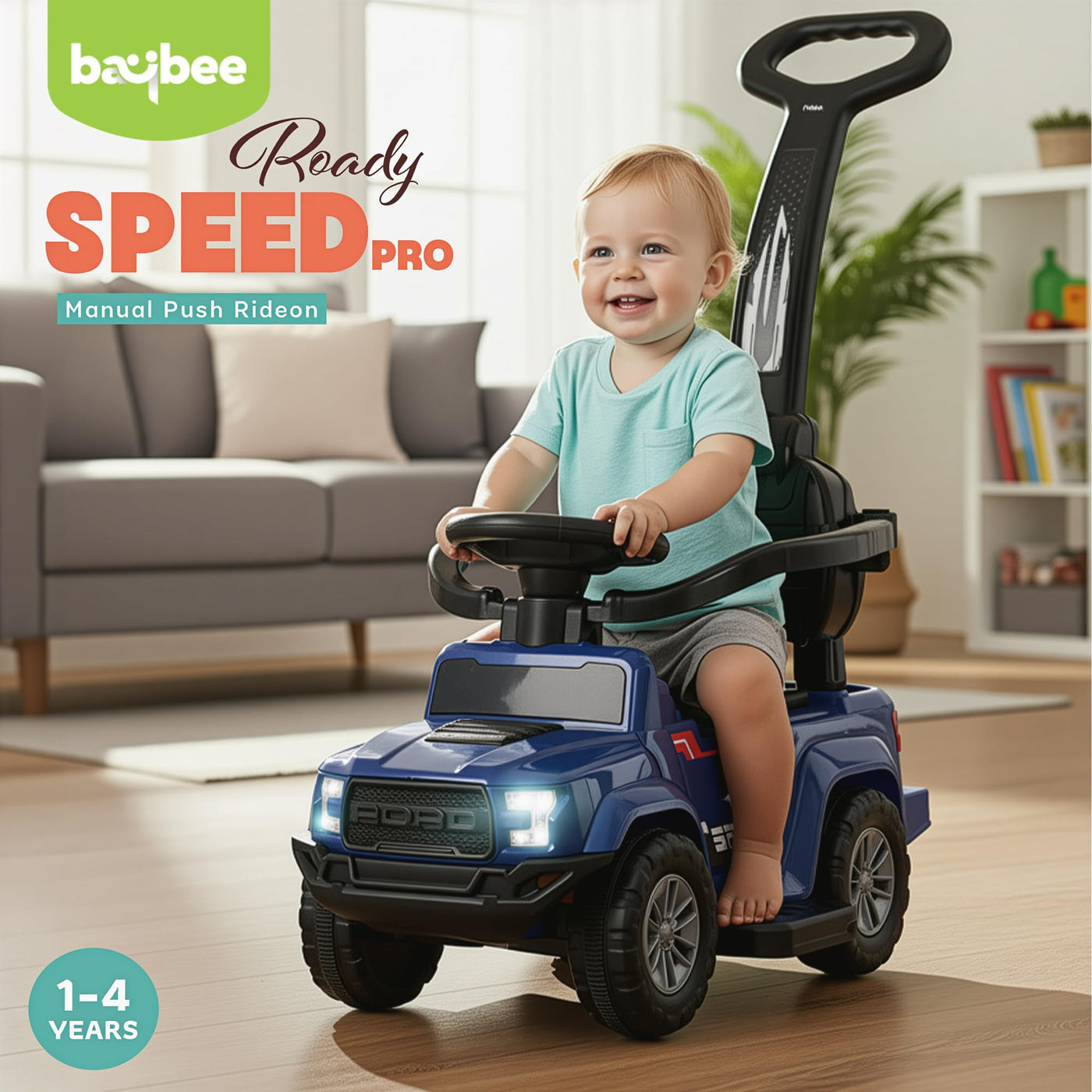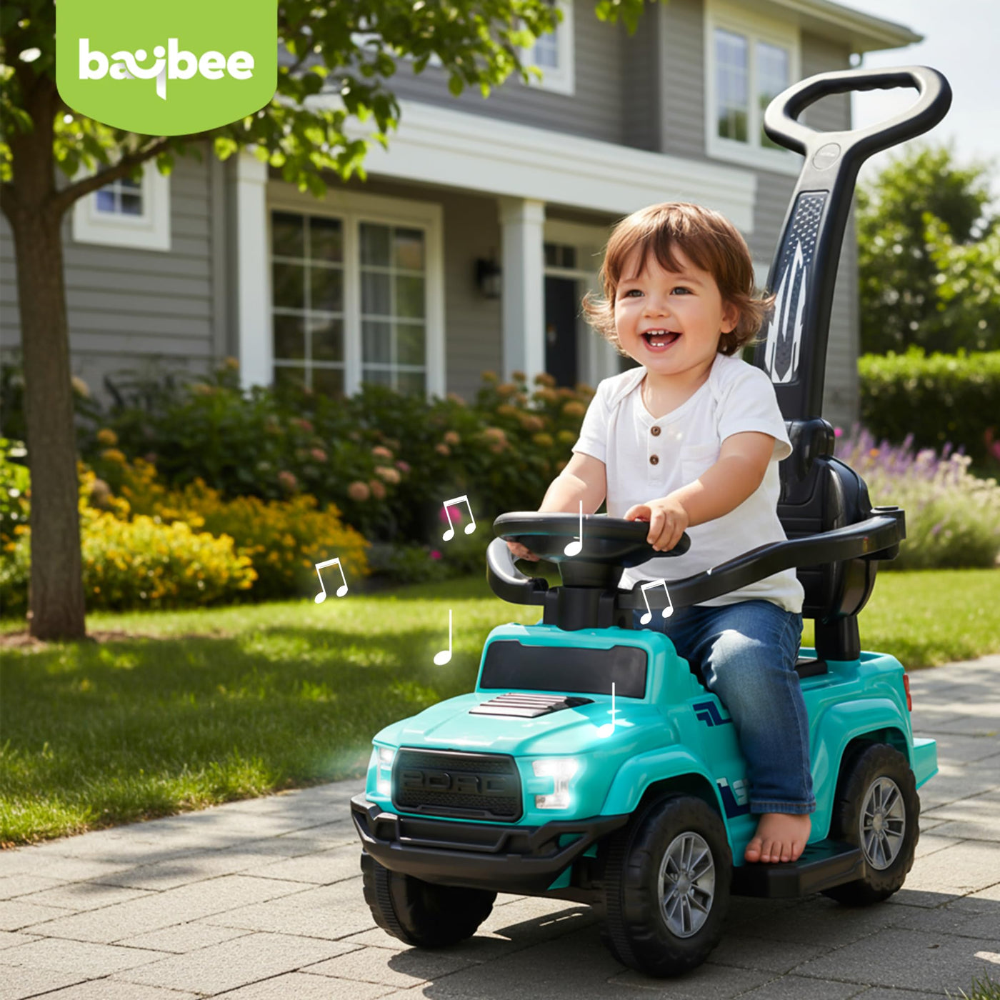 The Baybee Roady Pro Ride-On Baby Car is designed to offer both fun and safety for toddlers aged 1–3 years. With built-in music and LED lights, it keeps little ones entertained while the comfortable backrest and sturdy design ensure a secure and enjoyable ride. Crafted from high-quality, child-friendly materials, this push ride-on Jeep is equipped with durable wheels and an anti-rollover design, providing stability and peace of mind for parents.