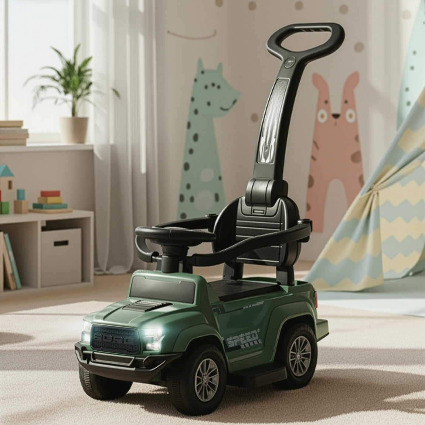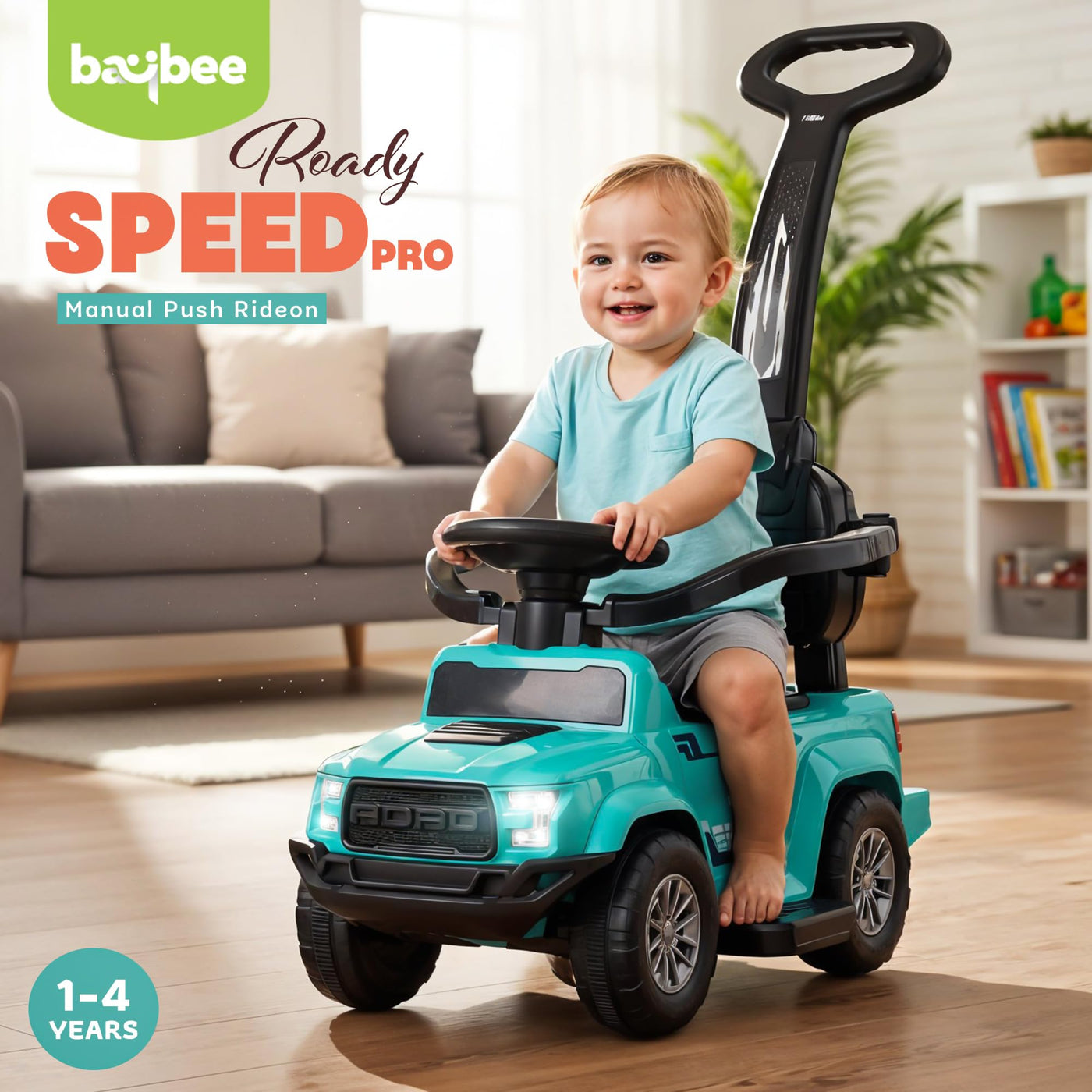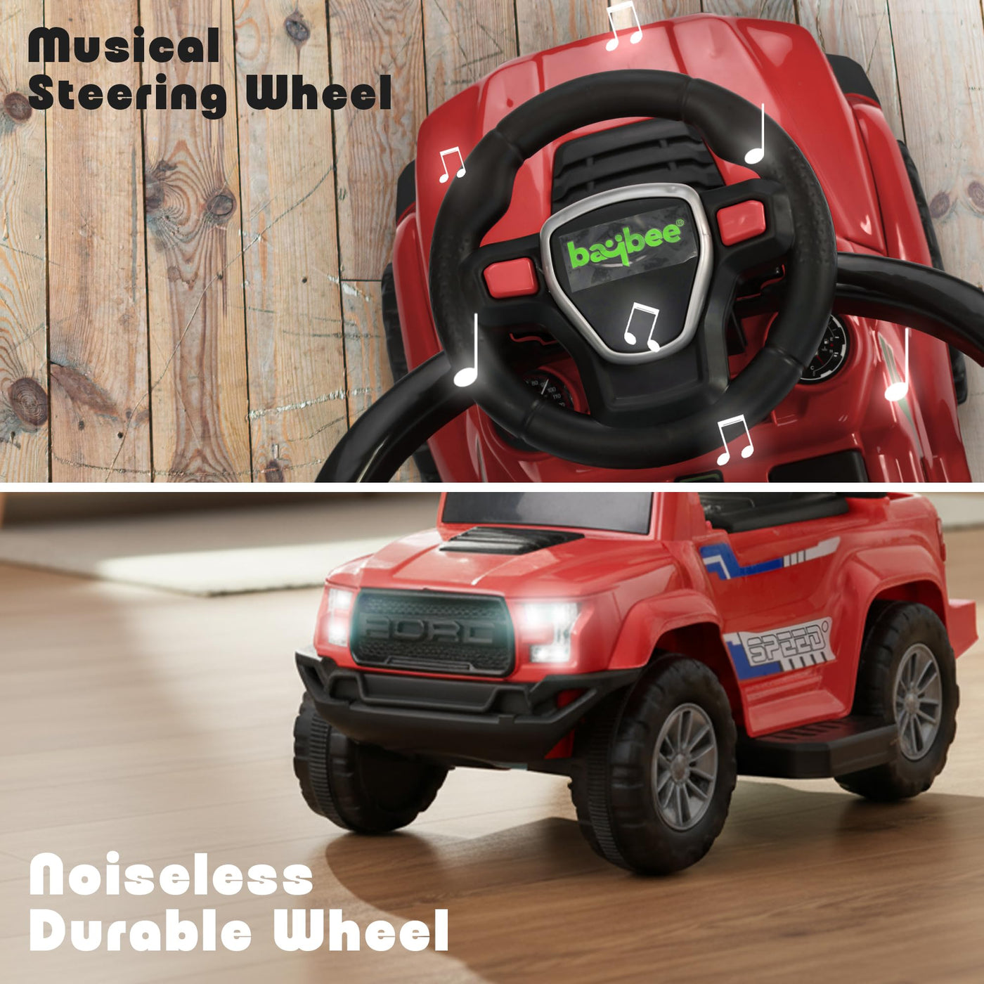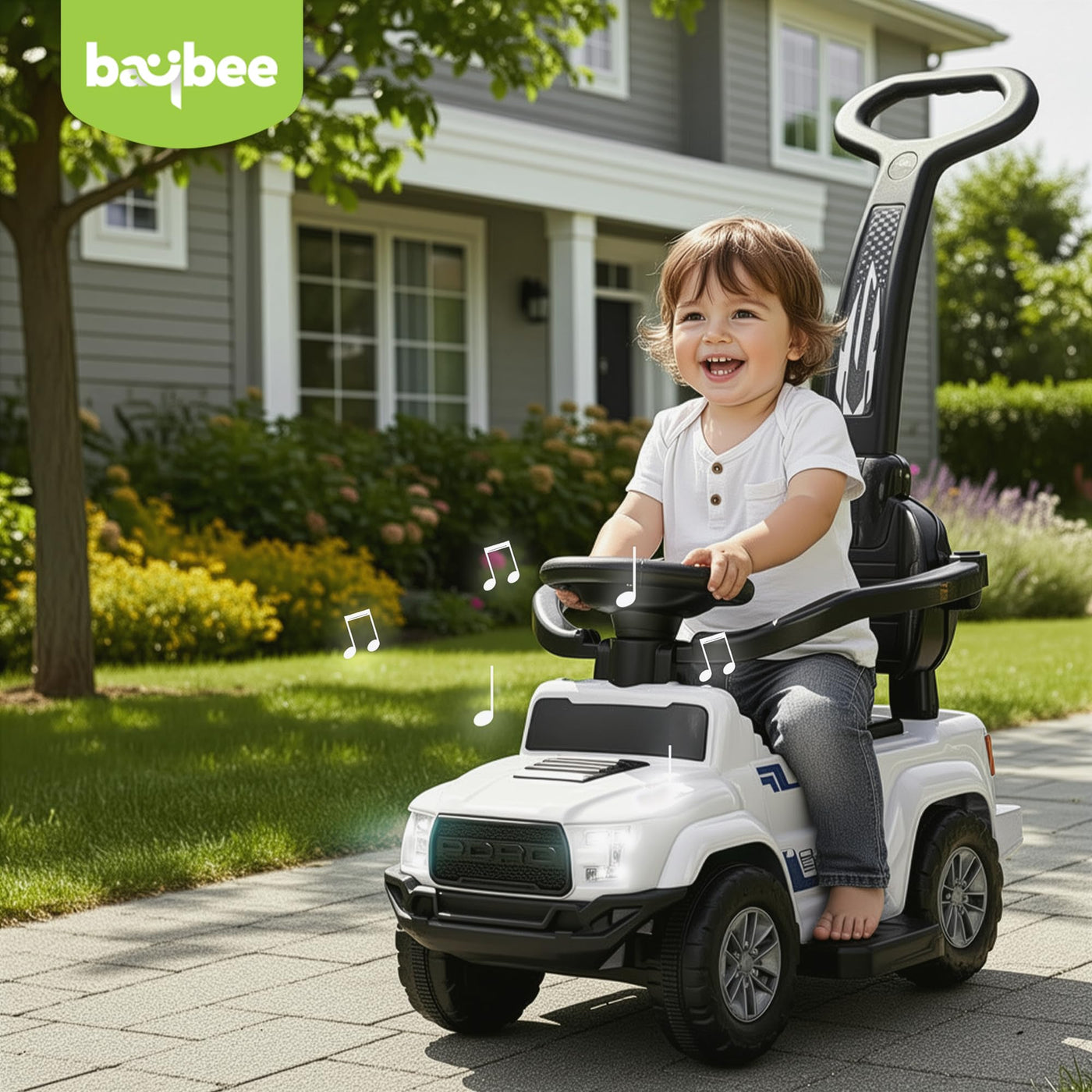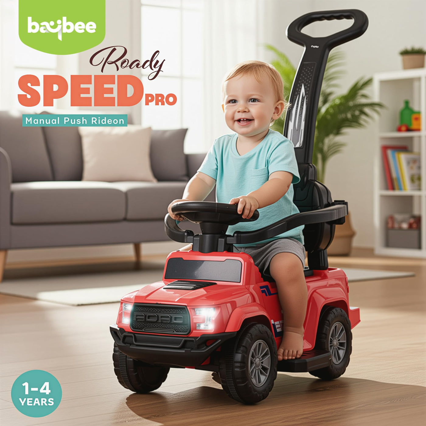 The Baybee Roady Pro Ride-On Baby Car is designed to offer both fun and safety for toddlers aged 1–3 years. With built-in music and LED lights, it keeps little ones entertained while the comfortable backrest and sturdy design ensure a secure and enjoyable ride. Crafted from high-quality, child-friendly materials, this push ride-on Jeep is equipped with durable wheels and an anti-rollover design, providing stability and peace of mind for parents.