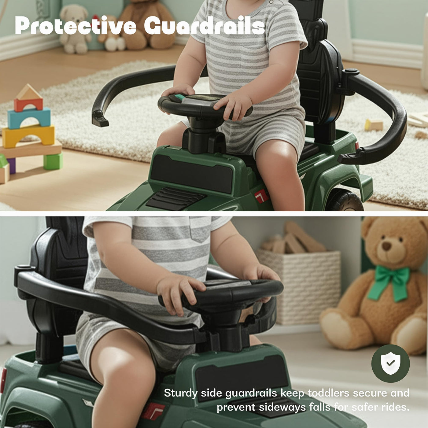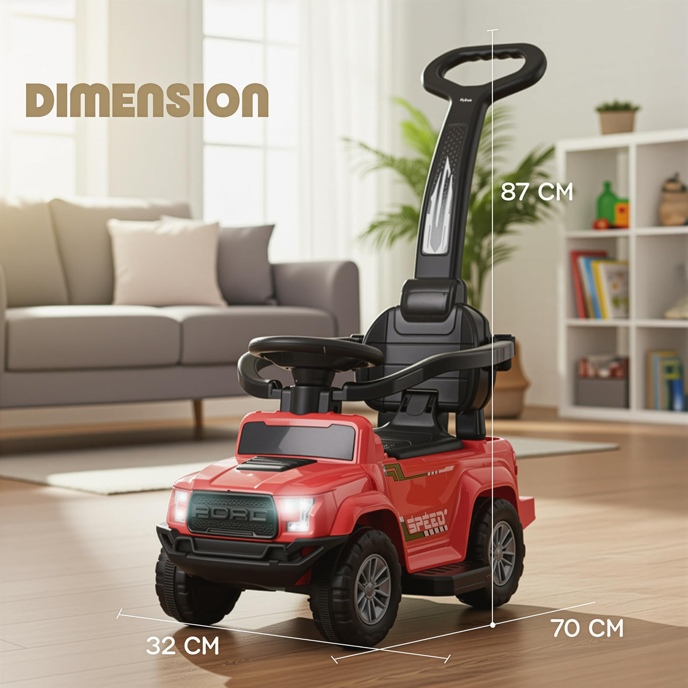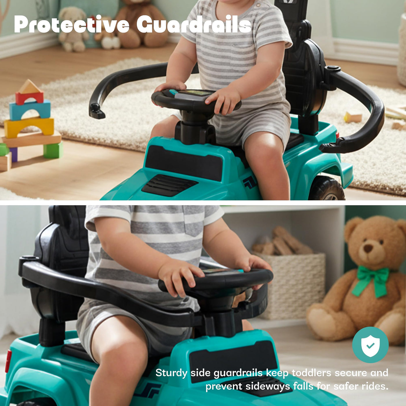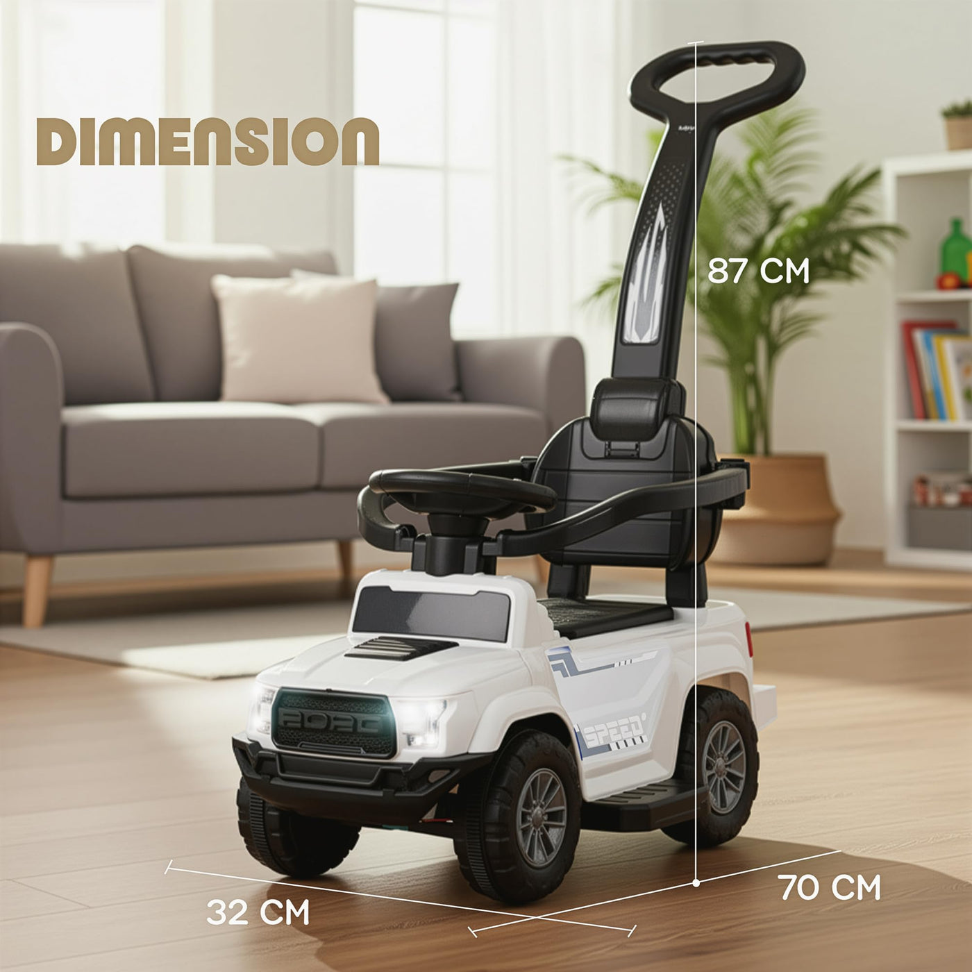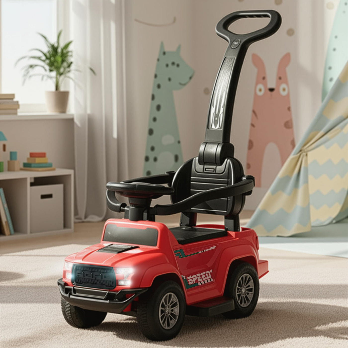 The Baybee Roady Pro Ride-On Baby Car is designed to offer both fun and safety for toddlers aged 1–3 years. With built-in music and LED lights, it keeps little ones entertained while the comfortable backrest and sturdy design ensure a secure and enjoyable ride. Crafted from high-quality, child-friendly materials, this push ride-on Jeep is equipped with durable wheels and an anti-rollover design, providing stability and peace of mind for parents.