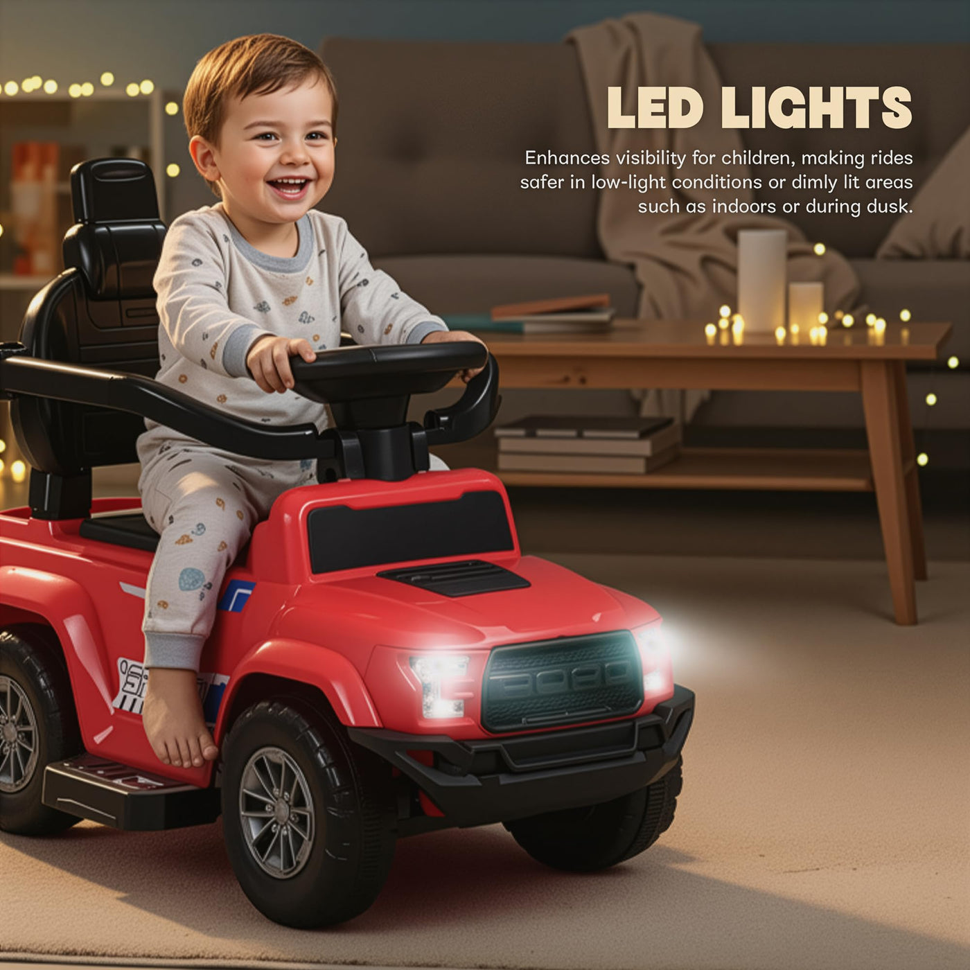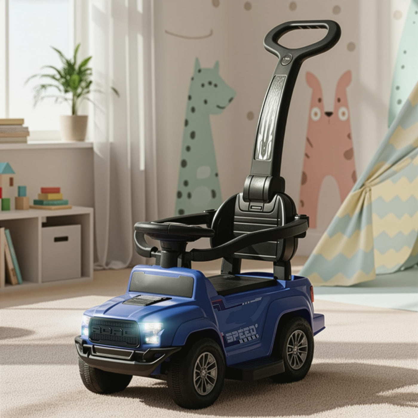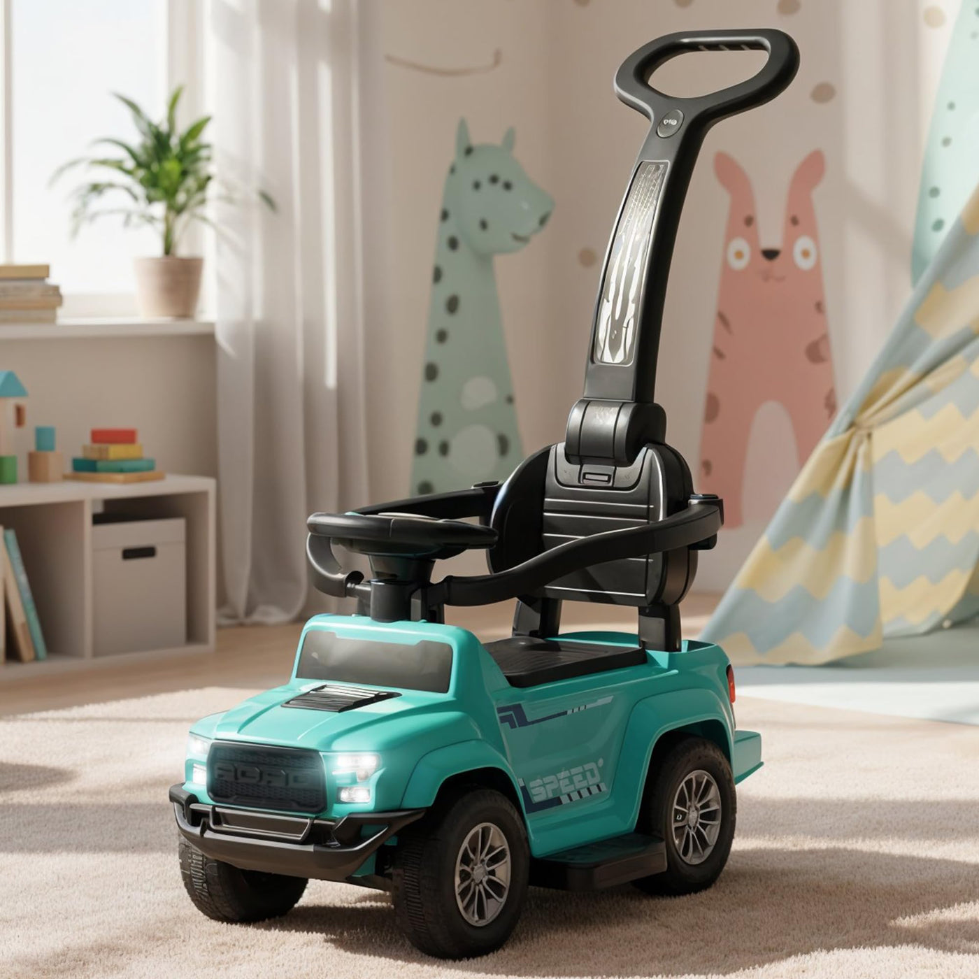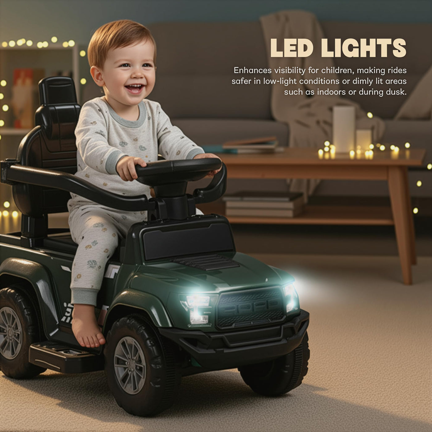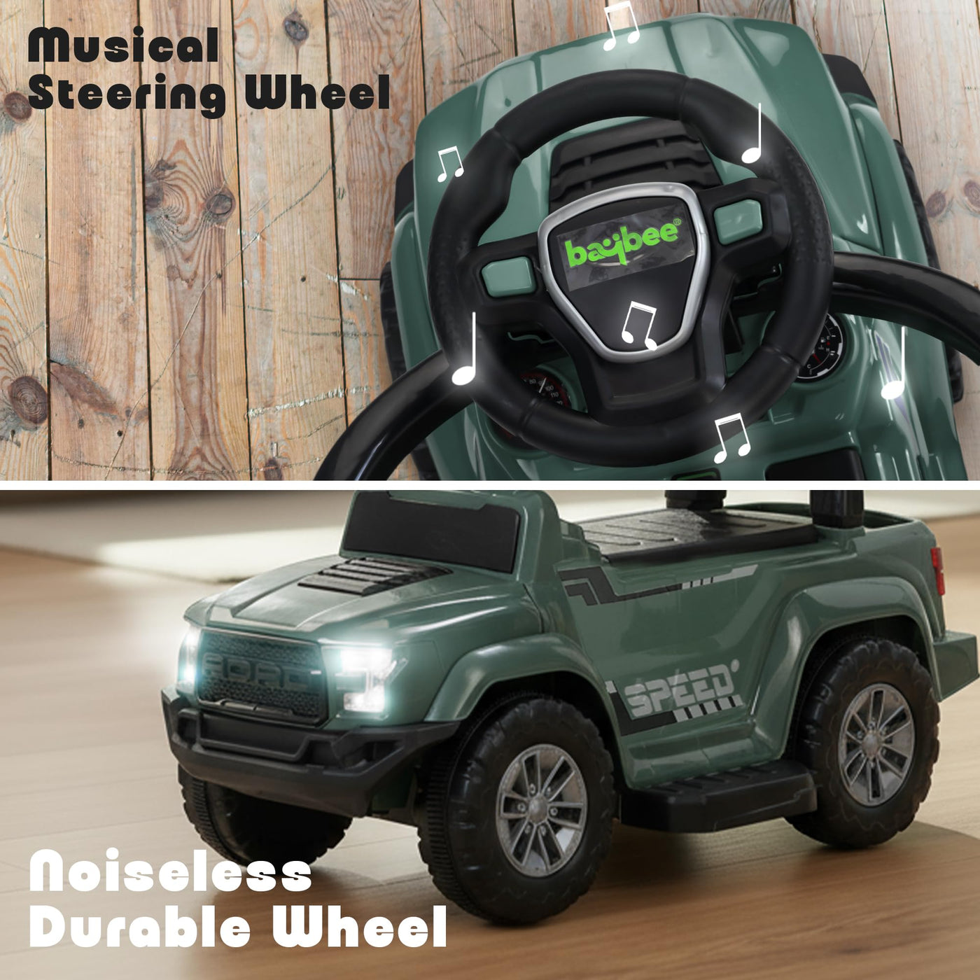 The Baybee Roady Pro Ride-On Baby Car is designed to offer both fun and safety for toddlers aged 1–3 years. With built-in music and LED lights, it keeps little ones entertained while the comfortable backrest and sturdy design ensure a secure and enjoyable ride. Crafted from high-quality, child-friendly materials, this push ride-on Jeep is equipped with durable wheels and an anti-rollover design, providing stability and peace of mind for parents.