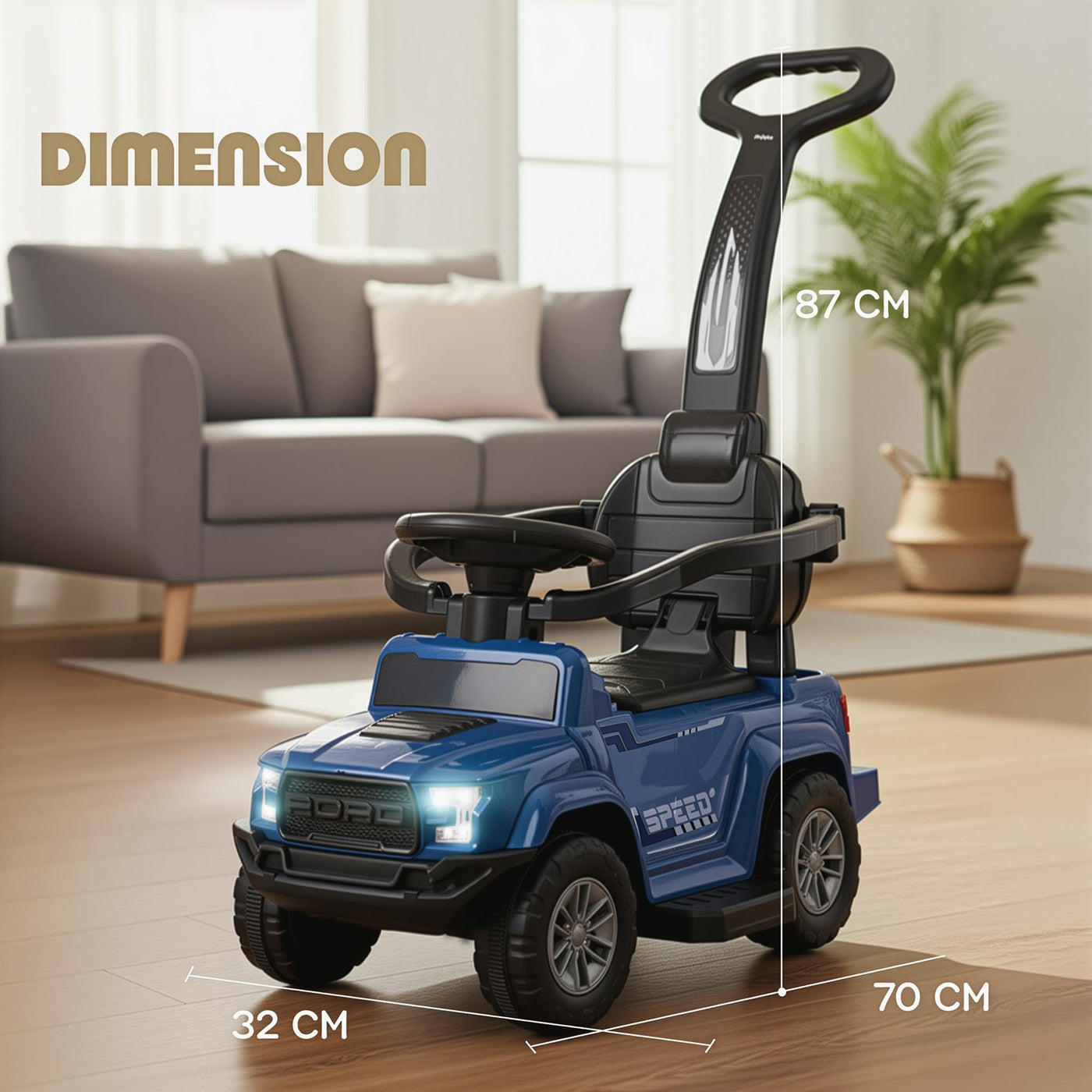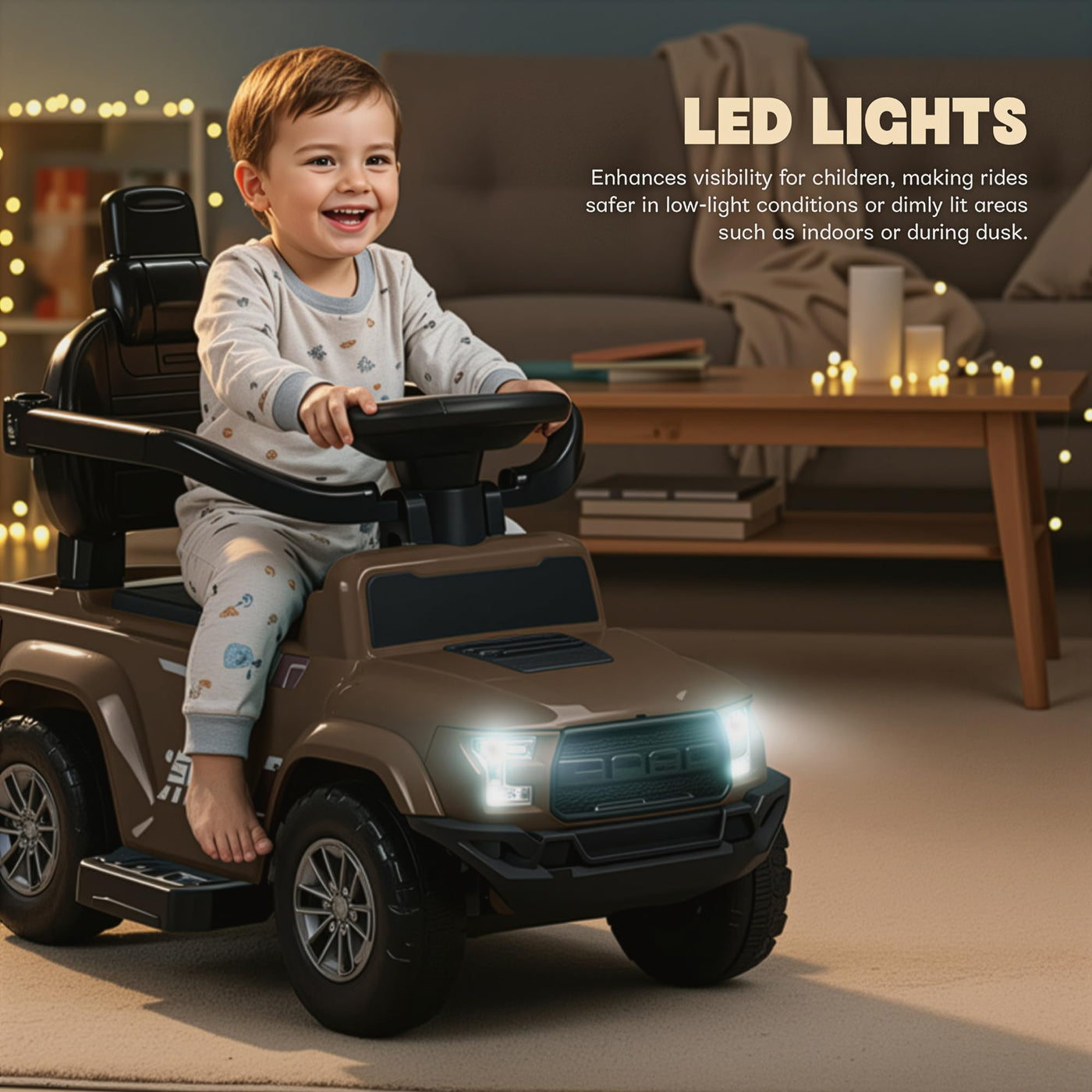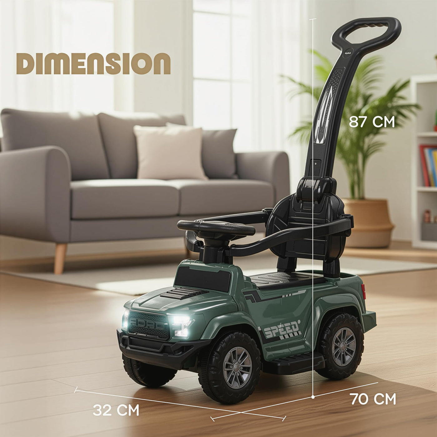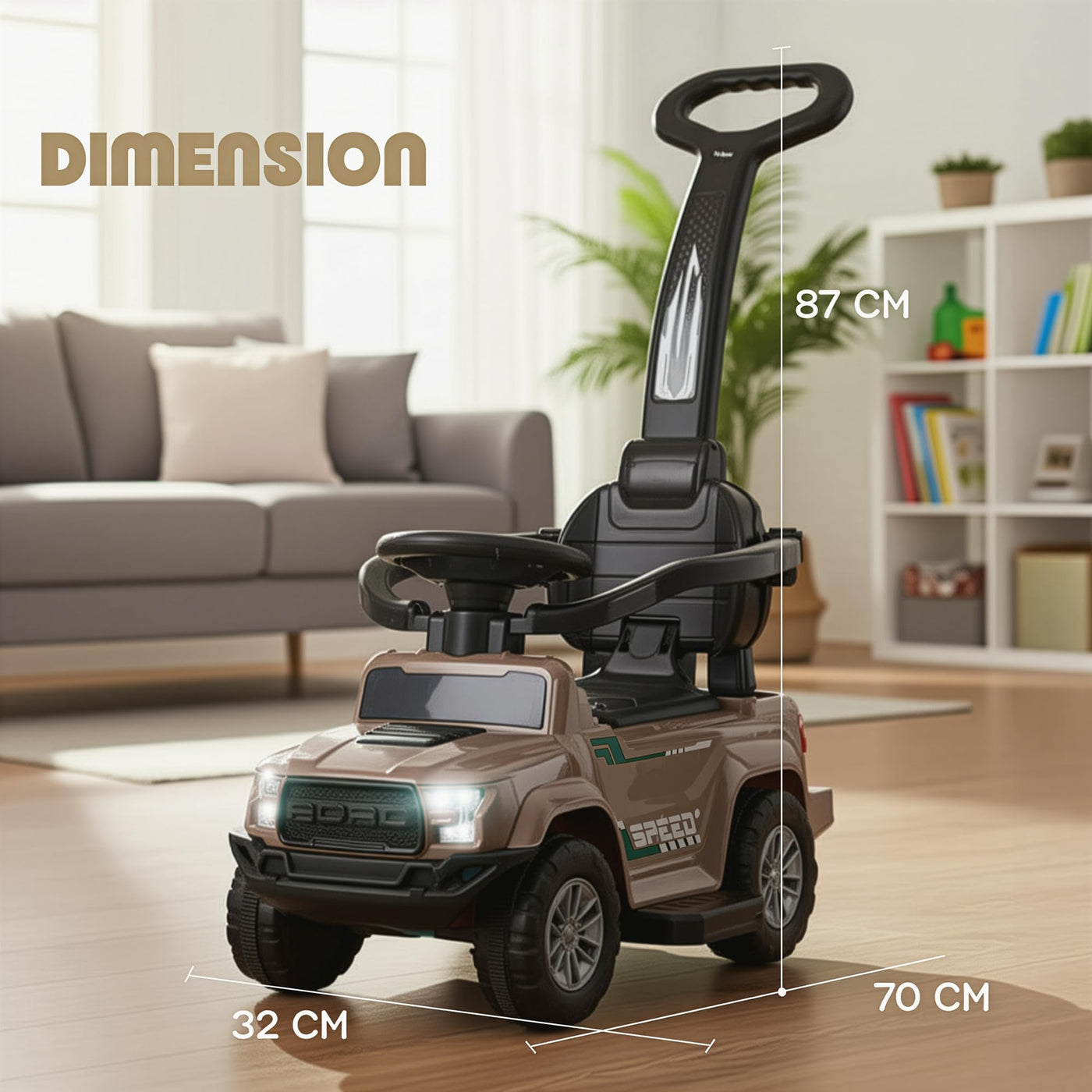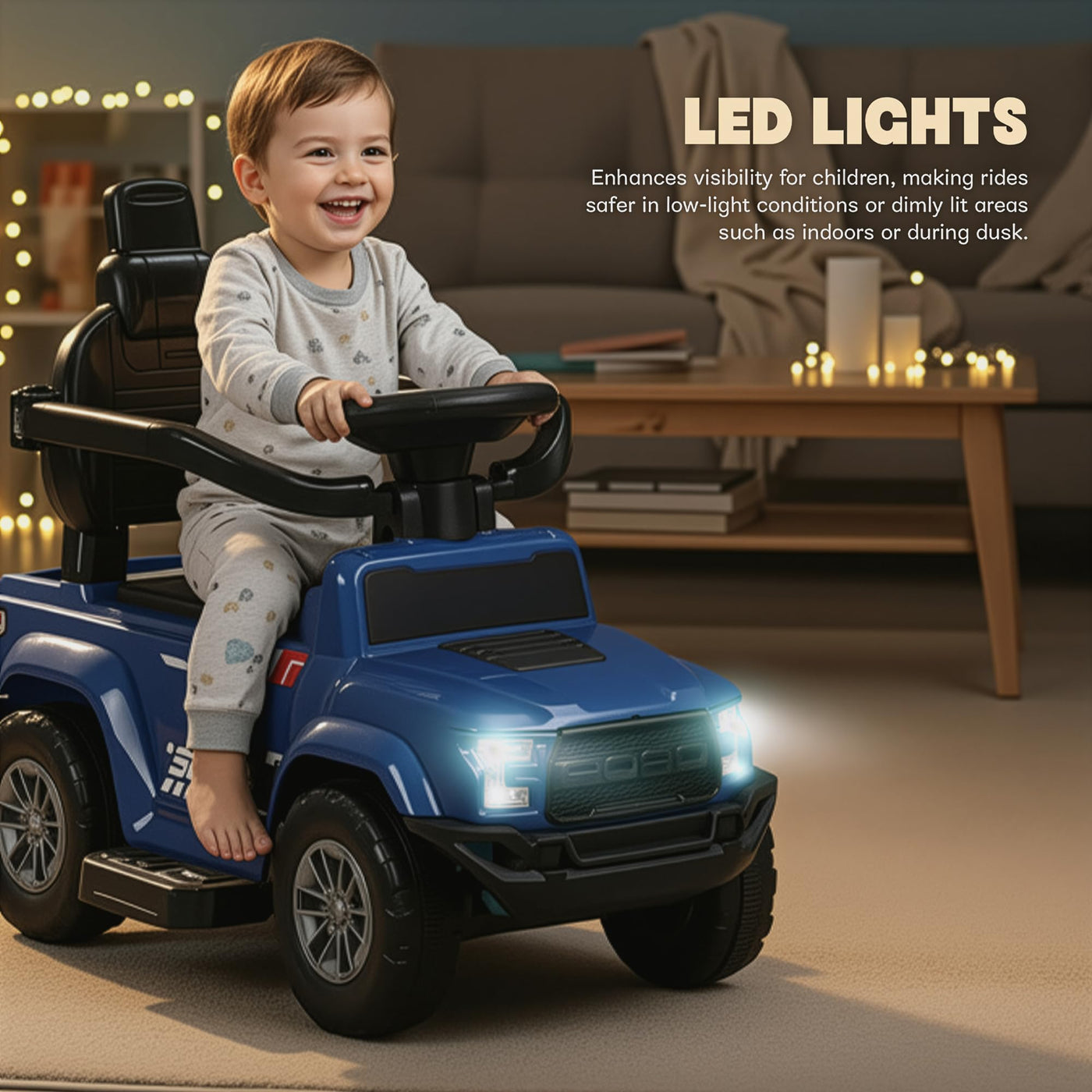 The Baybee Roady Pro Ride-On Baby Car is designed to offer both fun and safety for toddlers aged 1–3 years. With built-in music and LED lights, it keeps little ones entertained while the comfortable backrest and sturdy design ensure a secure and enjoyable ride. Crafted from high-quality, child-friendly materials, this push ride-on Jeep is equipped with durable wheels and an anti-rollover design, providing stability and peace of mind for parents.