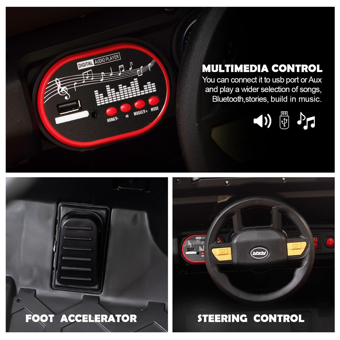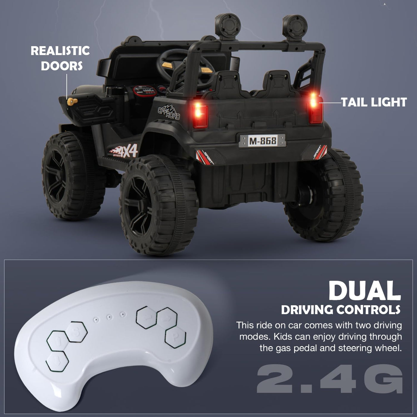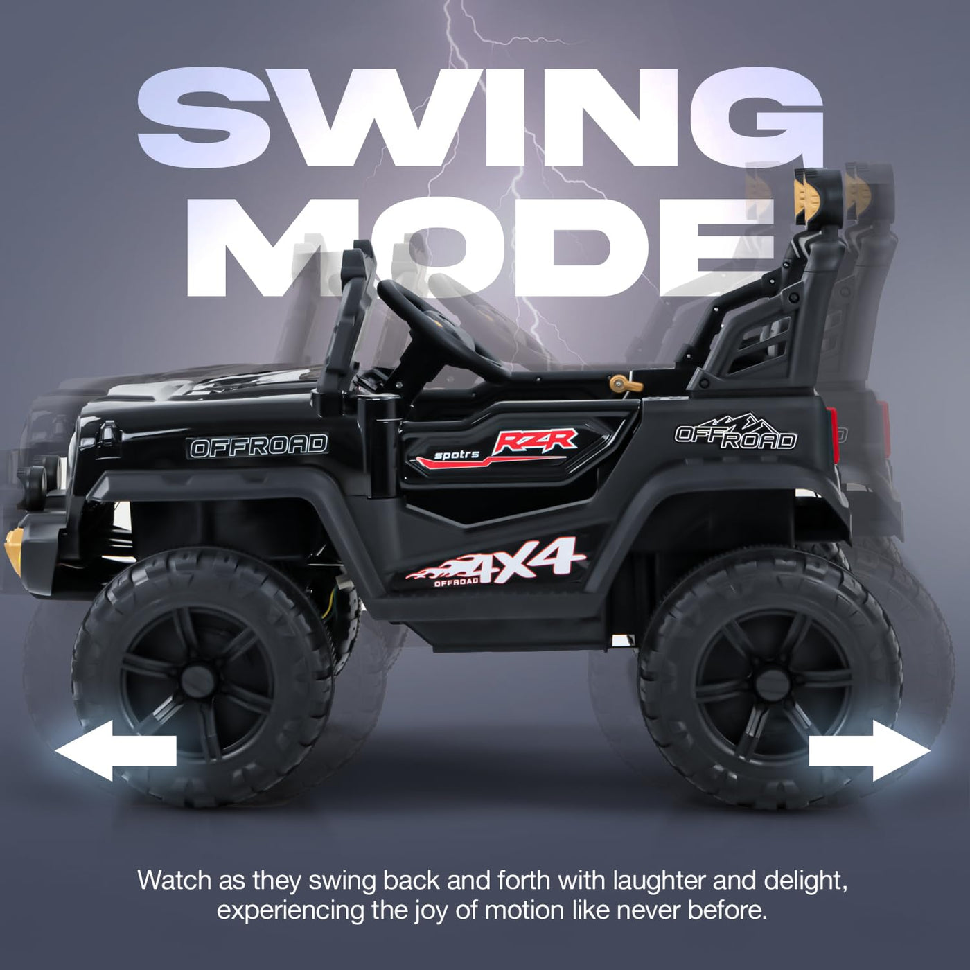 The Baybee BLITZ electric car for kids is packed with exciting features that ensure a fun, safe, and realistic driving experience. It offers DUAL CONTROL DRIVING MODES, allowing parents to steer using a 2.4G wireless remote or letting kids drive independently, promoting hand-eye-foot coordination. With REALISTIC RIDE WITH ENTERTAINMENT, the car includes Swing Mode, RGB windshield lights, horn, LED headlights, Bluetooth, USB, and Aux input for music and storytelling, creating an immersive adventure. Equipped with a SAFE & POWERFUL 4X4 MOTOR, it ensures smooth steering and reliable control, ideal for all kinds of terrains. Its BUILT FOR ALL TERRAINS design features wear-resistant seats and rugged wheels, perfect for both indoor and outdoor use, making it one of the best big cars for kids. The LONGER PLAYTIME WITH HIGH-CAPACITY BATTERY is powered by a 12V 4.5AH rechargeable battery, offering up to 40 minutes of uninterrupted fun, suitable for both backyard and neighborhood rides. Finally, the QUICK & EASY ASSEMBLY allows parents to set up the car swiftly using the included user manual, so kids can jump into the fun without delay. Whether you're looking for a battery-operated car for kids, a jeep for kids, or an electric car for kids to drive, the Baybee BLITZ delivers a perfect combination of safety, entertainment, and durability.
