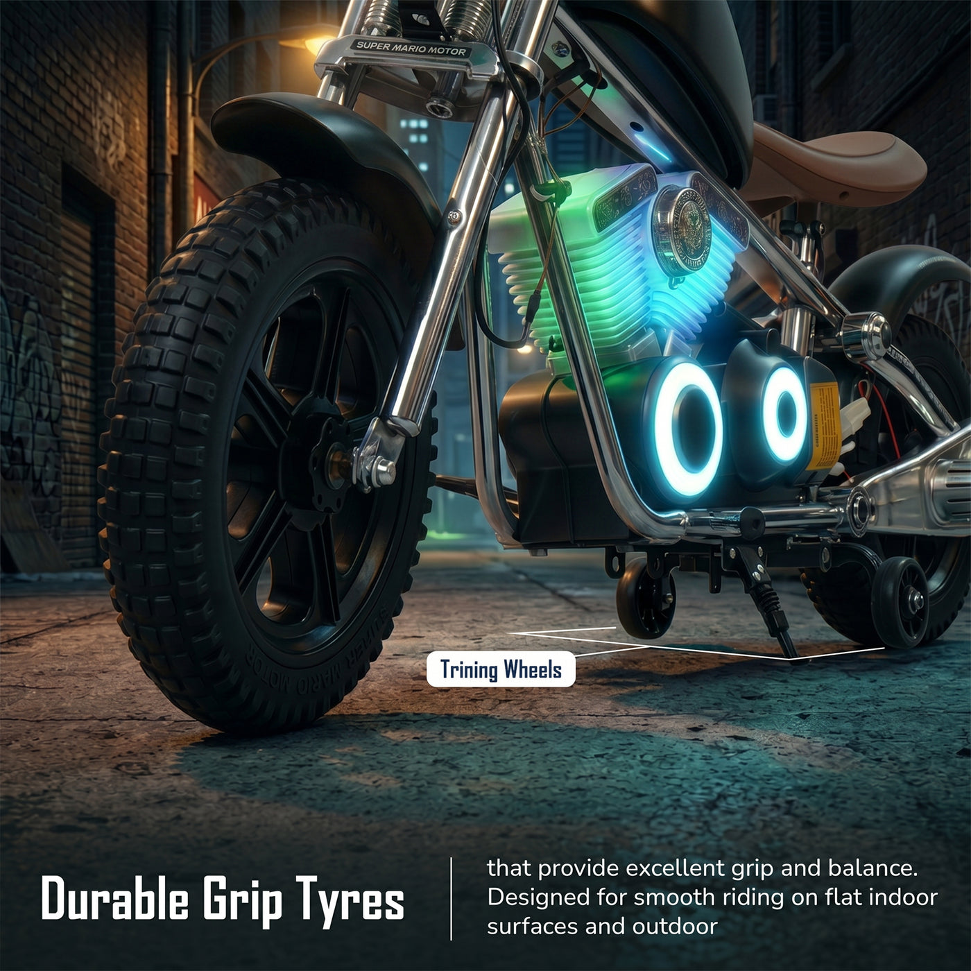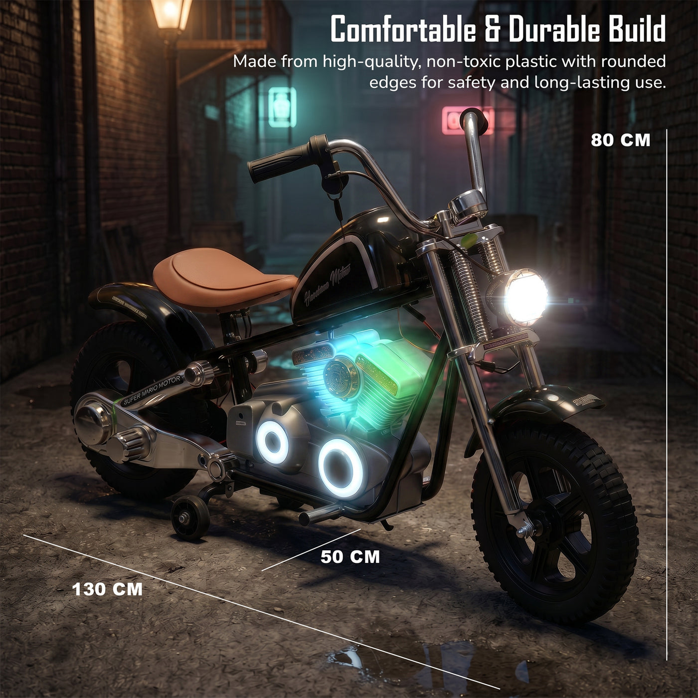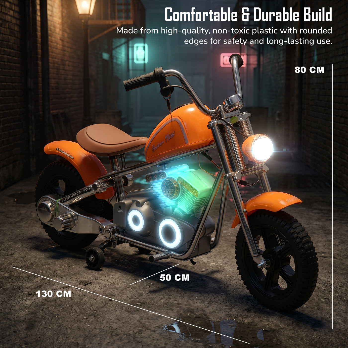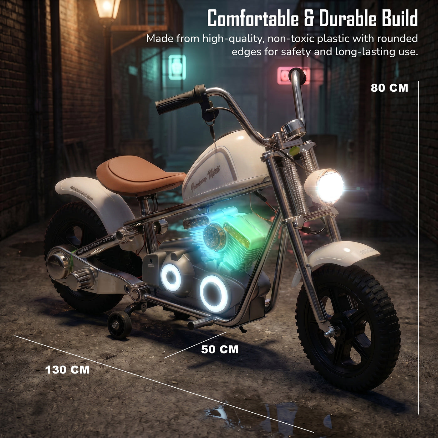 The Baybee ChopperX electric bike for kids delivers smooth riding with bright LED lights, music, and realistic styling for exciting indoor & outdoor play. This battery operated bike for kids features a long-lasting rechargeable battery for extended fun, making it a perfect rechargeable ride on toy bike. Designed with adjustable seating, this stylish kids bike grows with your child, offering comfort, support, and a premium riding experience.