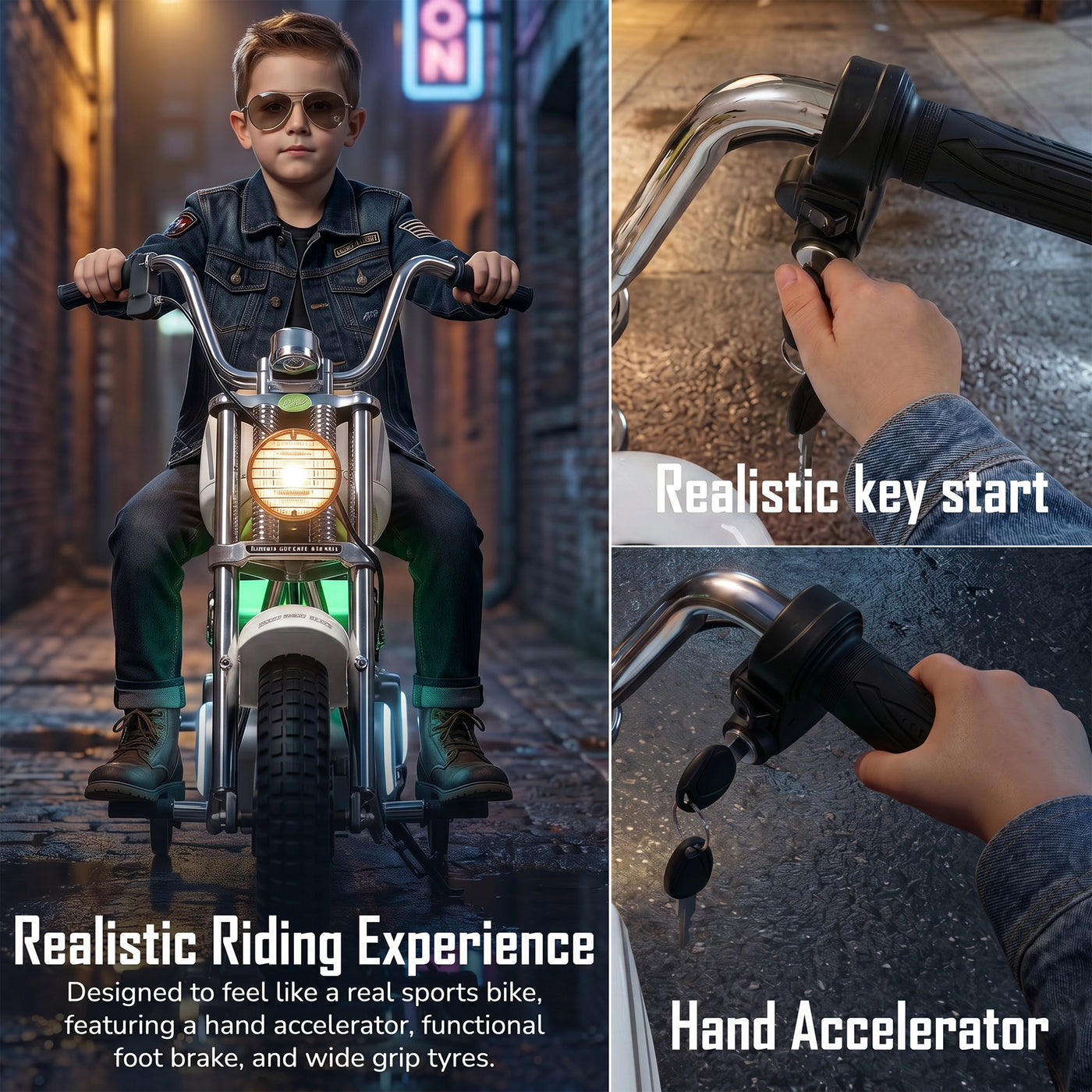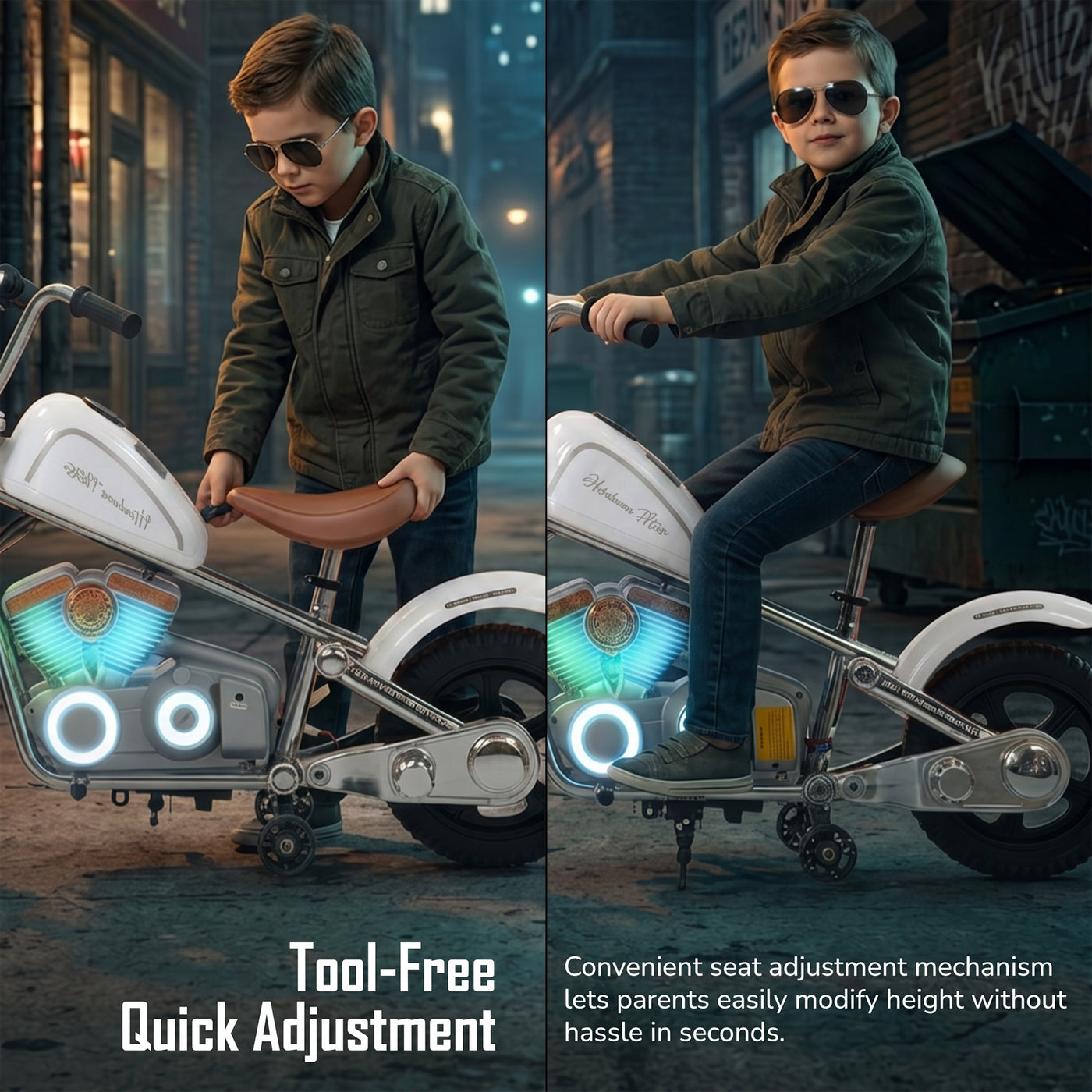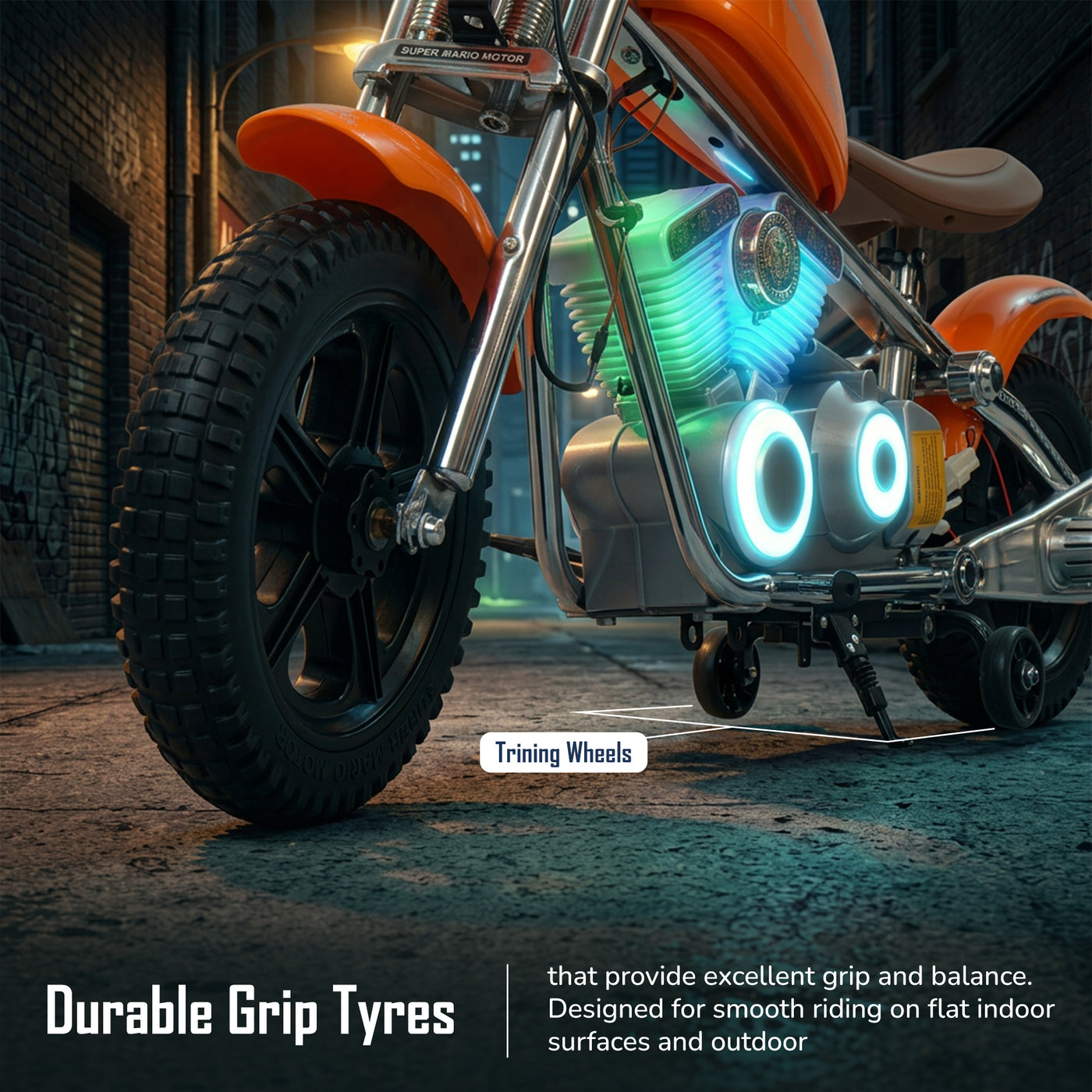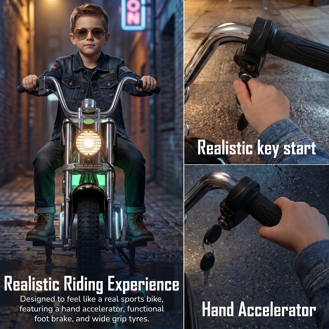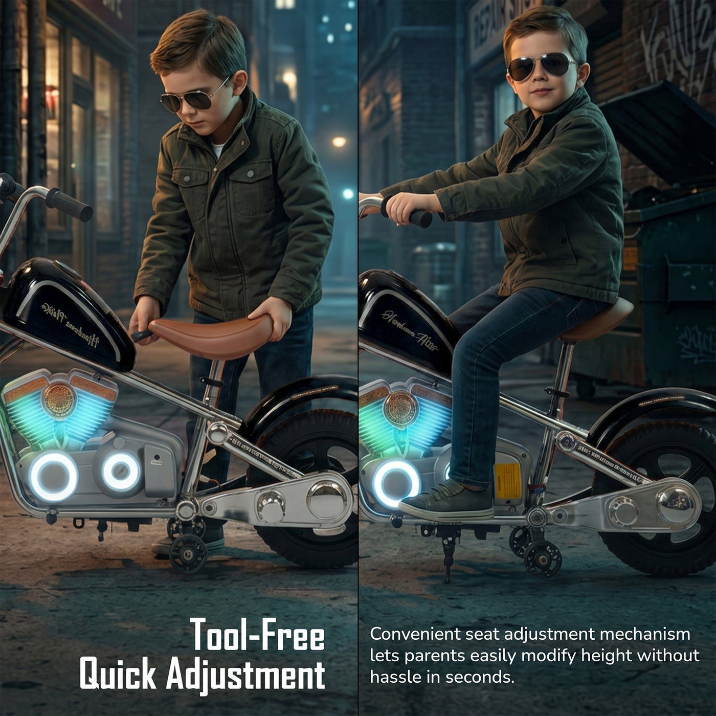 The Baybee ChopperX electric bike for kids delivers smooth riding with bright LED lights, music, and realistic styling for exciting indoor & outdoor play. This battery operated bike for kids features a long-lasting rechargeable battery for extended fun, making it a perfect rechargeable ride on toy bike. Designed with adjustable seating, this stylish kids bike grows with your child, offering comfort, support, and a premium riding experience.
