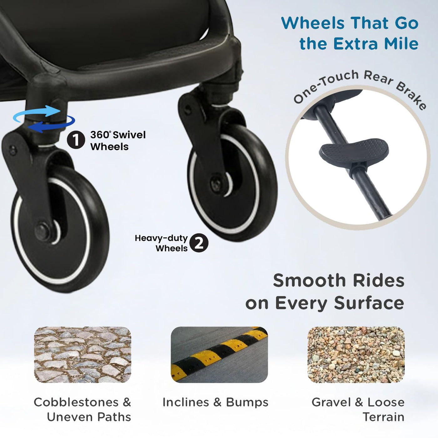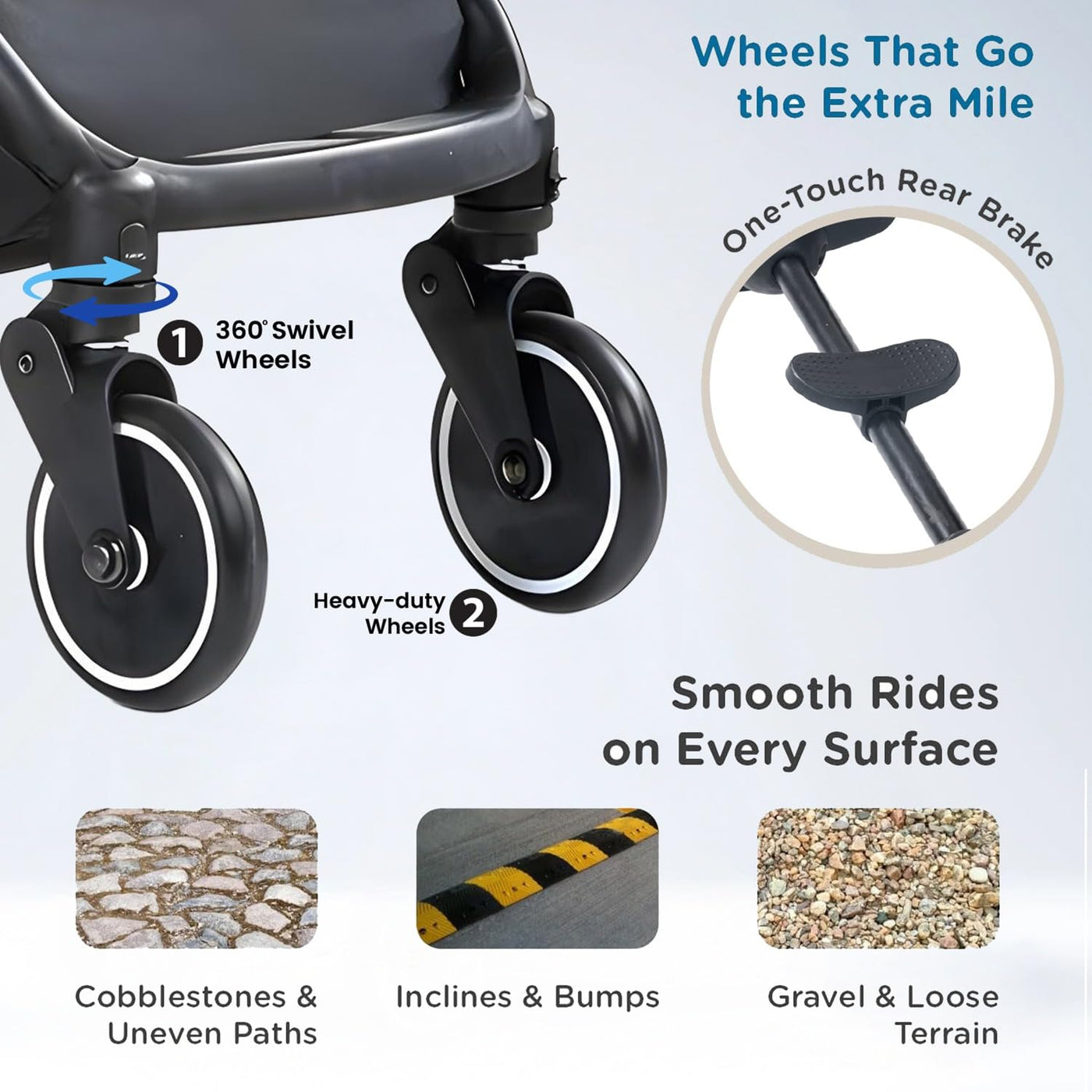 • Smooth All-Terrain Wheels: Baby stroller glides effortlessly with 360° rotating front wheels and shock-absorbing suspension for bumpy roads.