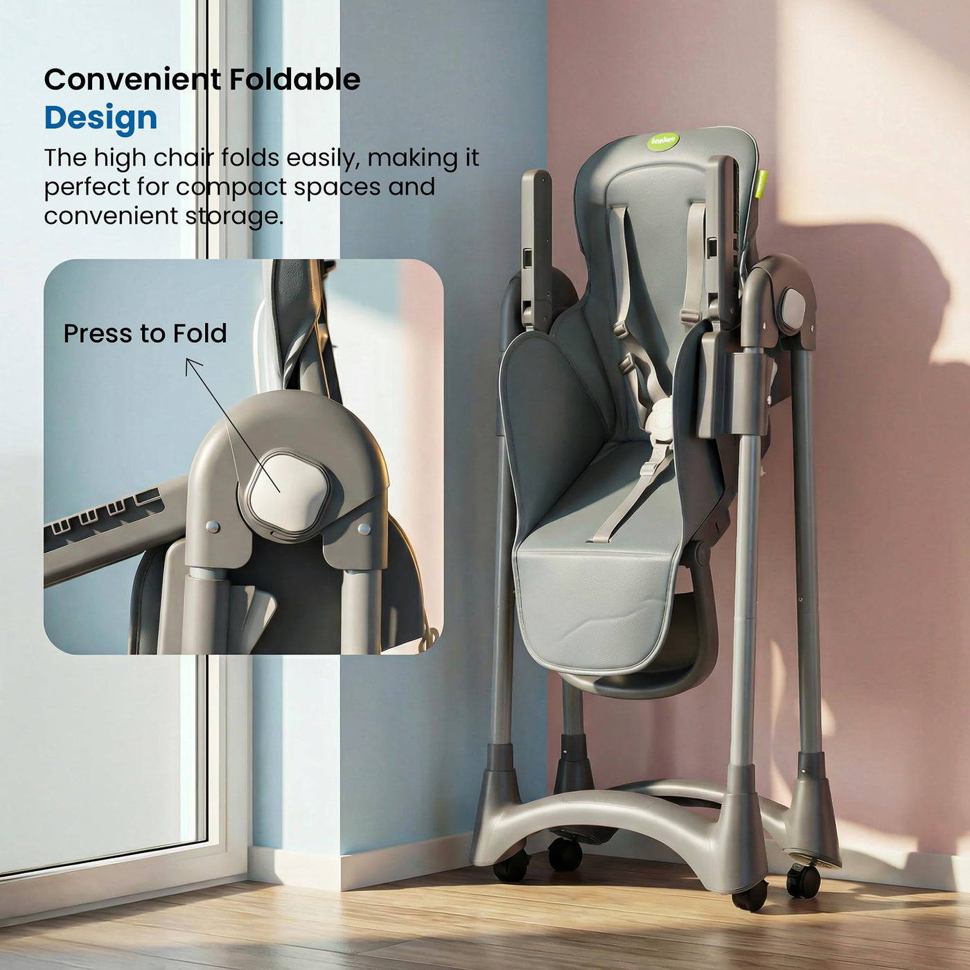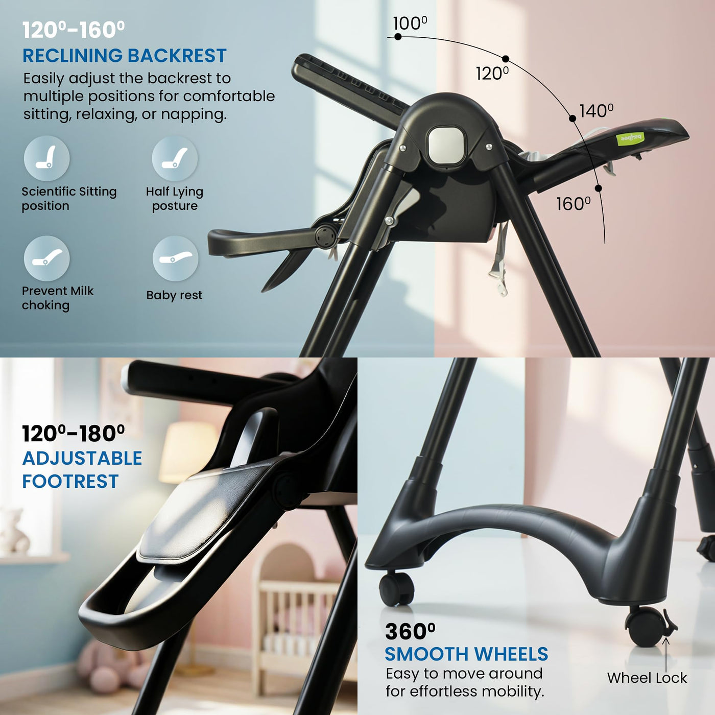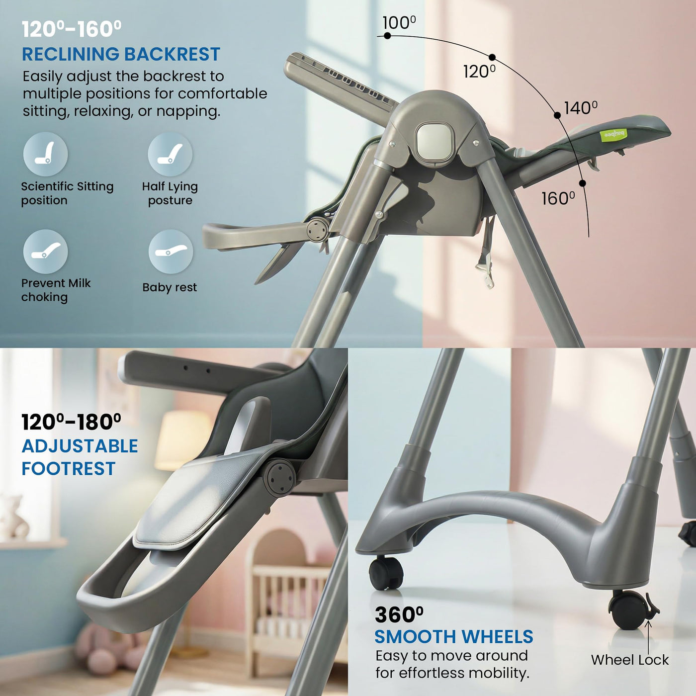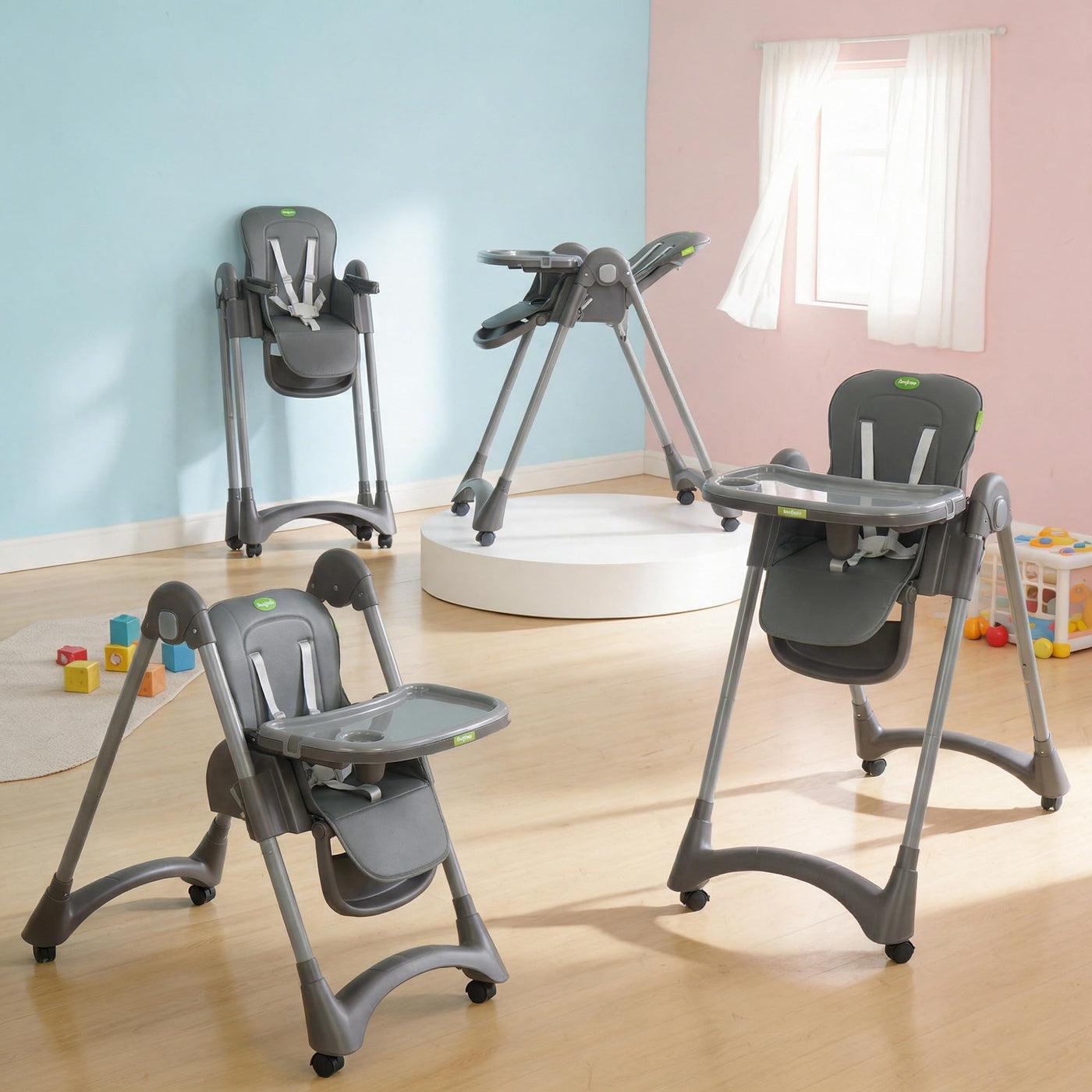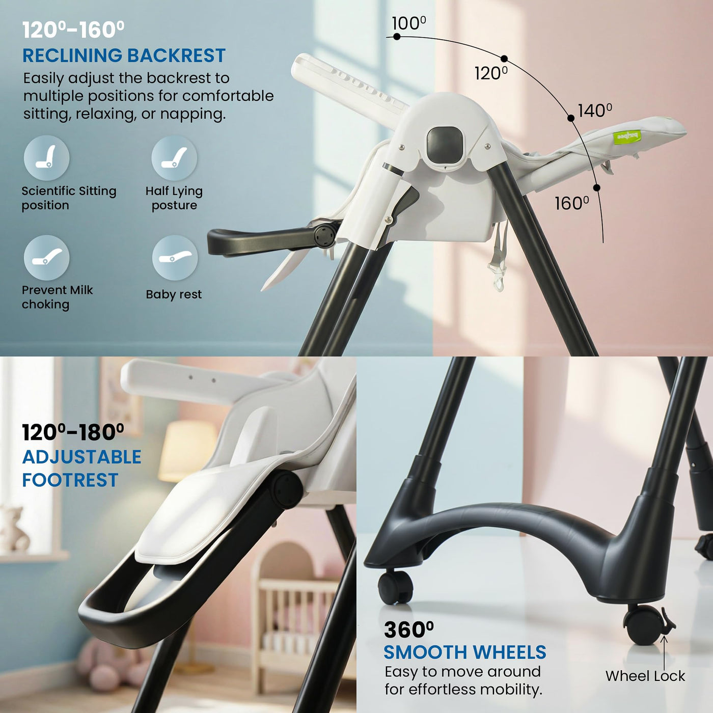 Make mealtime easier with this high chair for baby, designed for comfort, safety, and convenience. This adjustable baby high chair offers 6 height levels, 4 reclining positions (120°–160°), and a dual feeding and toy tray system for flexible use. Whether used as a high chair for baby 6 to 18 months or a daily baby feeding chair, it provides reliable support and functionality. The one-click fold system allows compact storage, while 360° swivel wheels with a lock ensure smooth movement and stability. The 5-point safety belt and guardrail add extra protection during feeding time. This high chair is built for modern families who want durability, comfort, and space-saving design in one complete solution.