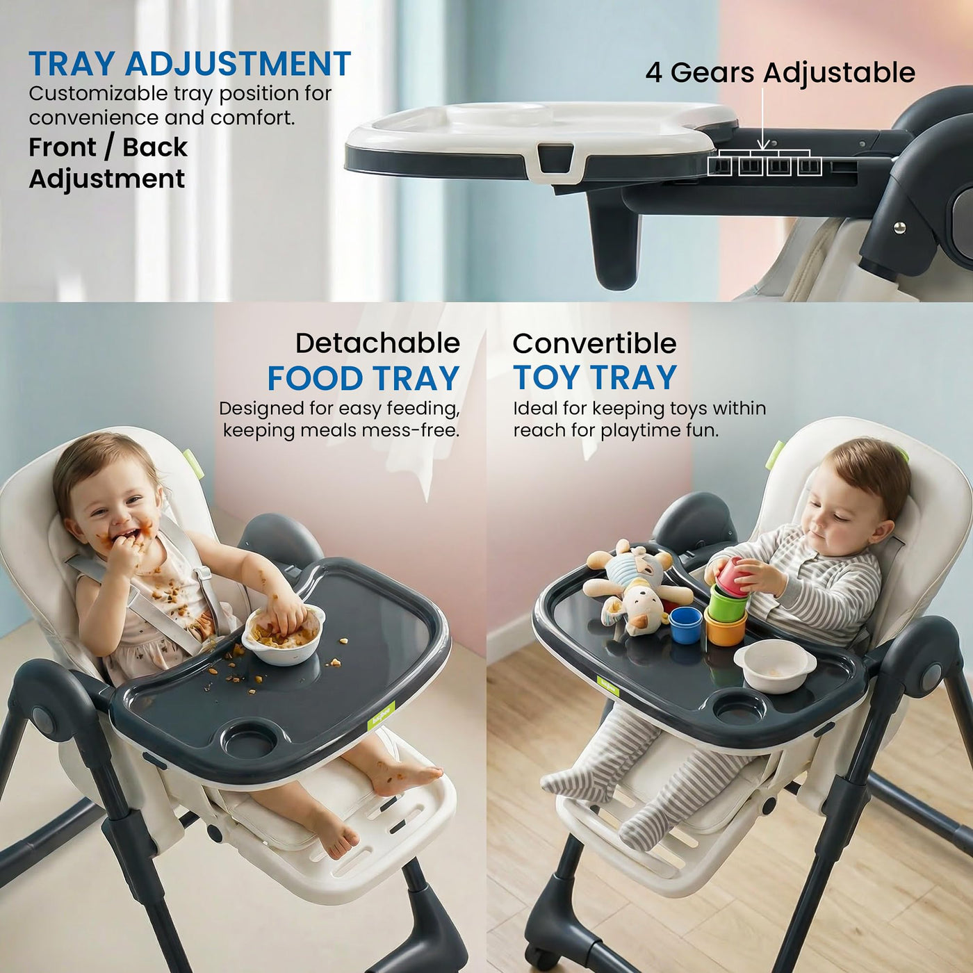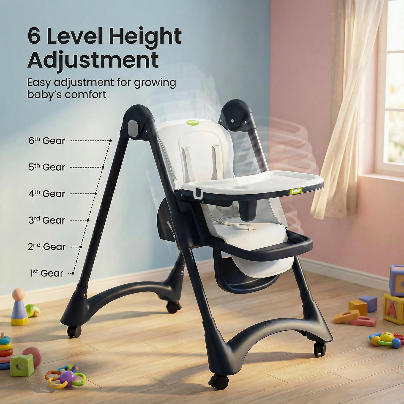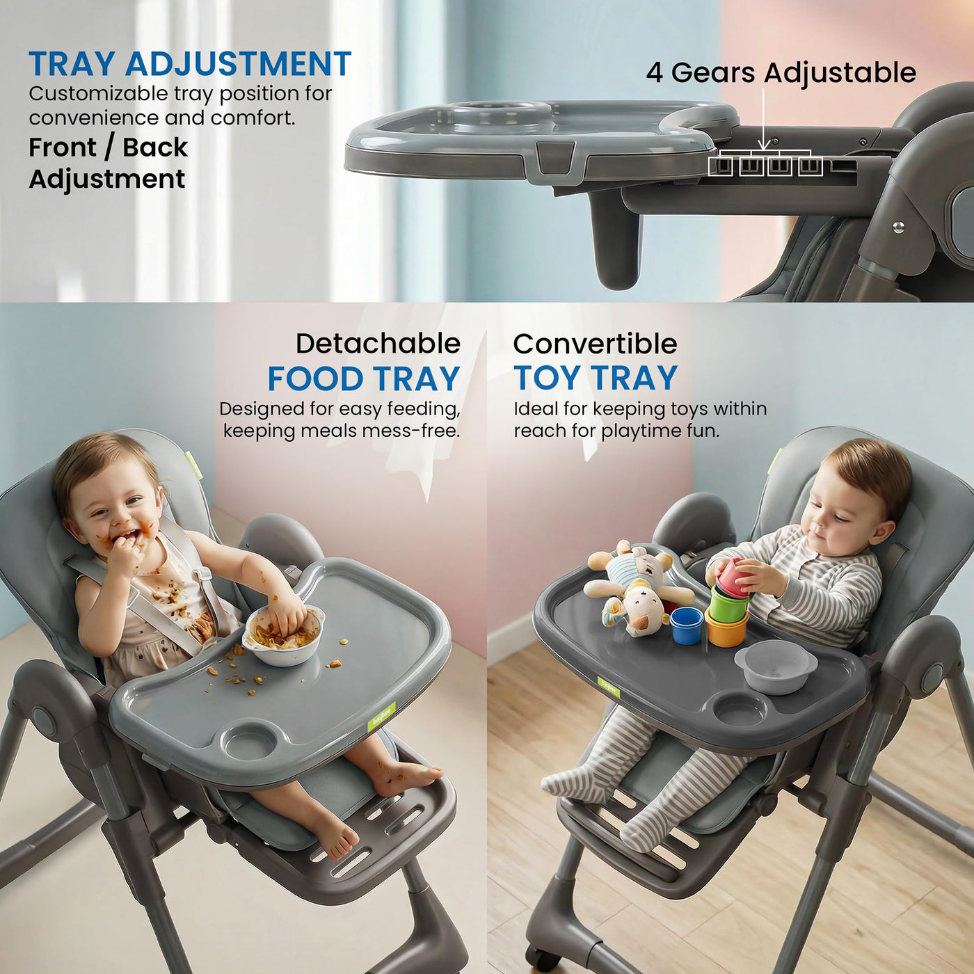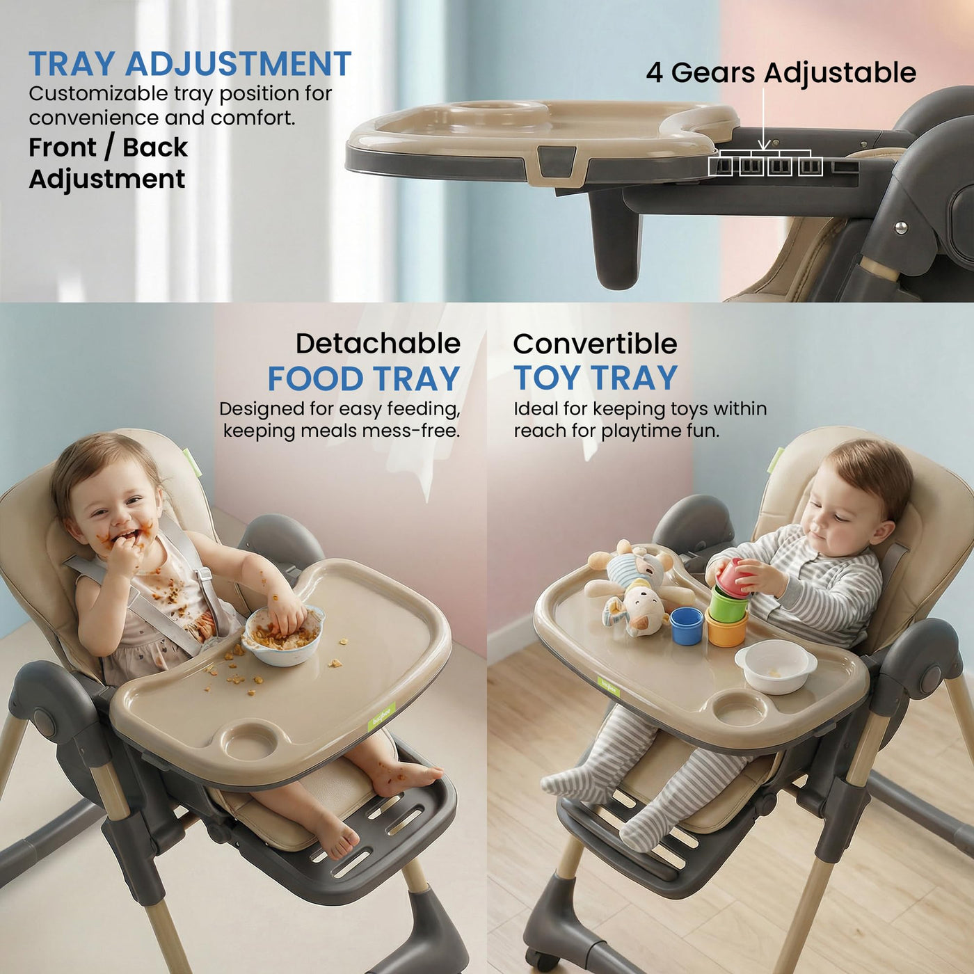 Make mealtime easier with this high chair for baby, designed for comfort, safety, and convenience. This adjustable baby high chair offers 6 height levels, 4 reclining positions (120°–160°), and a dual feeding and toy tray system for flexible use. Whether used as a high chair for baby 6 to 18 months or a daily baby feeding chair, it provides reliable support and functionality. The one-click fold system allows compact storage, while 360° swivel wheels with a lock ensure smooth movement and stability. The 5-point safety belt and guardrail add extra protection during feeding time. This high chair is built for modern families who want durability, comfort, and space-saving design in one complete solution.