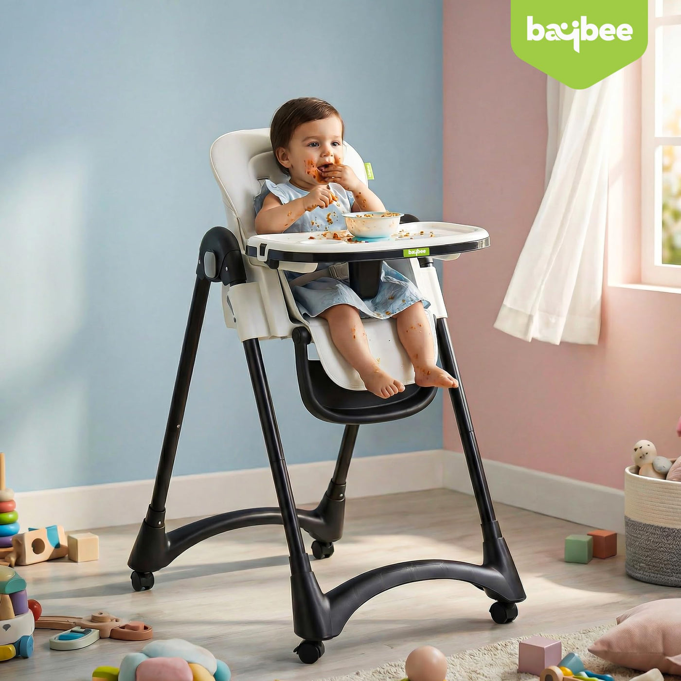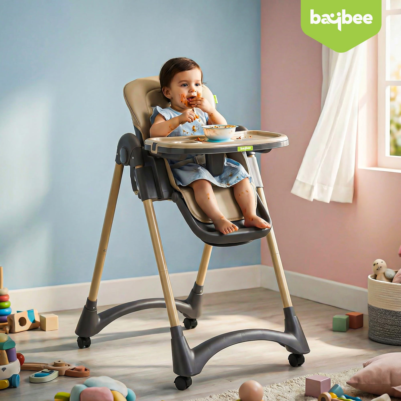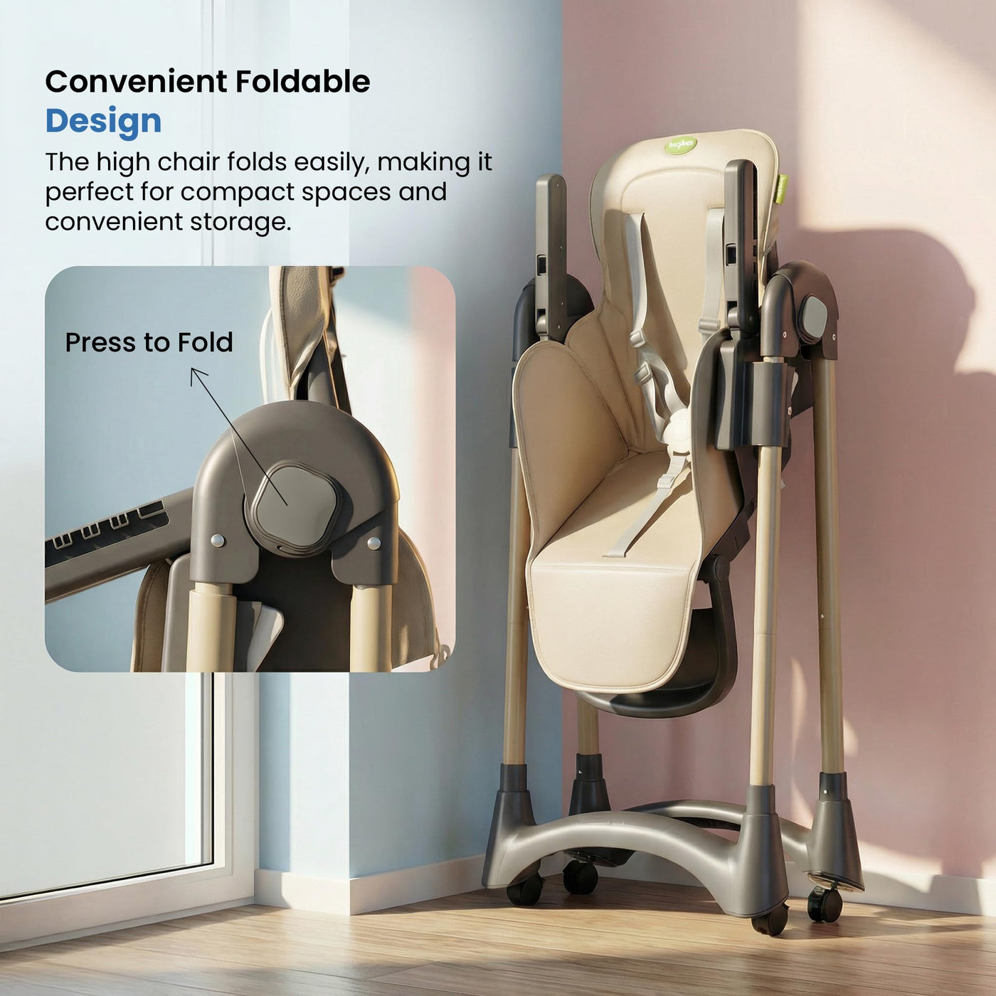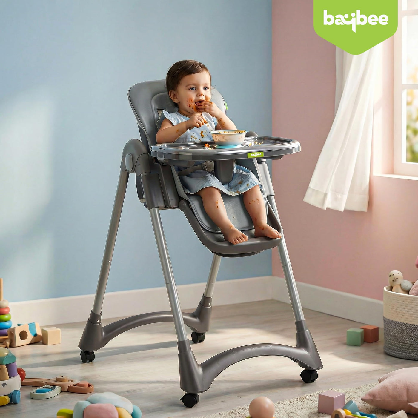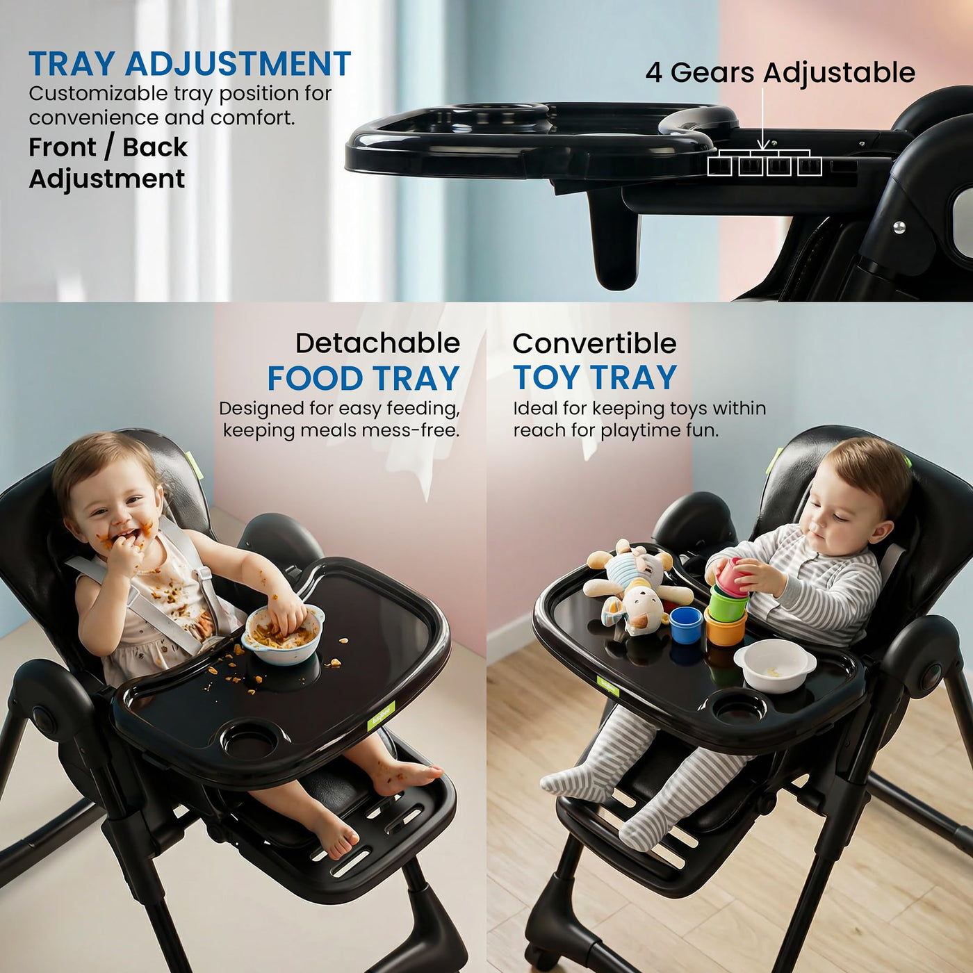 Make mealtime easier with this high chair for baby, designed for comfort, safety, and convenience. This adjustable baby high chair offers 6 height levels, 4 reclining positions (120°–160°), and a dual feeding and toy tray system for flexible use. Whether used as a high chair for baby 6 to 18 months or a daily baby feeding chair, it provides reliable support and functionality. The one-click fold system allows compact storage, while 360° swivel wheels with a lock ensure smooth movement and stability. The 5-point safety belt and guardrail add extra protection during feeding time. This high chair is built for modern families who want durability, comfort, and space-saving design in one complete solution.