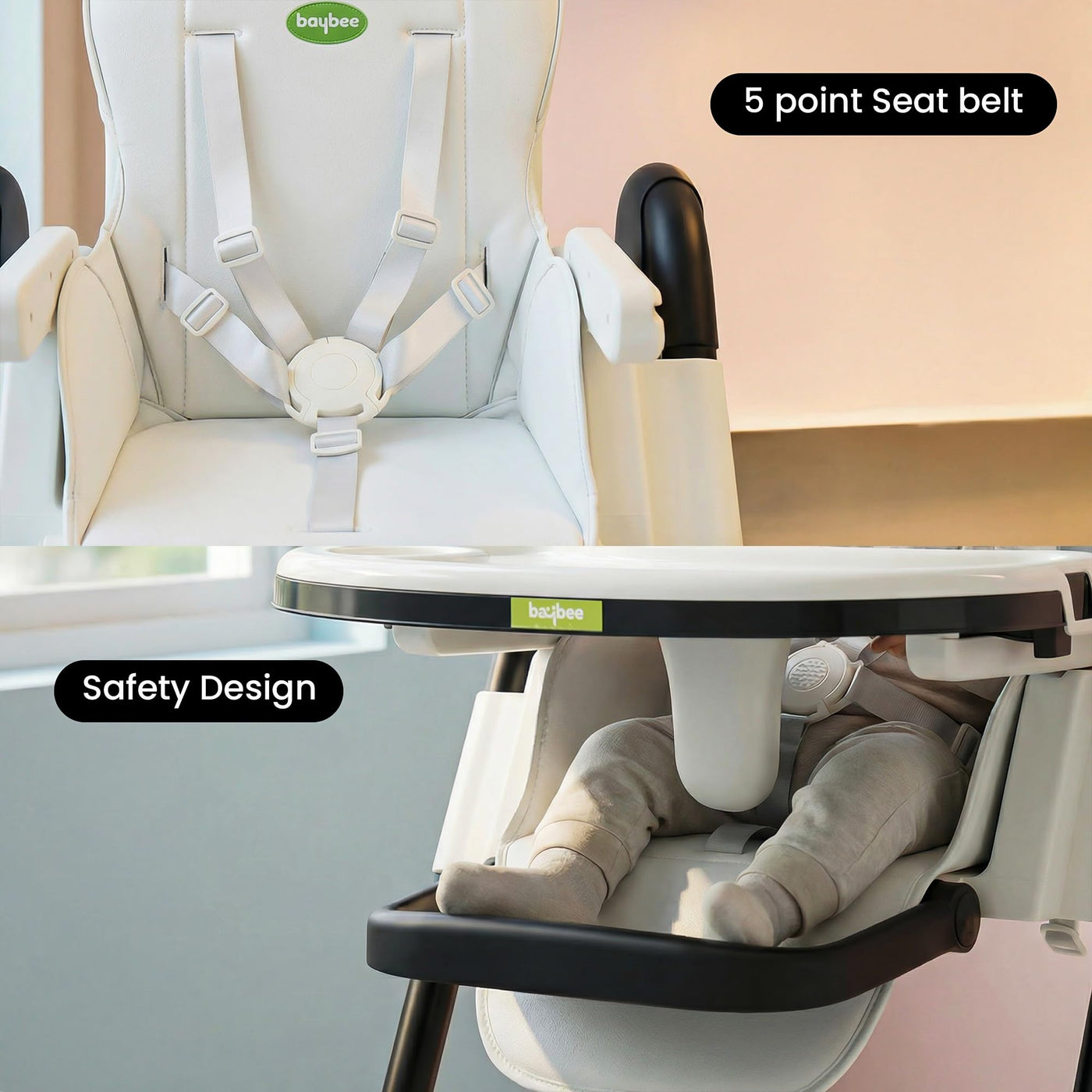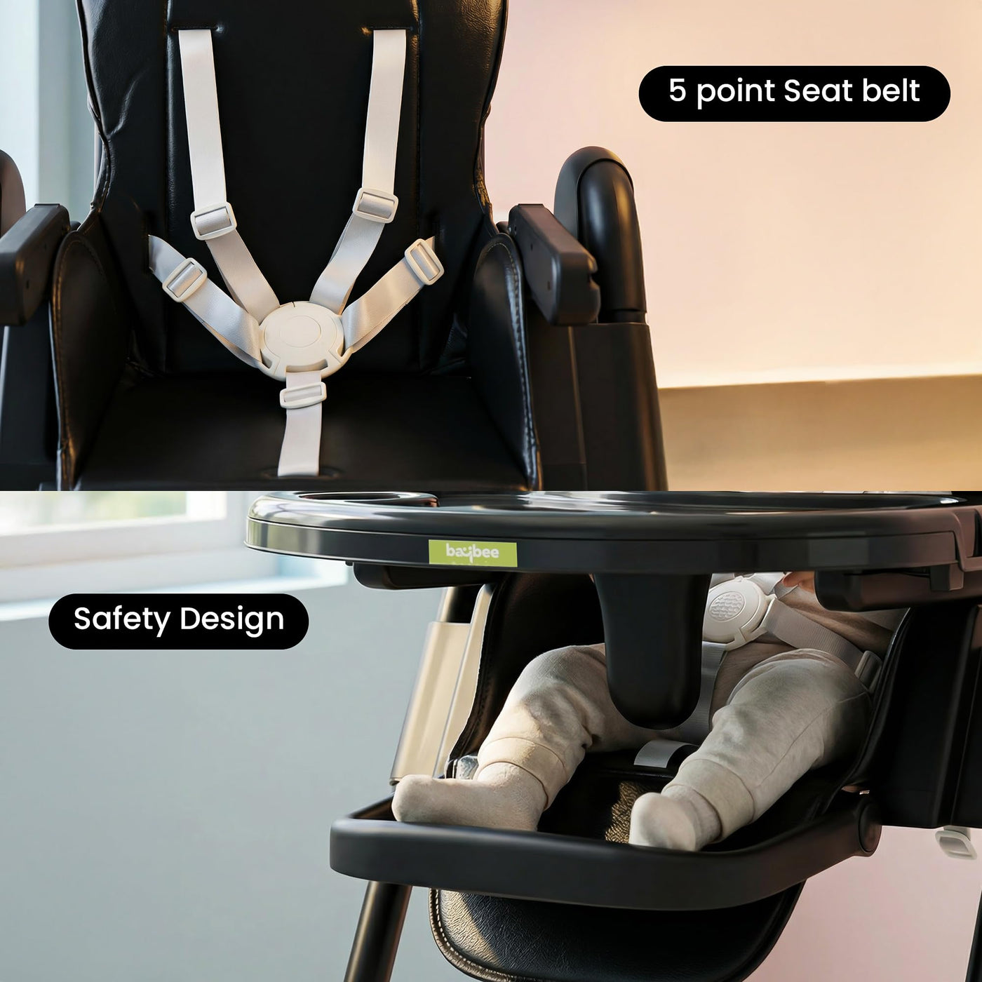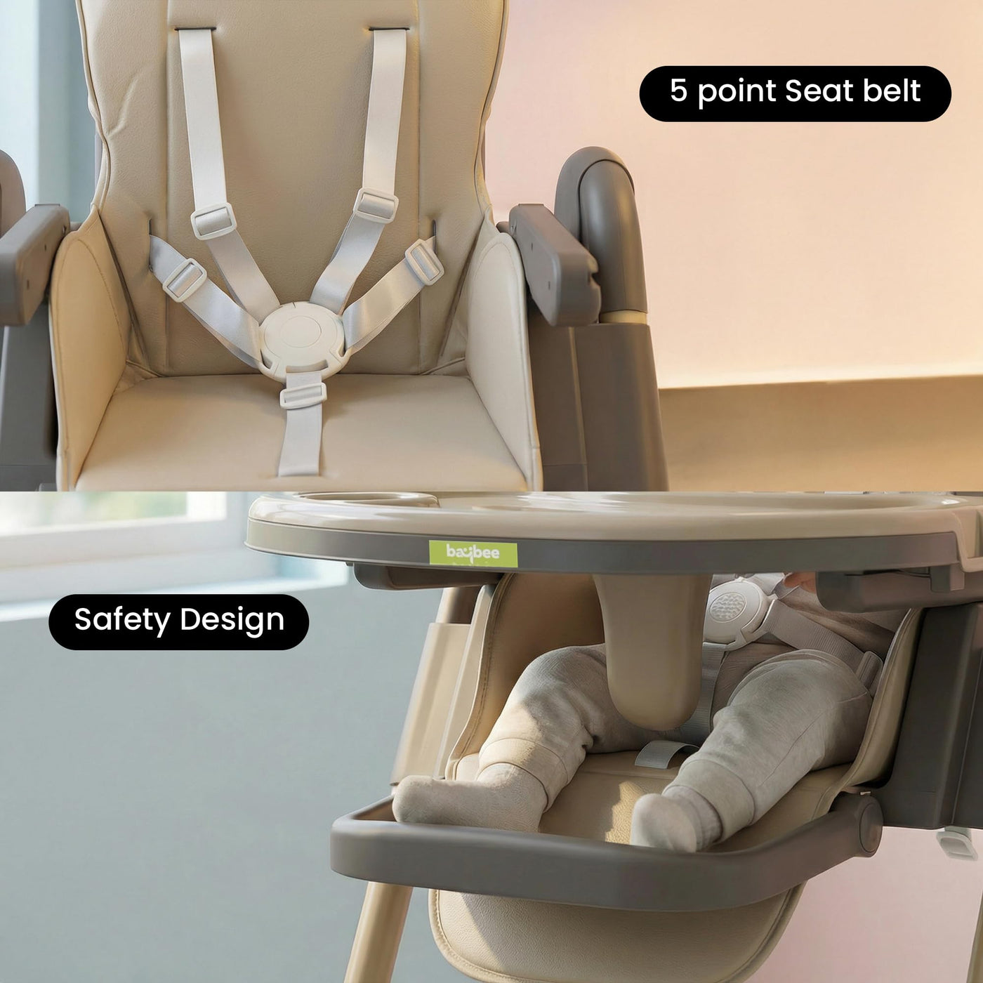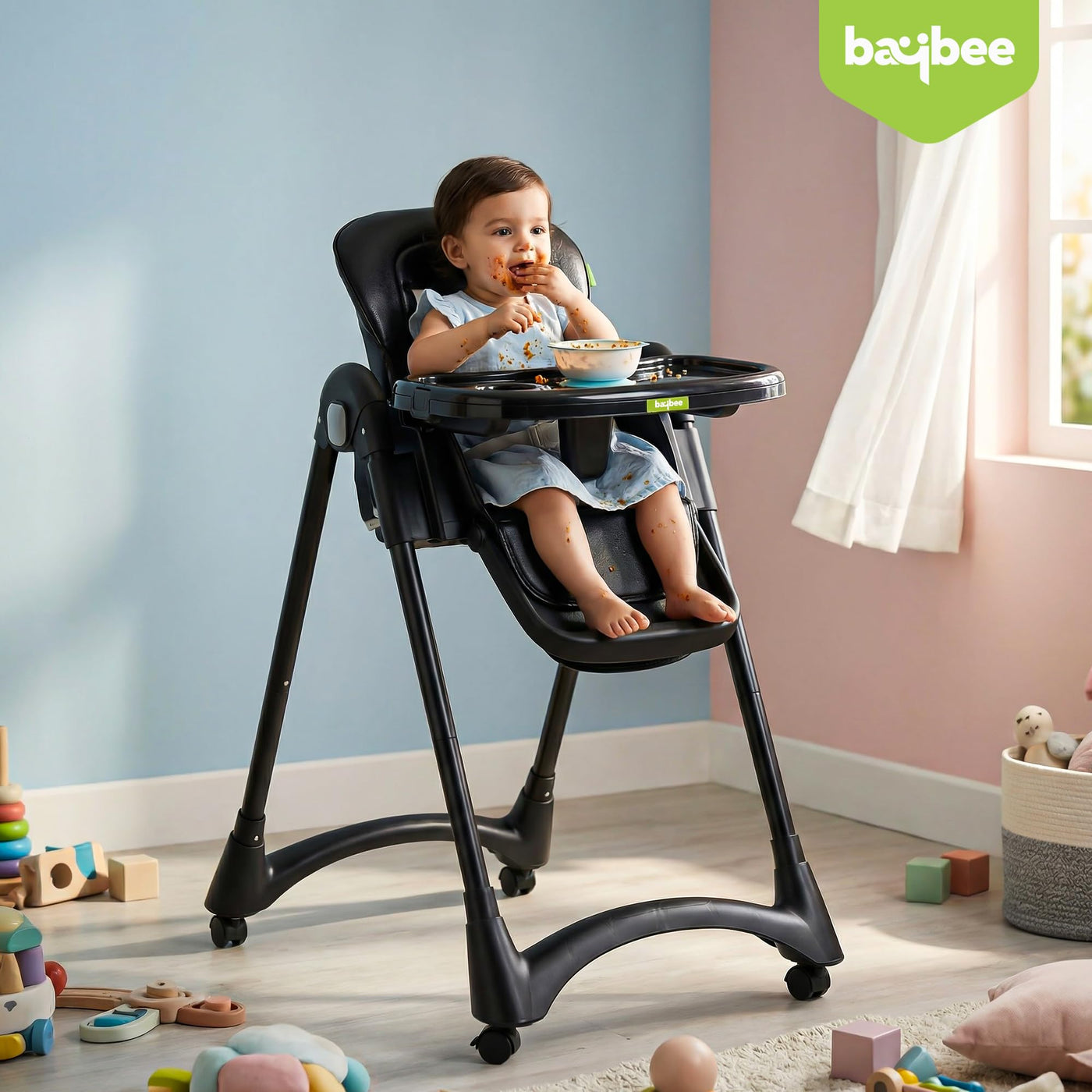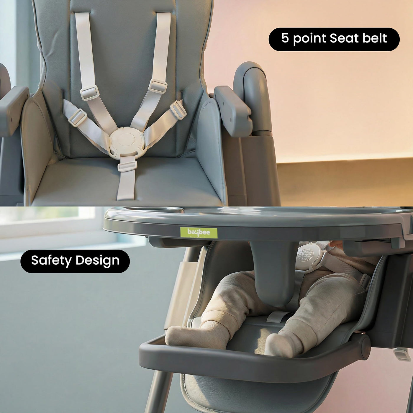 Make mealtime easier with this high chair for baby, designed for comfort, safety, and convenience. This adjustable baby high chair offers 6 height levels, 4 reclining positions (120°–160°), and a dual feeding and toy tray system for flexible use. Whether used as a high chair for baby 6 to 18 months or a daily baby feeding chair, it provides reliable support and functionality. The one-click fold system allows compact storage, while 360° swivel wheels with a lock ensure smooth movement and stability. The 5-point safety belt and guardrail add extra protection during feeding time. This high chair is built for modern families who want durability, comfort, and space-saving design in one complete solution.