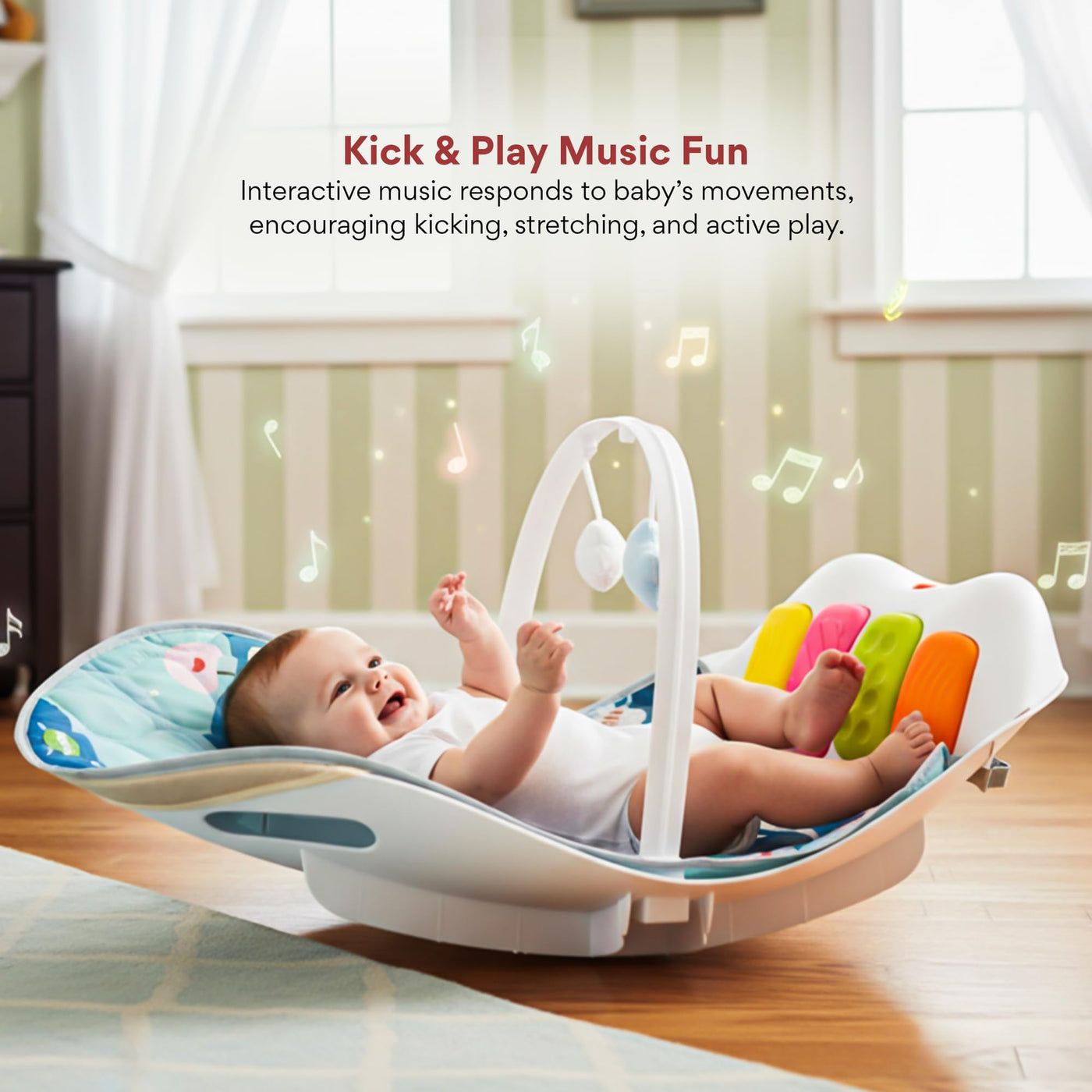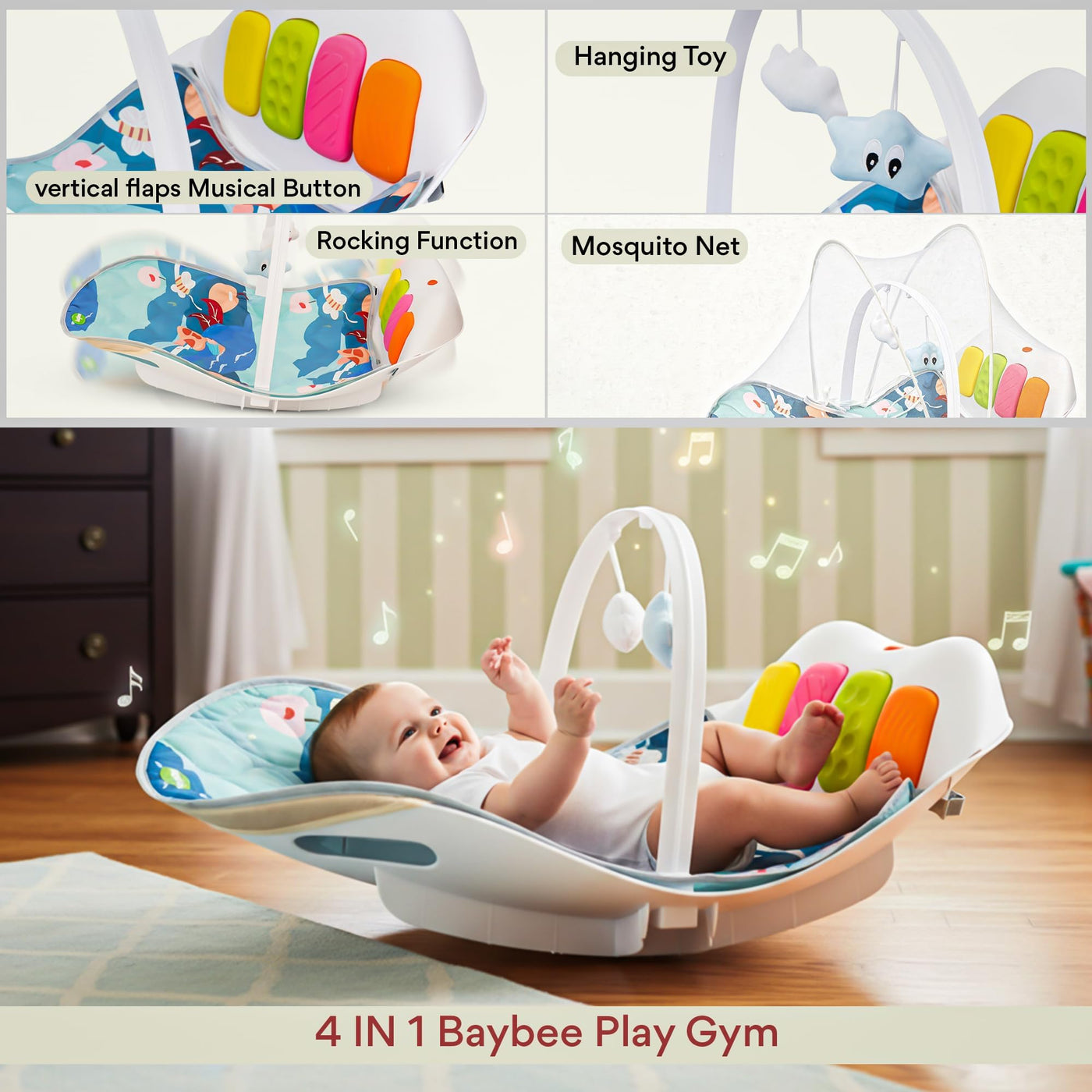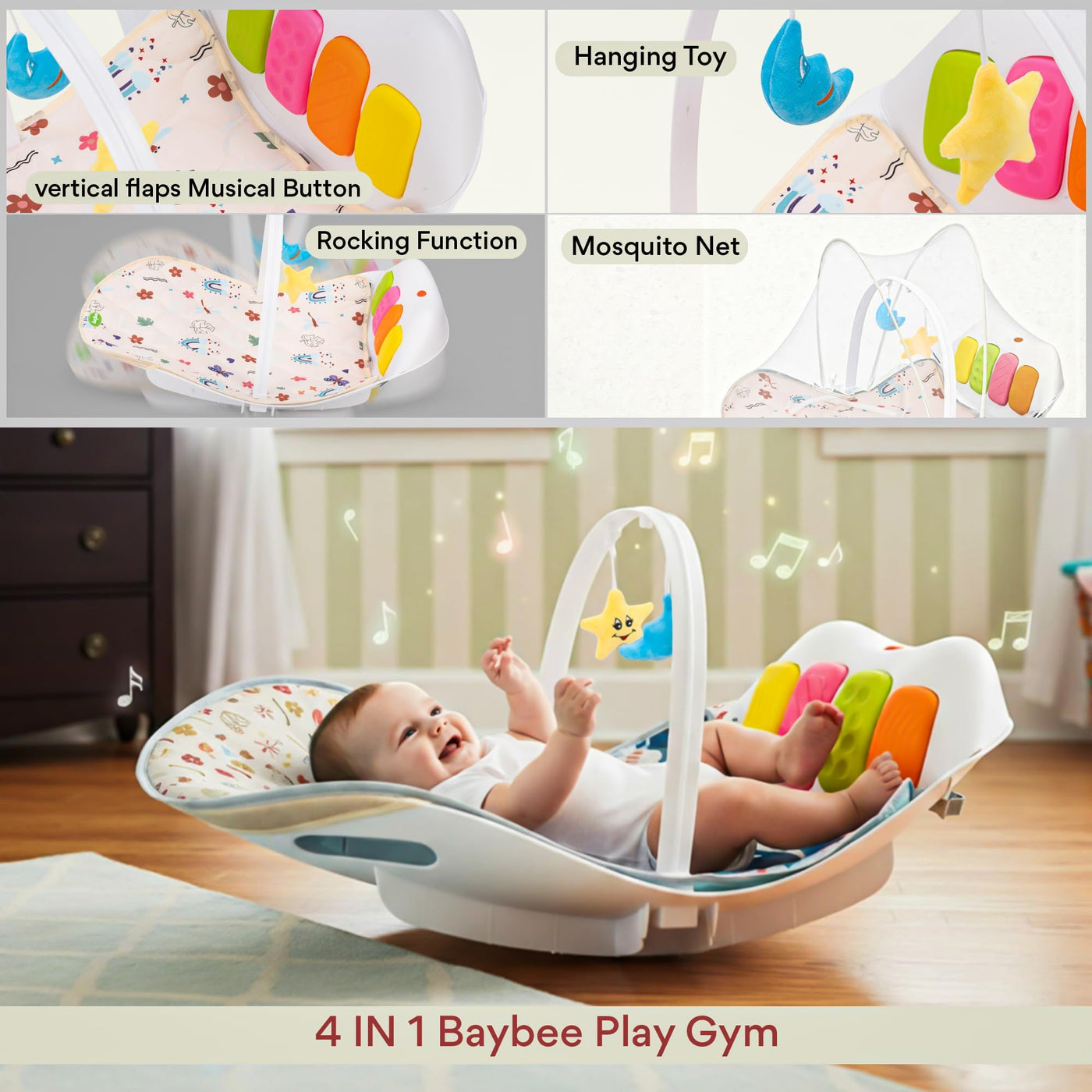 Give your baby a joyful, safe, and stimulating play environment with the Baybee 4 in 1 Multifunctional Play Gym Mat cum Rocker, specially designed for newborns and growing babies. This baby play gym combines comfort, learning, and fun in one smart design. The soft cushioned mat allows babies to lie comfortably, while the musical kick & play panel responds to baby’s movements, promoting sensory development, motor skills, and muscle strength. The rocking function gently soothes babies, making it ideal as a rocker for new born baby.