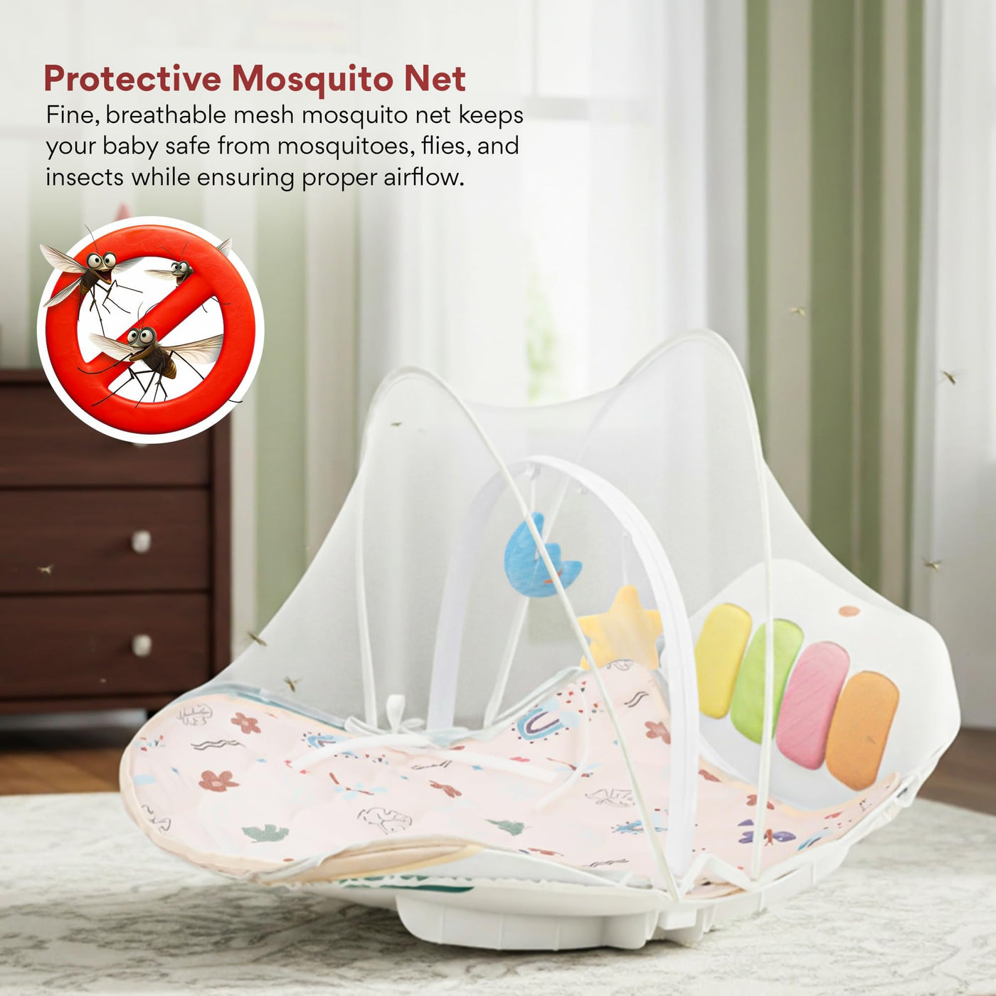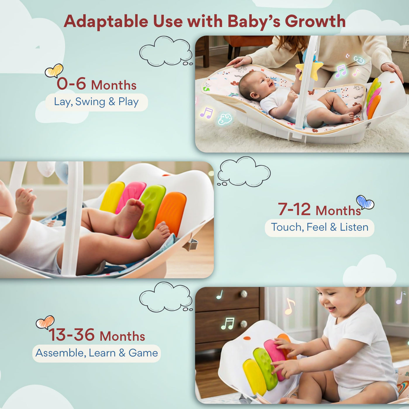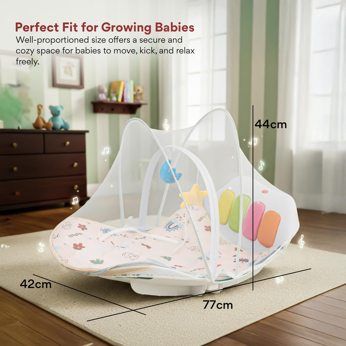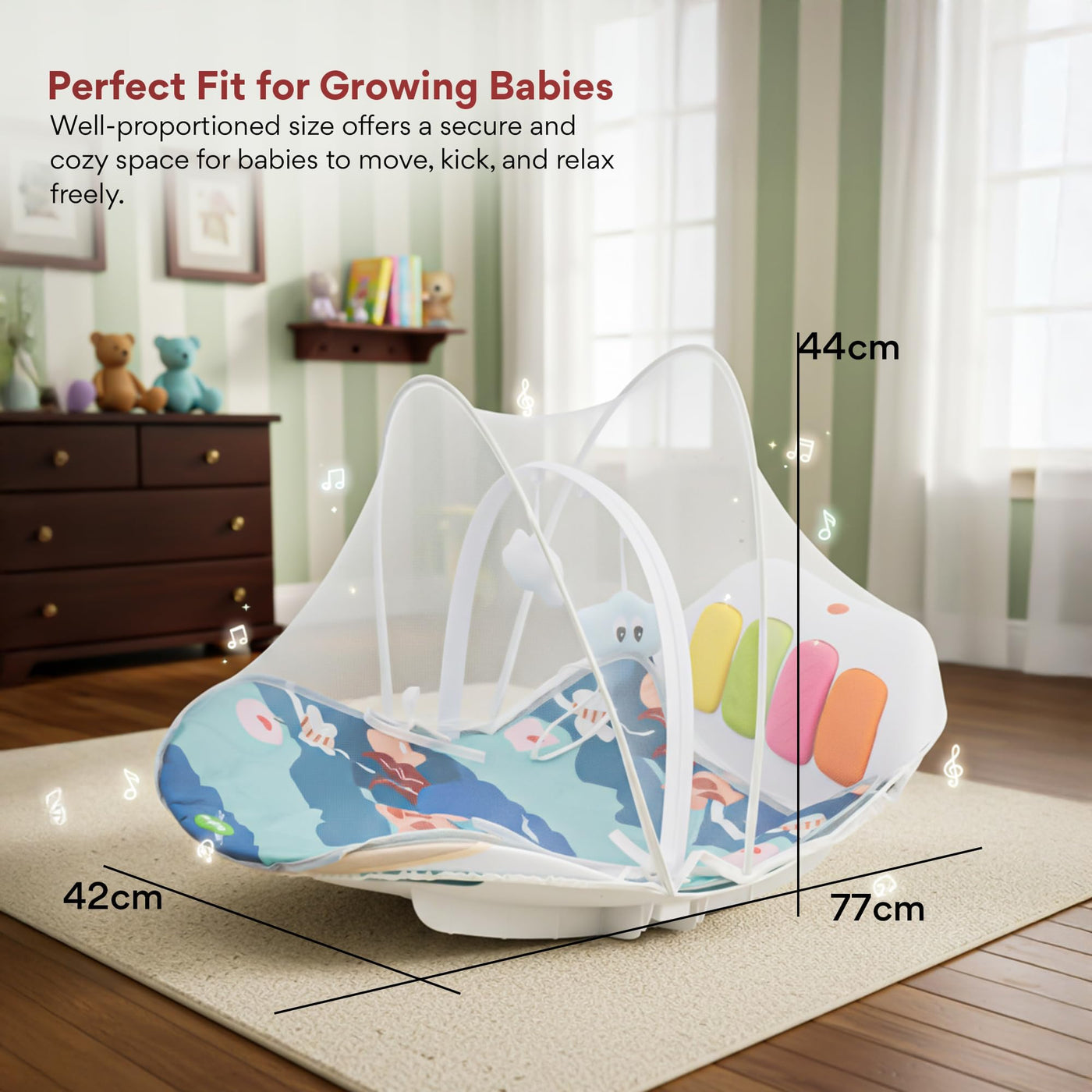 Give your baby a joyful, safe, and stimulating play environment with the Baybee 4 in 1 Multifunctional Play Gym Mat cum Rocker, specially designed for newborns and growing babies. This baby play gym combines comfort, learning, and fun in one smart design. The soft cushioned mat allows babies to lie comfortably, while the musical kick & play panel responds to baby’s movements, promoting sensory development, motor skills, and muscle strength. The rocking function gently soothes babies, making it ideal as a rocker for new born baby.