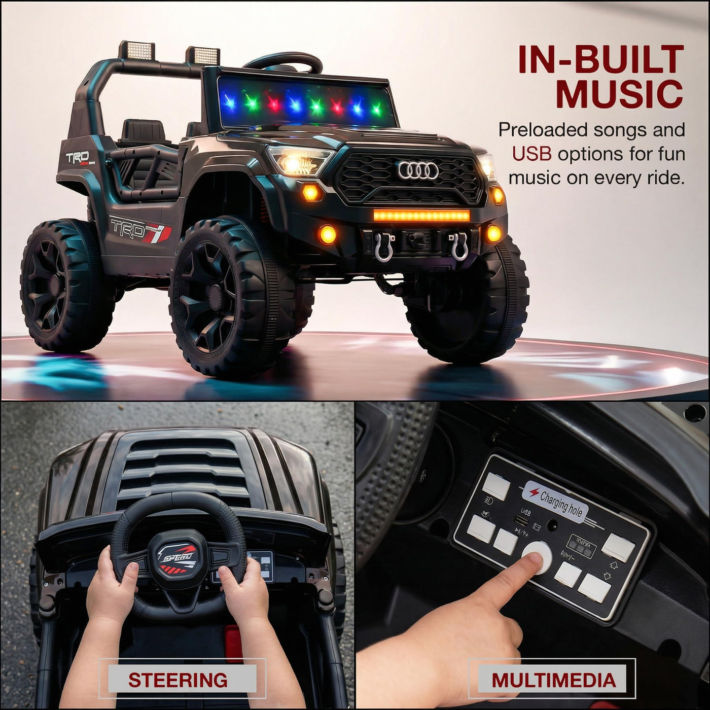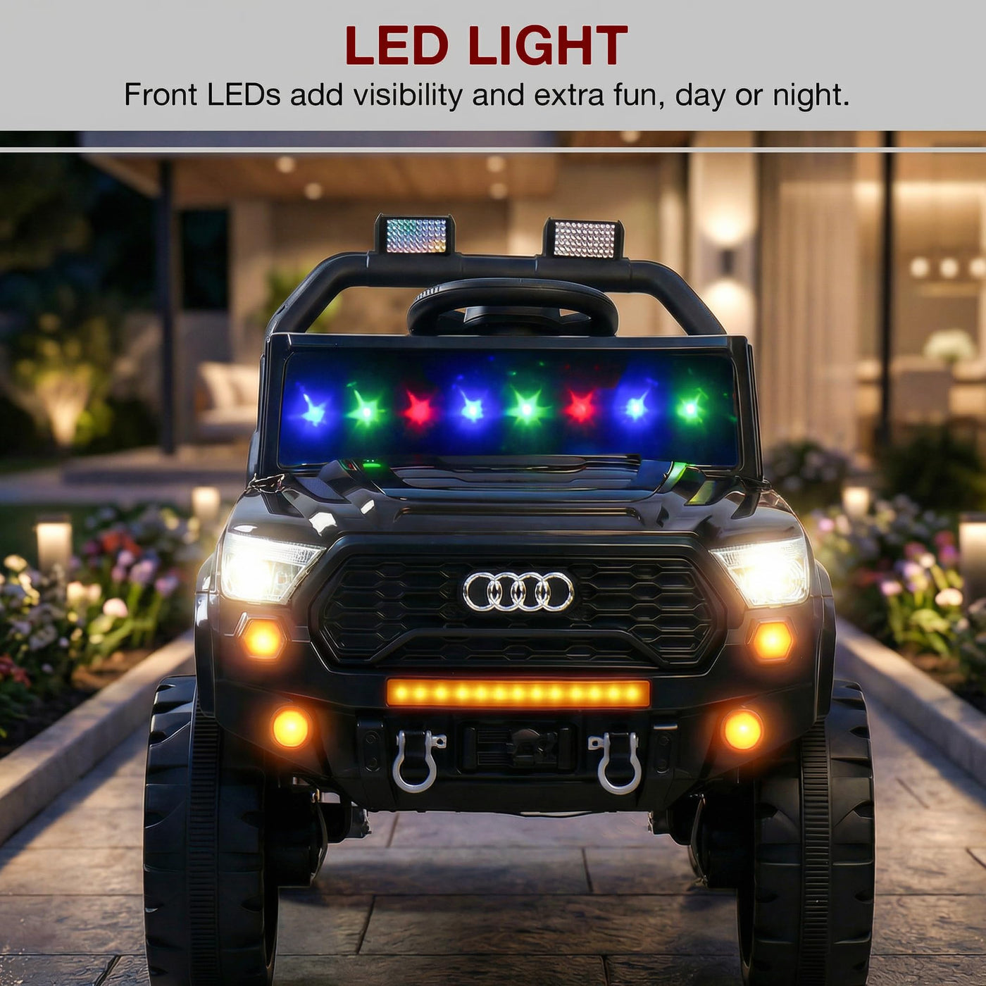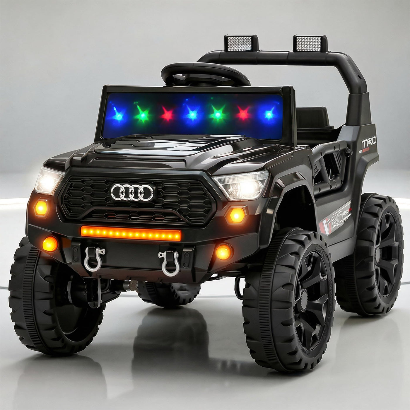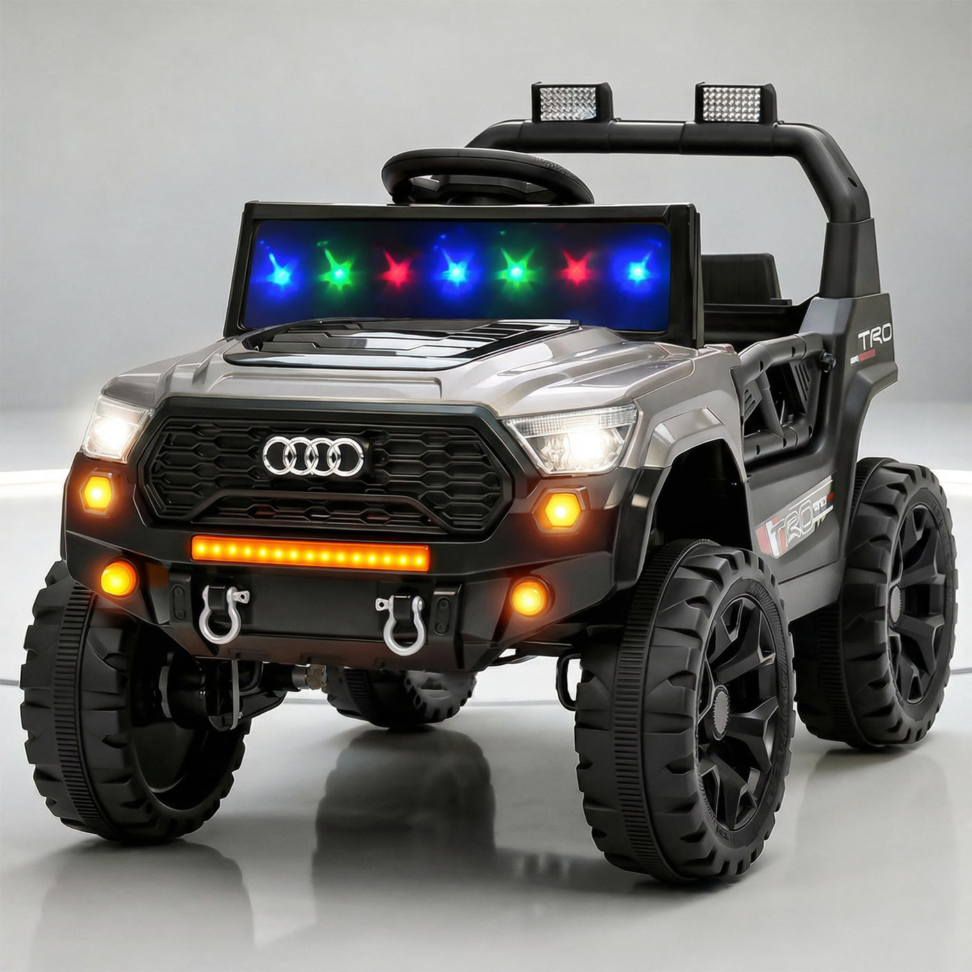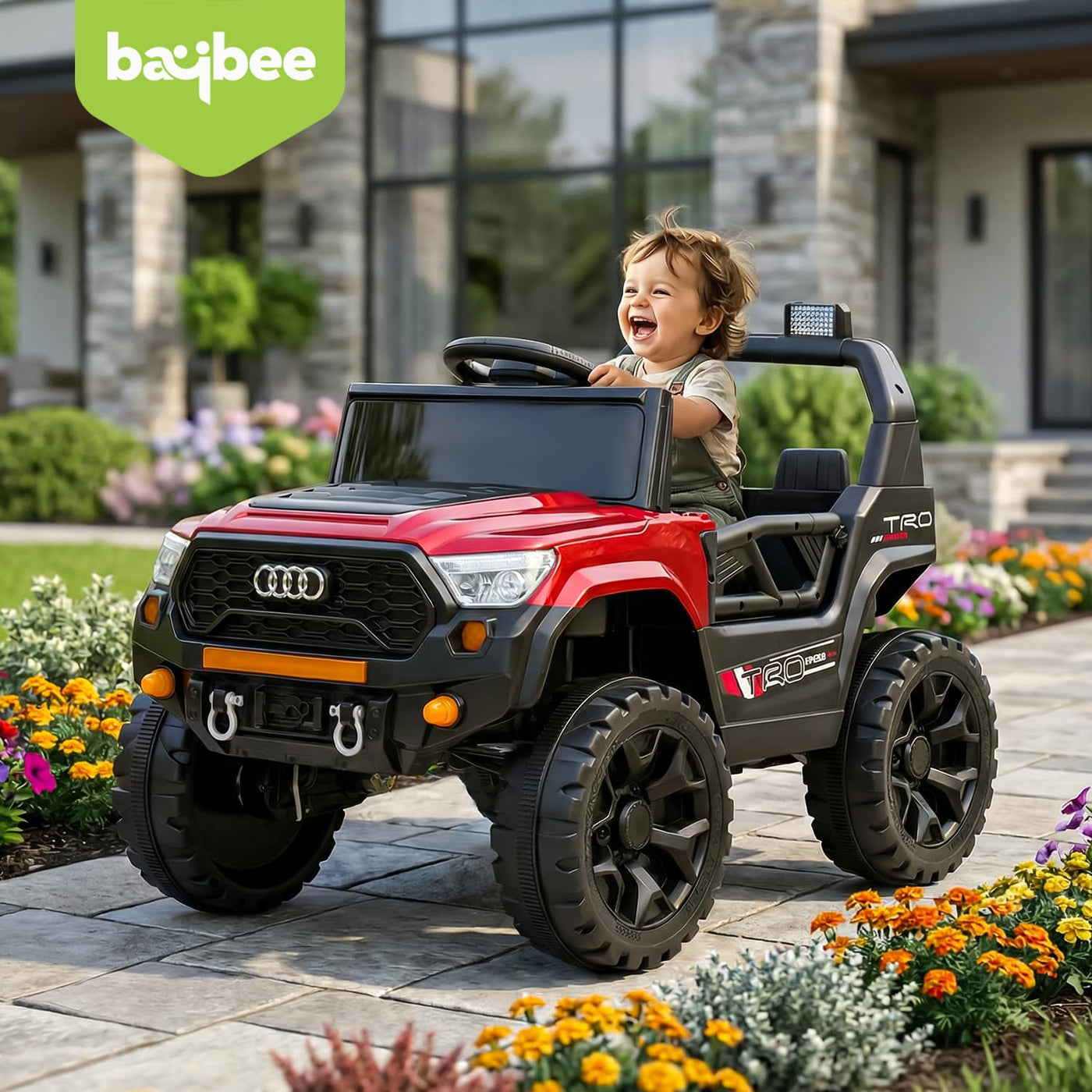 The Baybee RangerX battery car for kids offers dual driving modes for flexible fun. Parents can guide the ride using the remote, or children can independently drive their own jeep for kids to drive, improving coordination and building confidence safely. Designed as a stylish electric car for kids, this powerful jeep features RGB windshield lights, LED headlights and music connectivity.