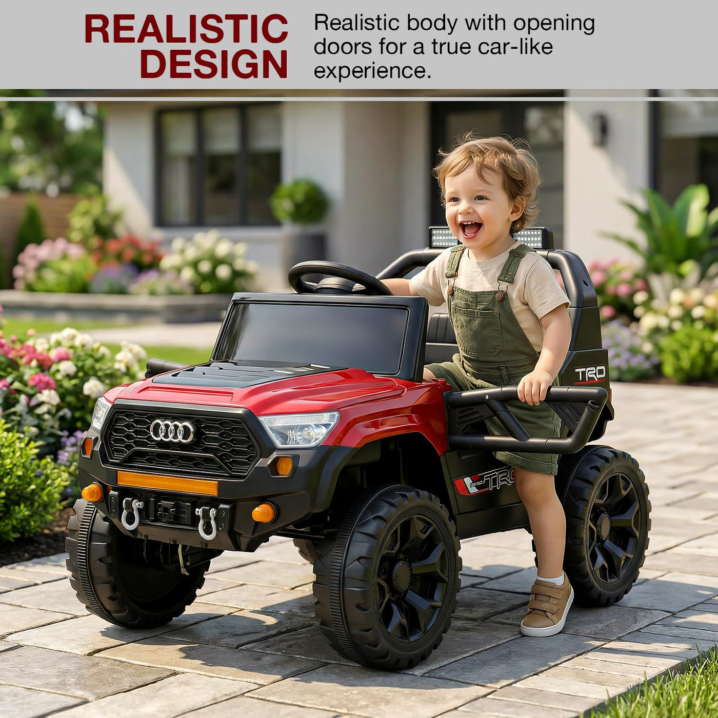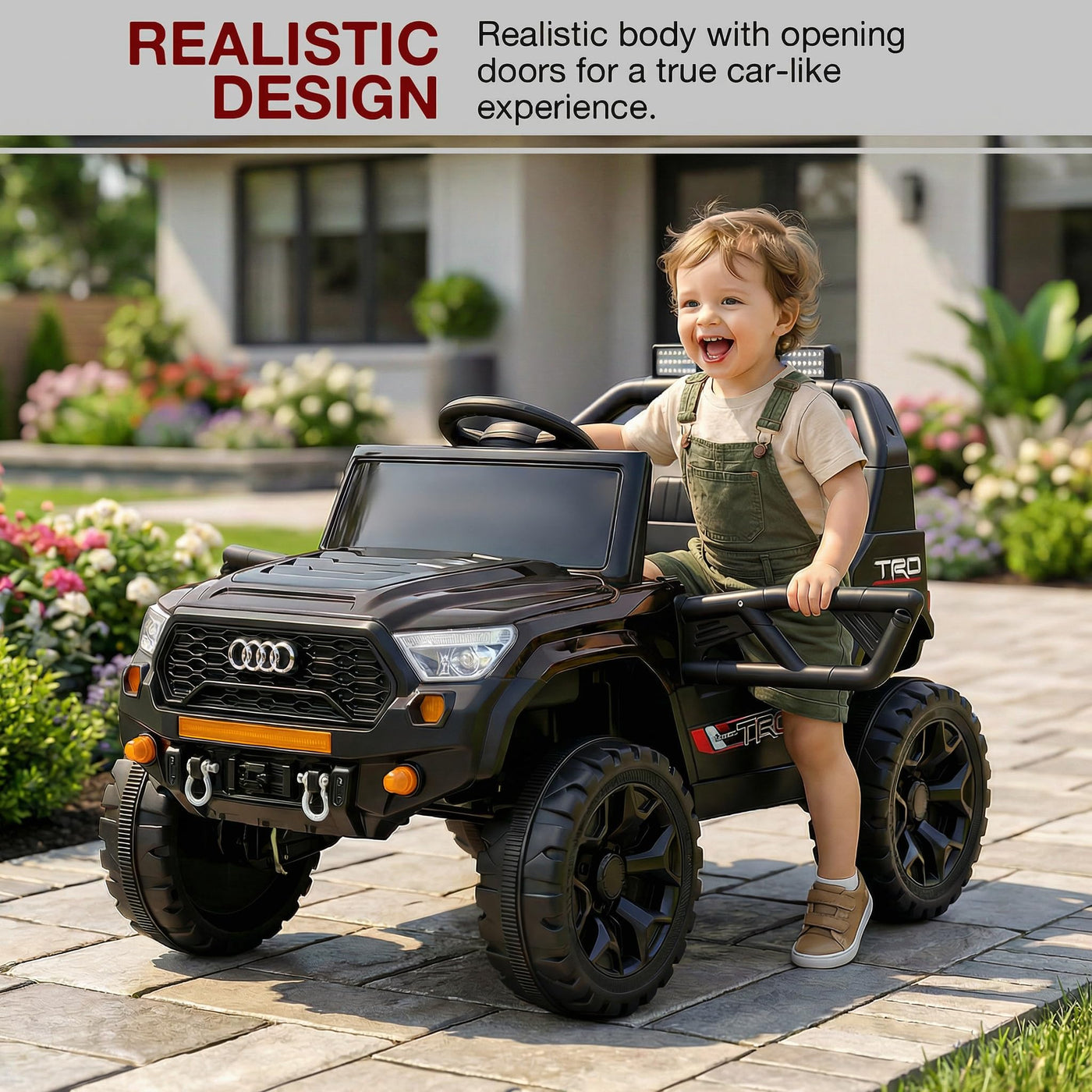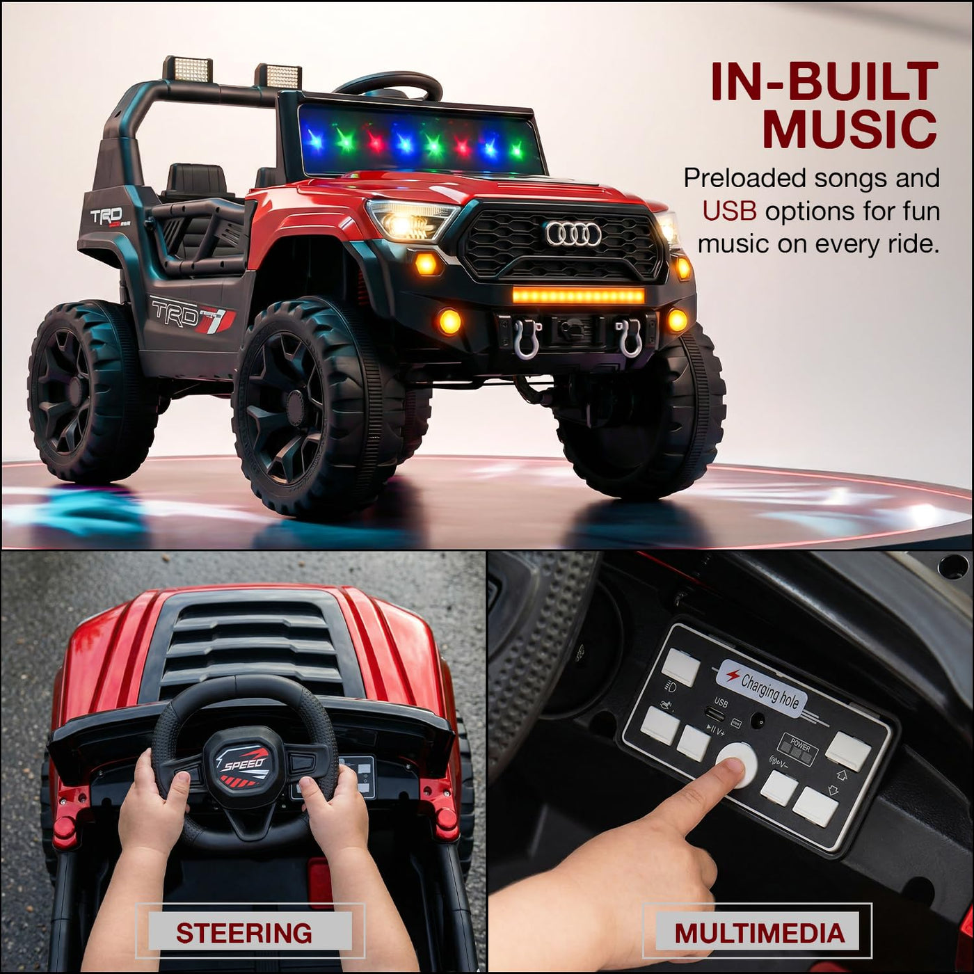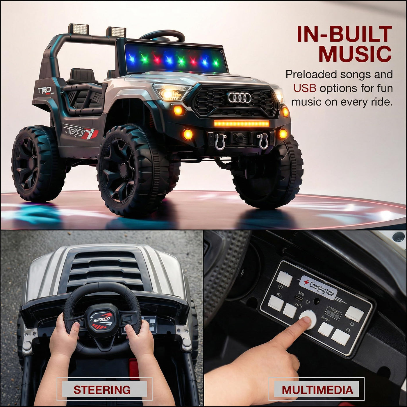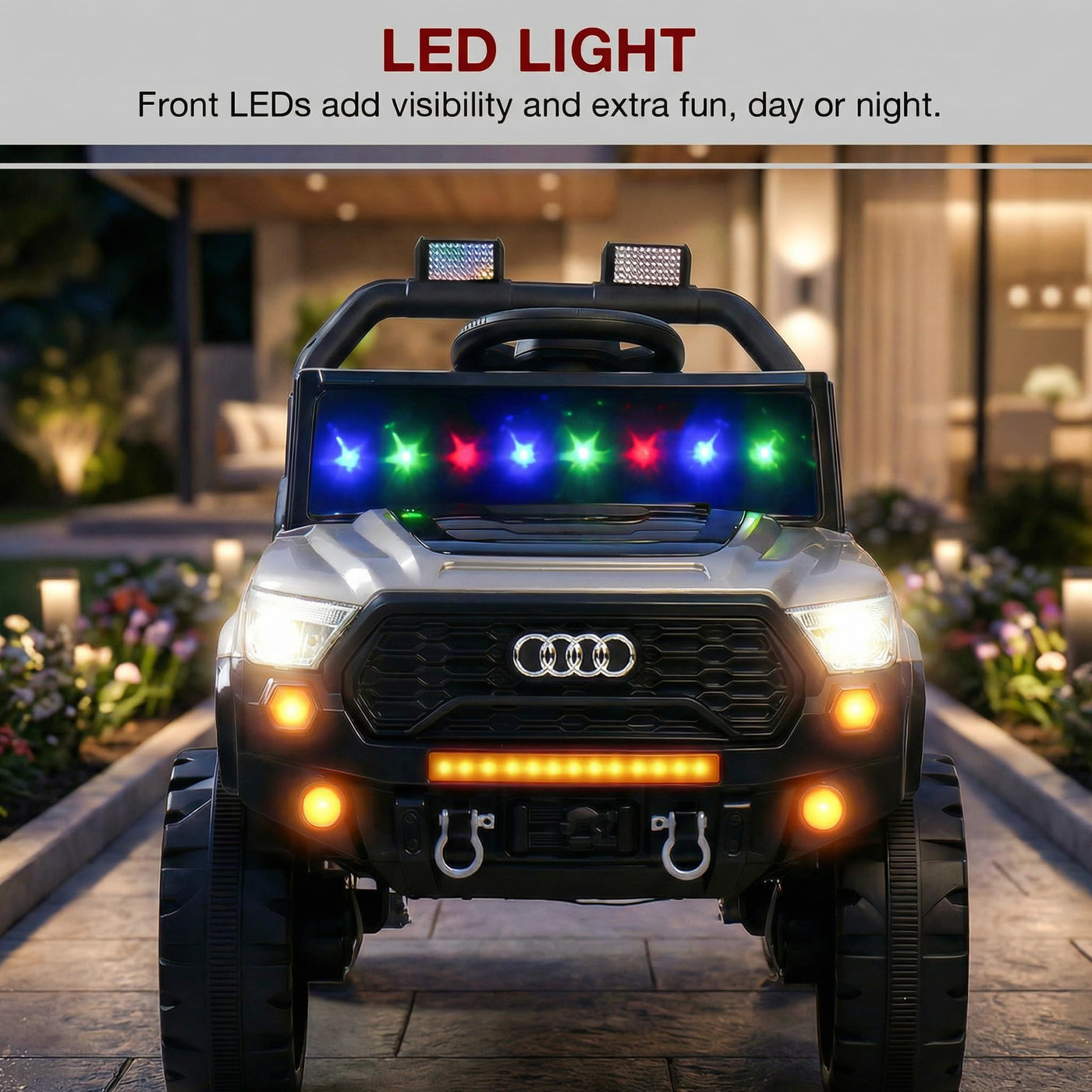The Baybee RangerX battery car for kids offers dual driving modes for flexible fun. Parents can guide the ride using the remote, or children can independently drive their own jeep for kids to drive, improving coordination and building confidence safely. Designed as a stylish electric car for kids, this powerful jeep features RGB windshield lights, LED headlights and music connectivity.
