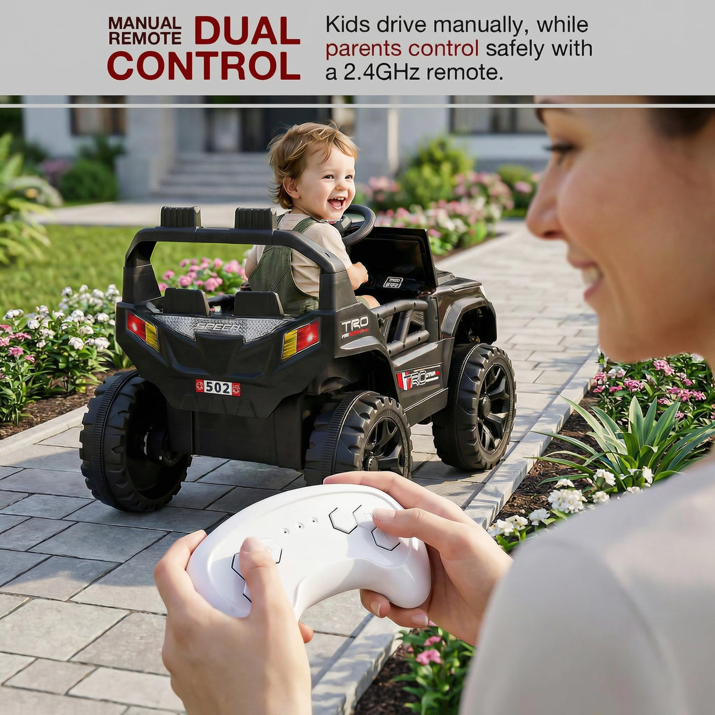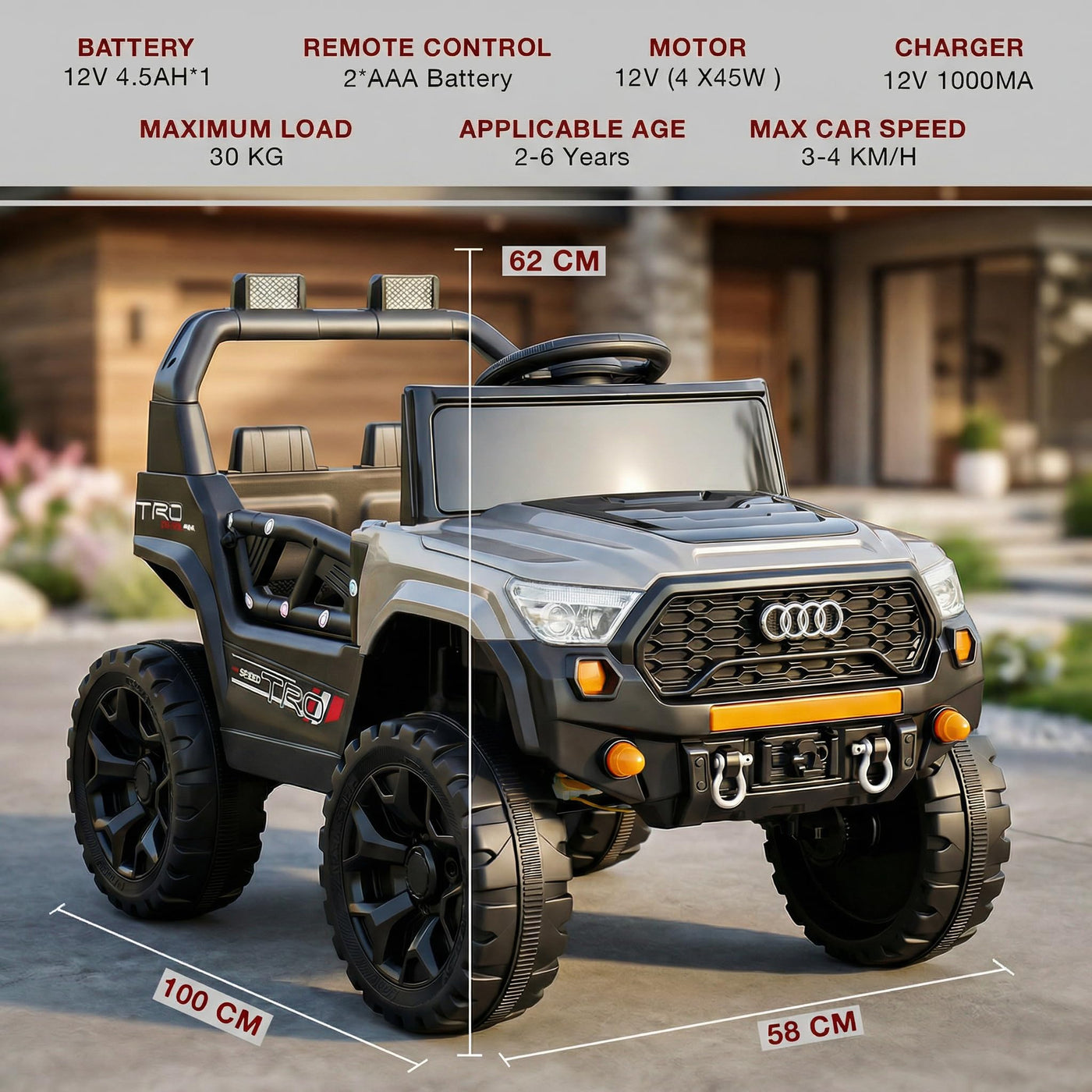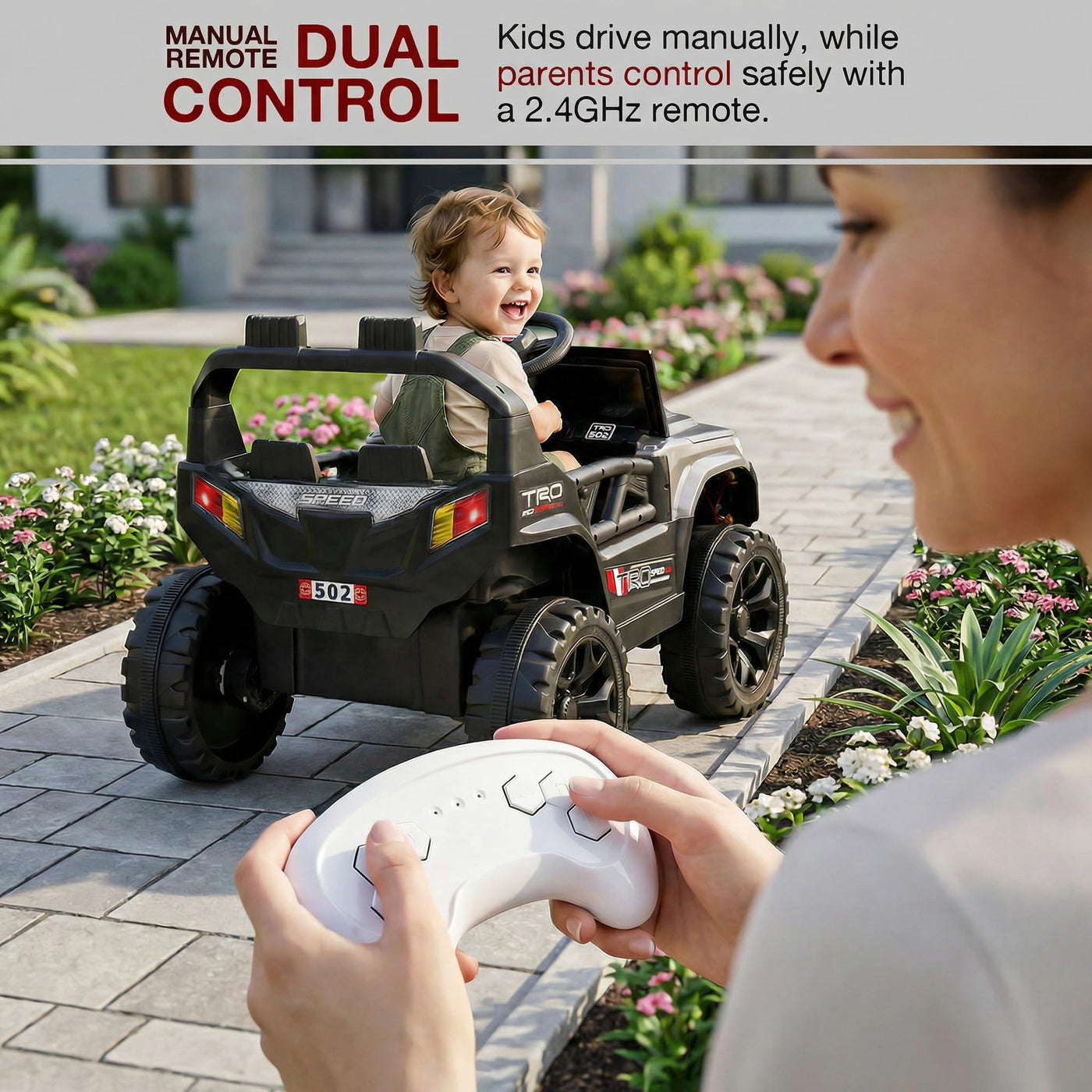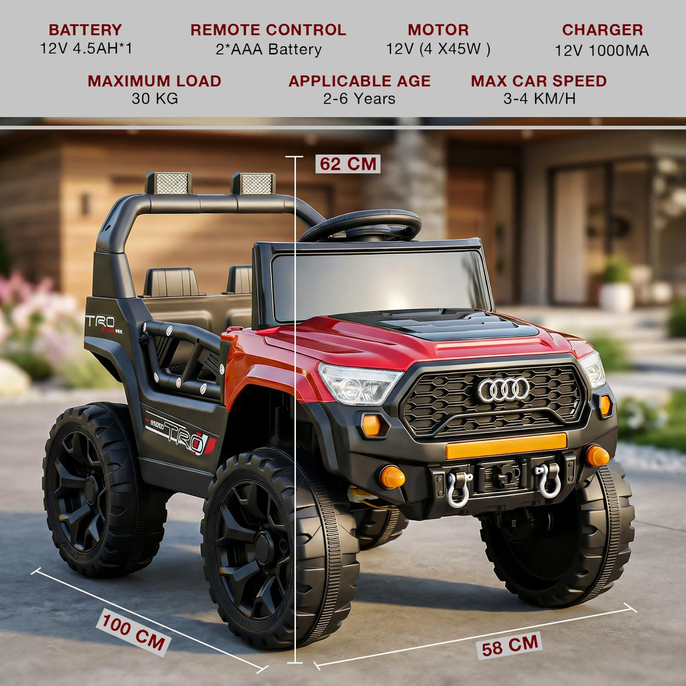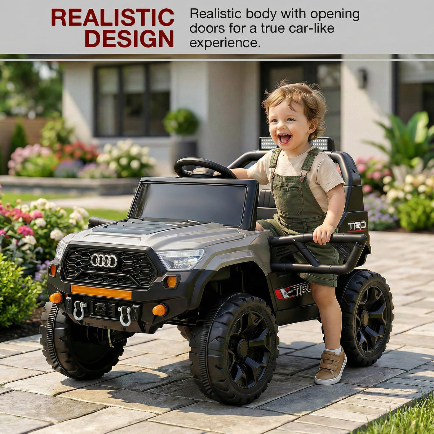 The Baybee RangerX battery car for kids offers dual driving modes for flexible fun. Parents can guide the ride using the remote, or children can independently drive their own jeep for kids to drive, improving coordination and building confidence safely. Designed as a stylish electric car for kids, this powerful jeep features RGB windshield lights, LED headlights and music connectivity.