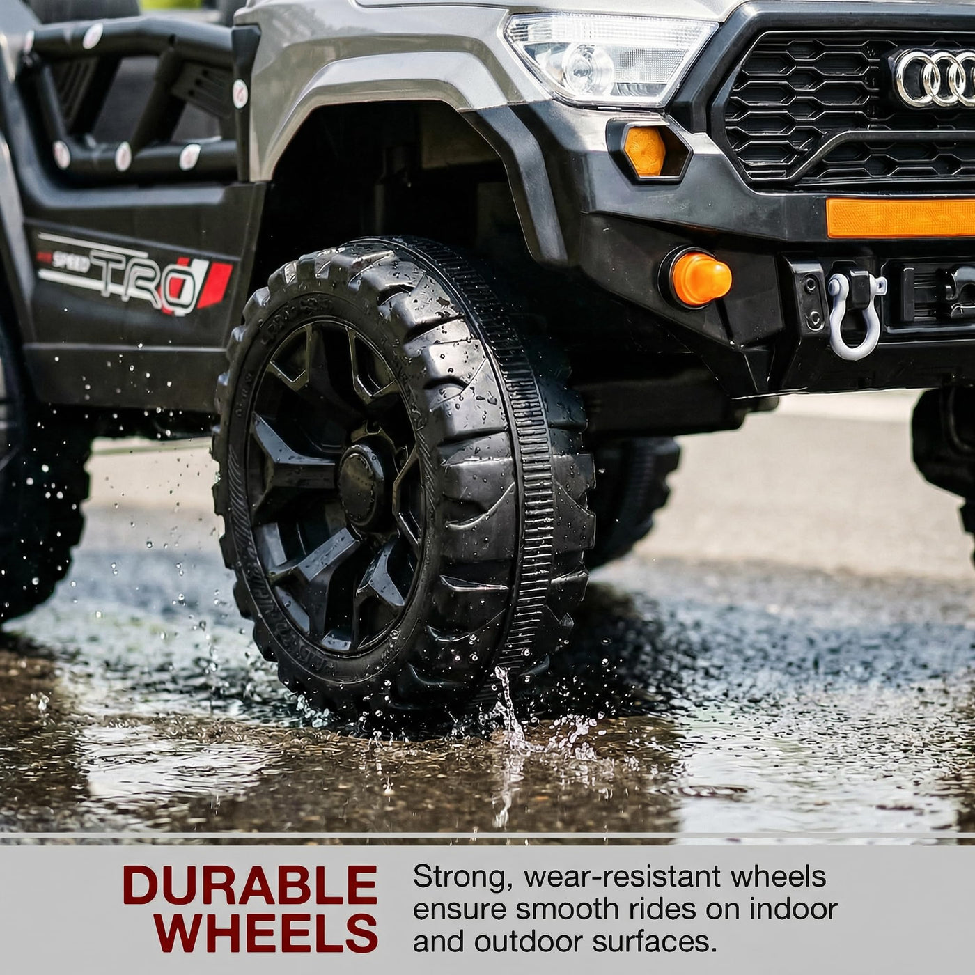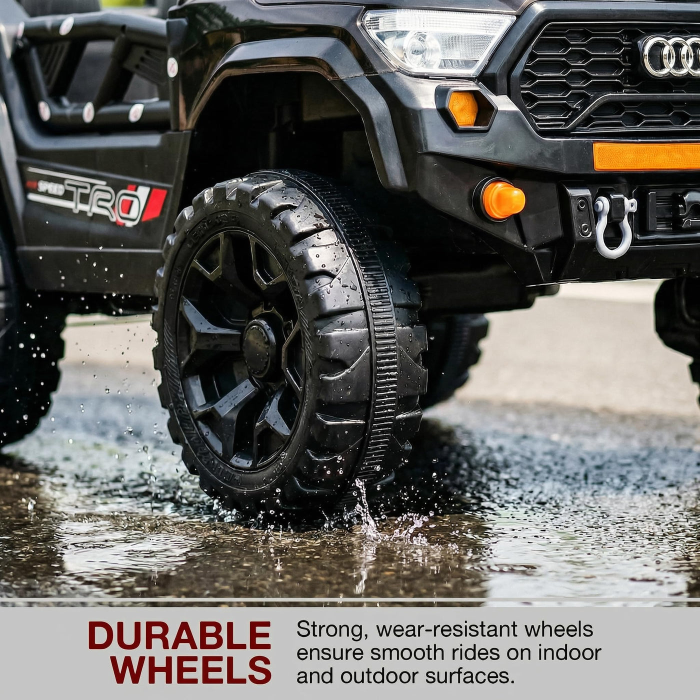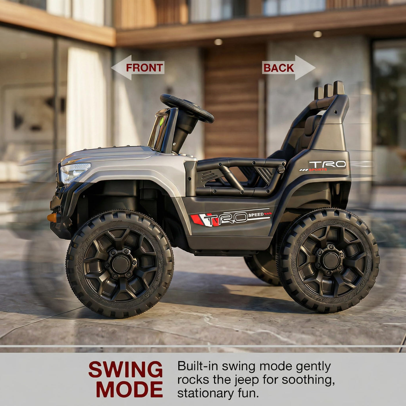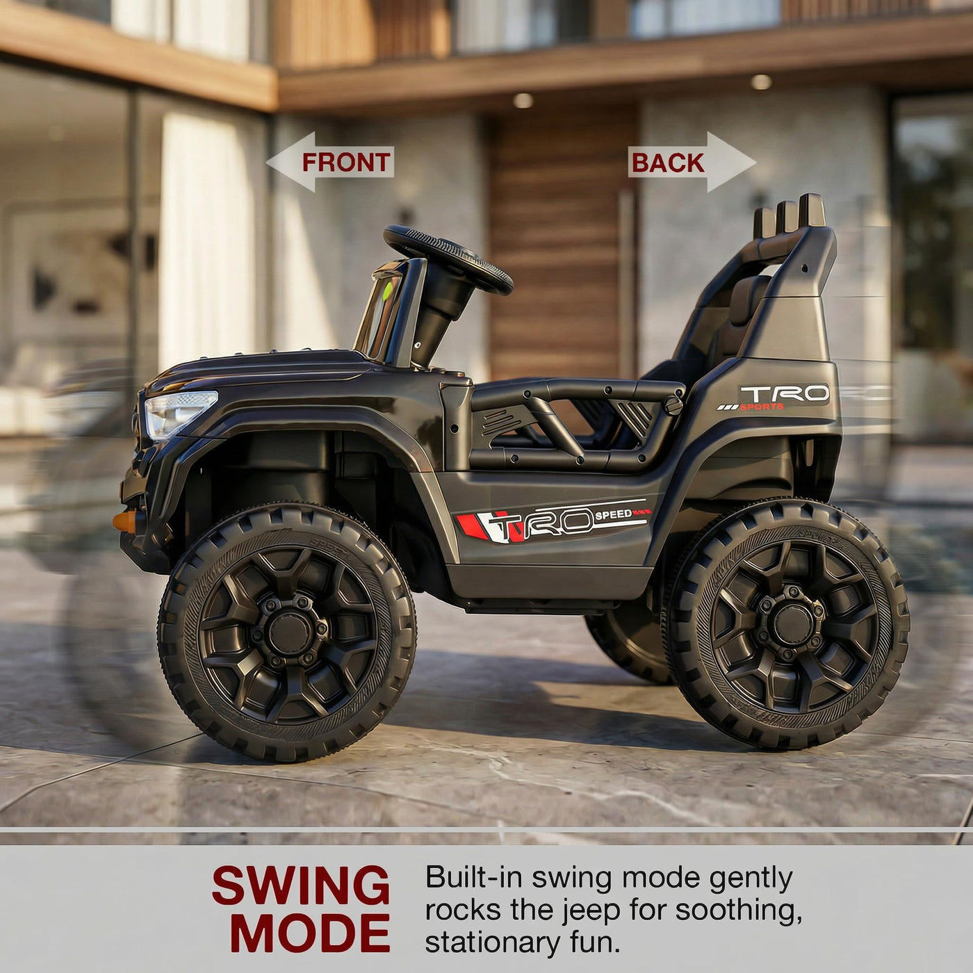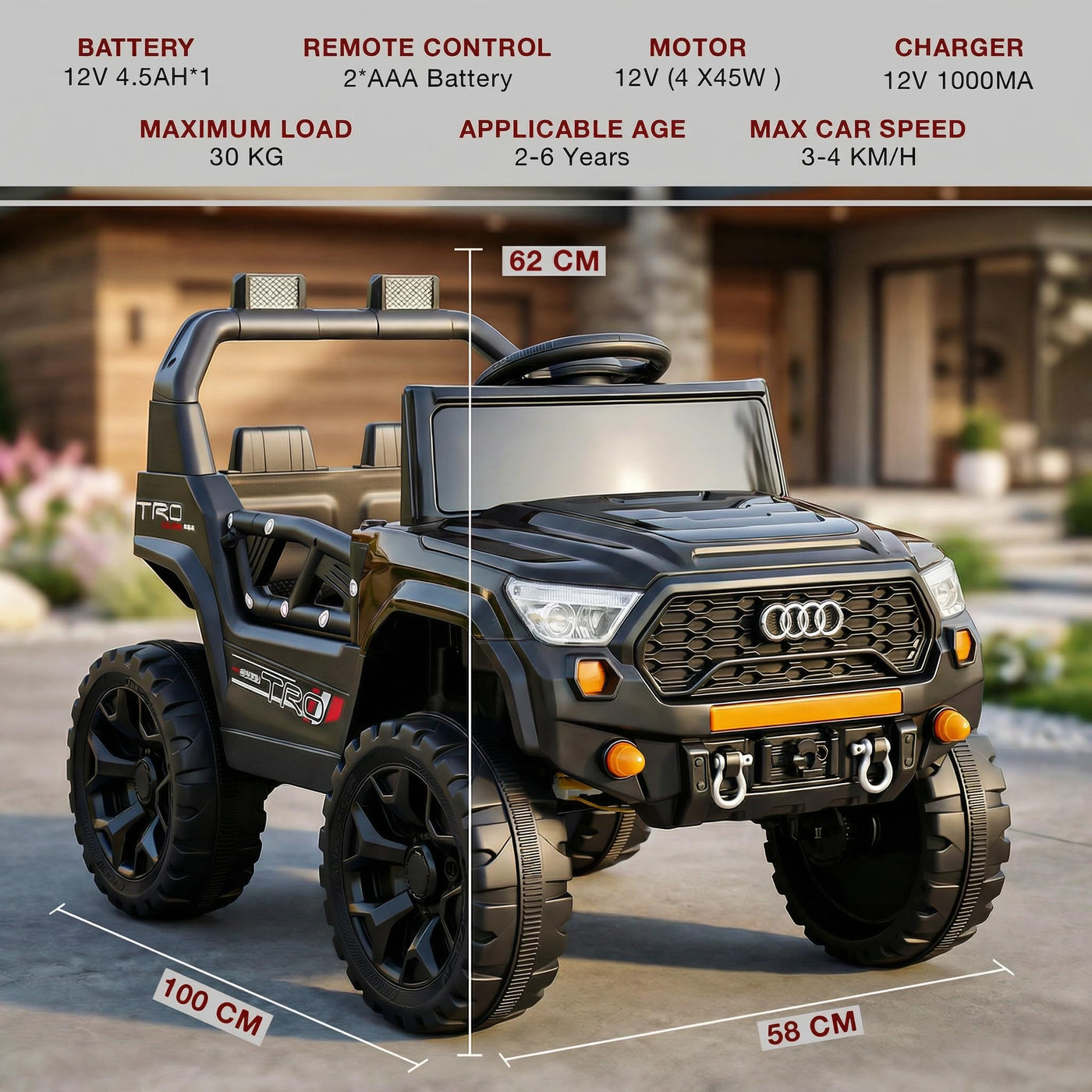 The Baybee RangerX battery car for kids offers dual driving modes for flexible fun. Parents can guide the ride using the remote, or children can independently drive their own jeep for kids to drive, improving coordination and building confidence safely. Designed as a stylish electric car for kids, this powerful jeep features RGB windshield lights, LED headlights and music connectivity.