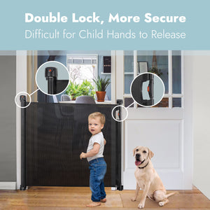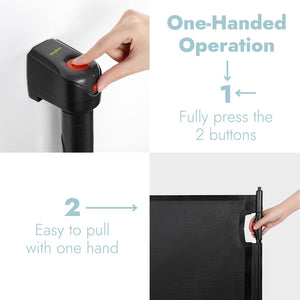 This Baybee Extra-Tall and Wide Outdoor Retractable Baby Gate extends up to 140CM wide and is 83CM tall, suitable for many places indoors and outdoor. By choosing this extra-wide gate, you won't worry about taking up any space when your baby or pets are not at home. The mesh lining can be directly rolled up, saving you space. It is perfect for 6~24 months babies, child gates for stairs, with a strong mesh, will keep babies away from hazardous stairs and off-limits areas, and provide good protection. A versatile home safety solution, allowing easy use in high traffic areas without the trouble of disassembly. For small breed dogs. Retractable gate, easy to lock and open. The one-handed operation allows you to open and close while holding your child, simple 2-step operation: 1. Push, twist, and release the button; 2. Pull the handle to extend the gate, when the handle is released the gate automatically locks the release mechanism.