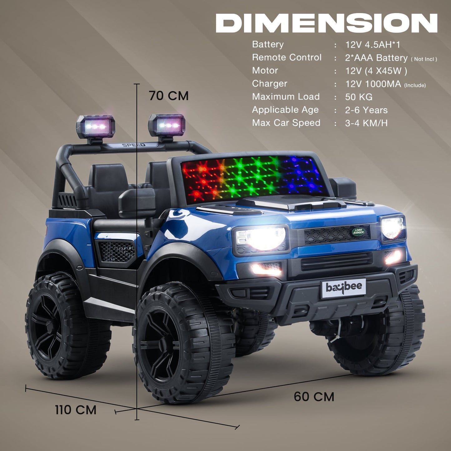 The Baybee Rover Electric Car for kids is the ultimate combination of fun, safety, and durability, providing an exciting and interactive ride. Designed with two driving options, parents can control the car using a 2.4G wireless remote, or kids can drive independently, enhancing hand-eye-foot coordination while enjoying a safe and thrilling driving experience. The car is packed with realistic features such as Swing Mode, a horn, RGB Windshield, LED headlights, and Bluetooth, USB, and Aux connectivity, offering endless entertainment with music and stories during every ride. The Rover is designed with safety in mind, incorporating a slow start mechanism to prevent sudden jolts and ensuring smooth turns with its easy-to-control steering wheel. The wear-resistant seats and sturdy wheels allow it to handle various terrains, making it perfect for outdoor adventures. Powered by a 12V 4.5AH battery, the Rover offers up to 40 minutes of continuous playtime, allowing kids to enjoy long-lasting fun, whether cruising around the neighborhood or exploring off-road trails. Additionally, the car is easy to assemble, with a simple manual that allows parents to set it up quickly and get their child ready for an exciting driving experience. The Baybee Rover Electric Car is a perfect choice for adventurous kids, offering a safe, fun, and durable ride.