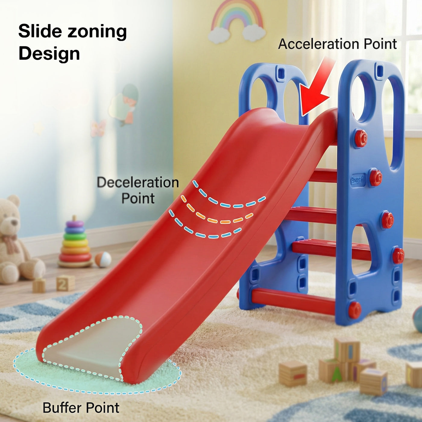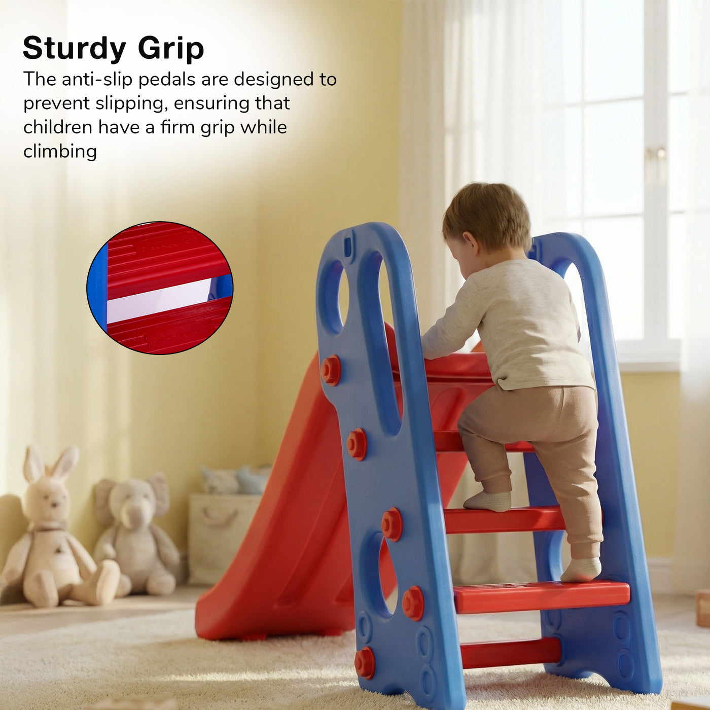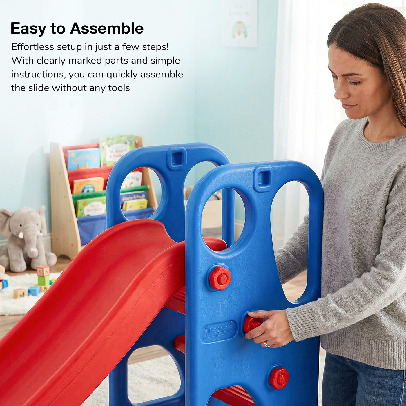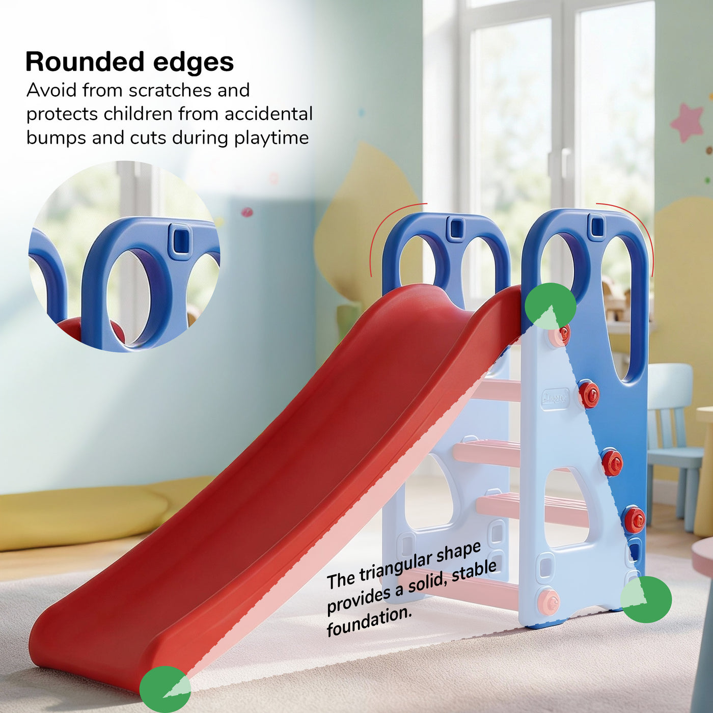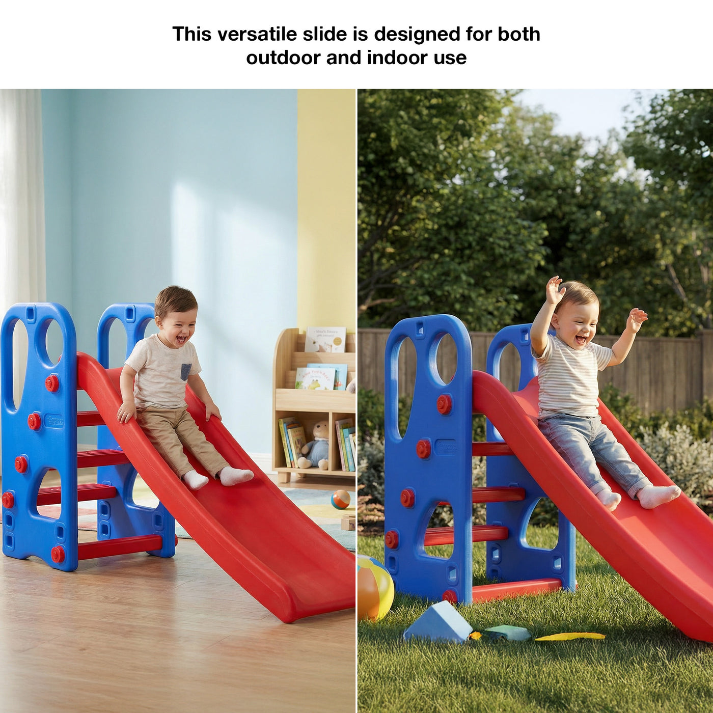 The Baybee Slider offers multiple play options with an extended slide, basketball hoop, and ring toss game, ensuring hours of entertainment and skill development for toddlers. Compact & Portable: Featuring a foldable design, this slider is perfect for easy storage and portability, ideal for space-constrained indoor and outdoor settings, ensuring playtime is possible anywhere, anytime. Safety First: Equipped with anti-slip steps and smooth, high side barriers, this slider ensures a safe play environment for kids aged 2 to 5. Parents can relax knowing their little ones are secure during play. Durable Materials: Crafted from high-quality, non-toxic materials, the slider is built to withstand the rough and tumble of kids' play. It's a durable and safe choice for energetic young ones. Enhances Development: This playset is not just about fun; it also helps children develop physical coordination, fine motor skills, and social skills as they engage in active play and teamwork with peers.