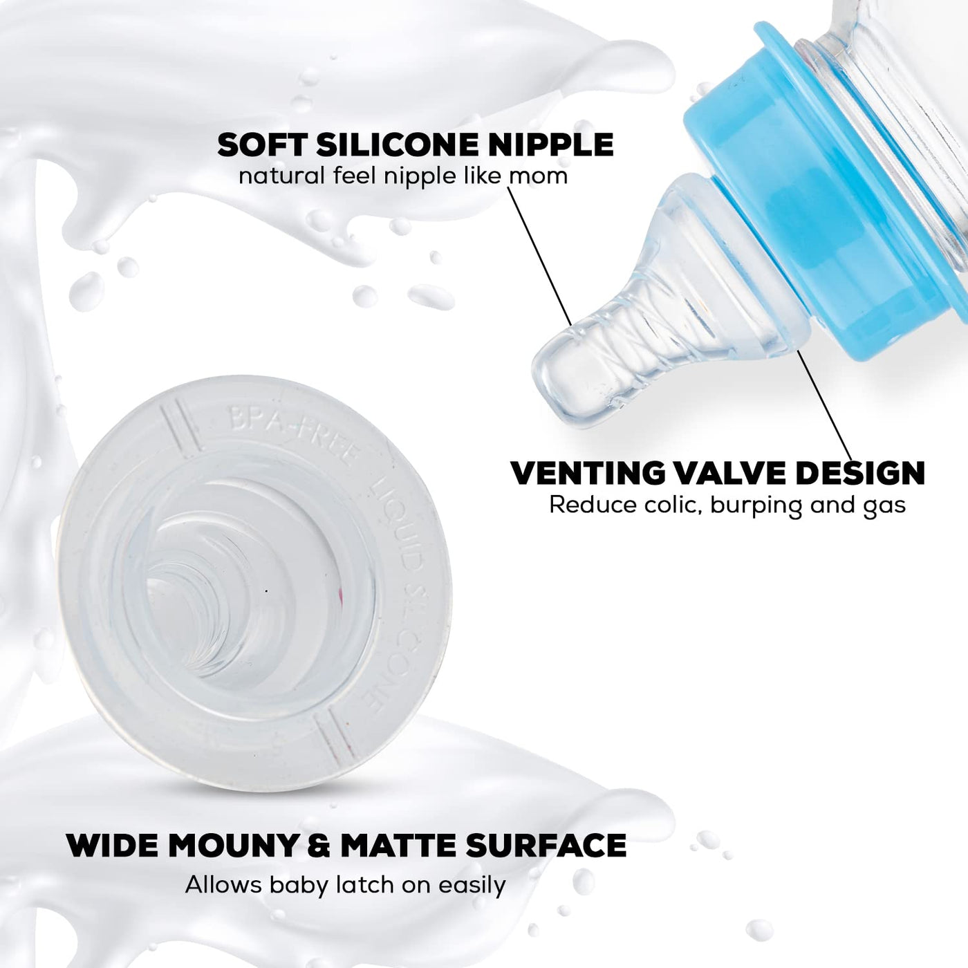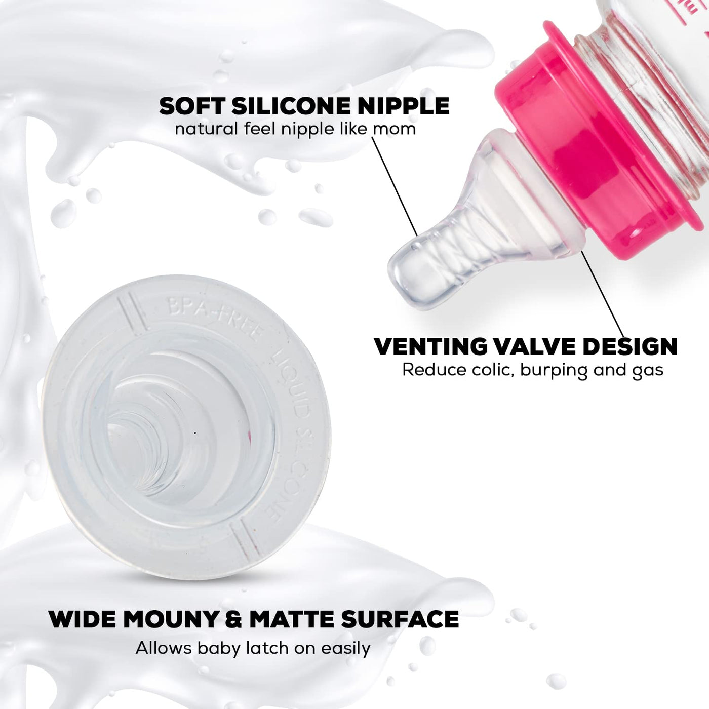 Our 250ml baby feeding bottle is made up of safe & non-toxic, chemical-free, BPA-free food-grade material with a soft silicone tip for safety and durability. the Glass feeding bottle can withstand high temperatures and never lose its shape. It is Suitable for 3+months babies. The soft silicone nipple feels like skin, and gently elongates and flexes during feeding. The naturally shaped nipple with a Slim Necked and matte surface allows the baby to latch on easily without getting tired or slipping to the nipple tip. Our Natural Wave nipples are designed to reduce intake of air and potential causes of gas associated with colic to help baby while bottle feeding, a potential cause of colic. A tight fitting lid that's perfect for travel keeps the nipple clean and prevents leakage, with easy-to-read measurement markings. Nipples are specially designed to naturally fit the baby's mouth. Holds pre-measured quantity to ensure the correct amount of formula for each feed. This bottle can be used to give expressed milk or prepared infant formula to your baby. Sterilize the bottle & accessories by placing them in a sterilizer or bottle warmer for at least 10 mins. Always wash immediately after every use Keep the teat in a dry & covered container.
