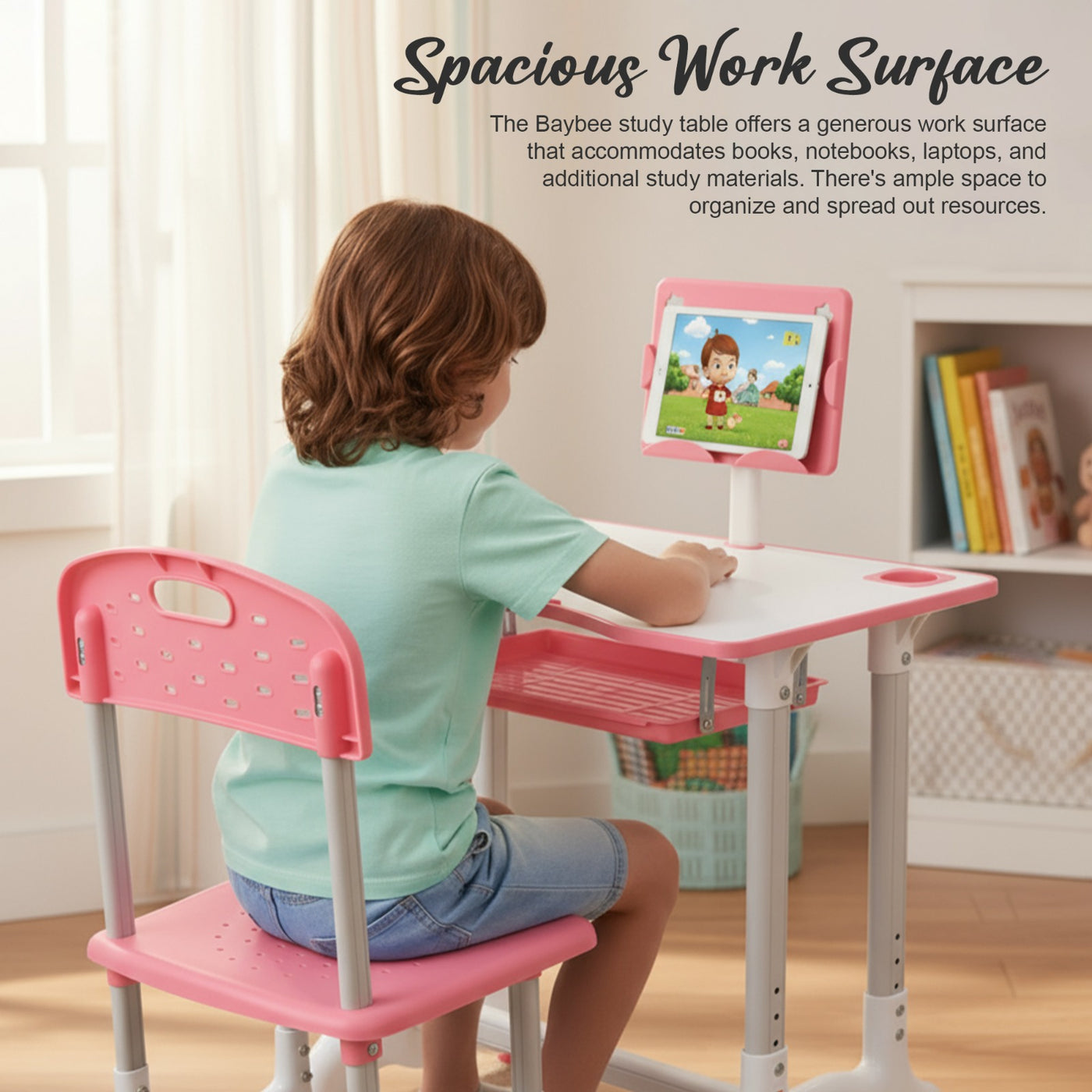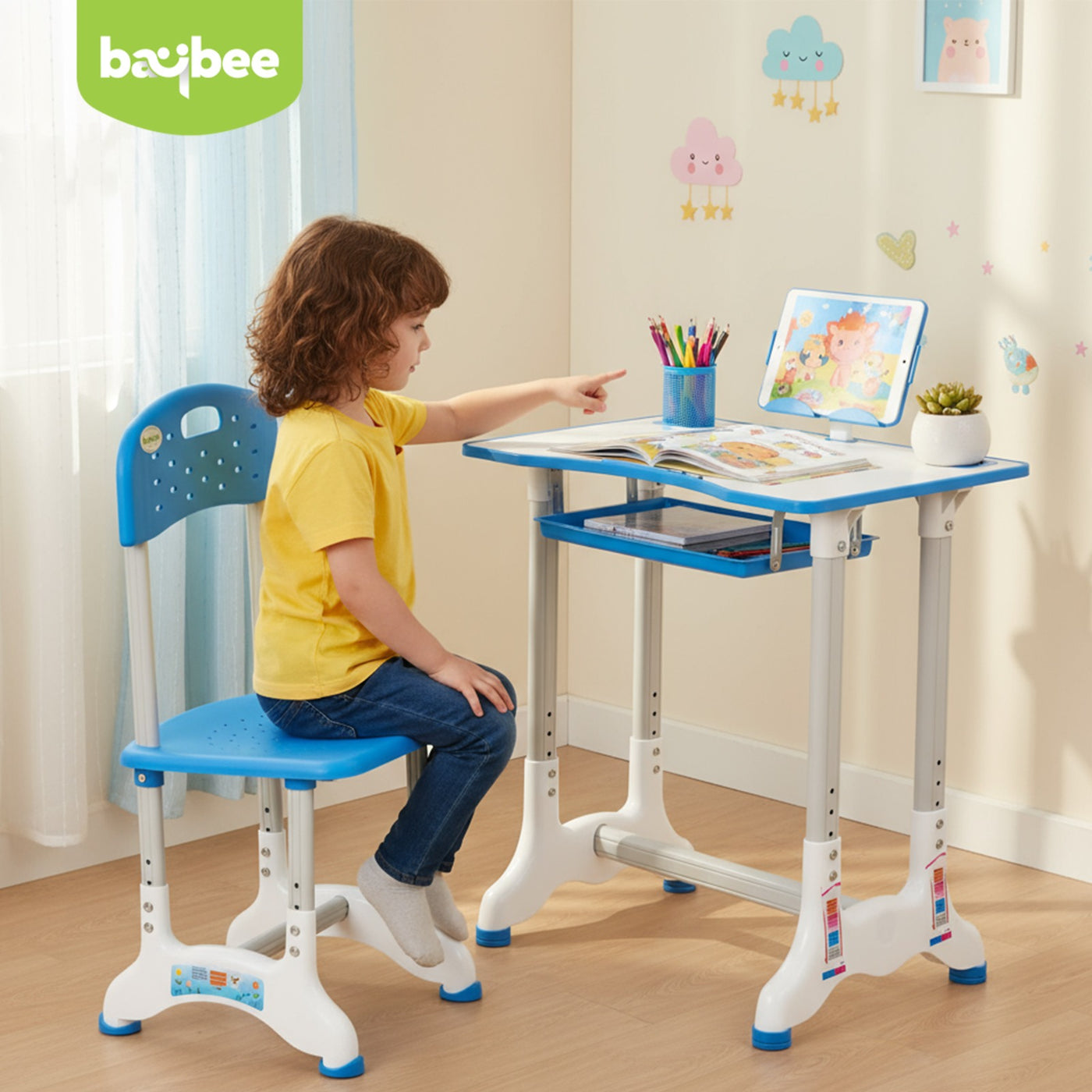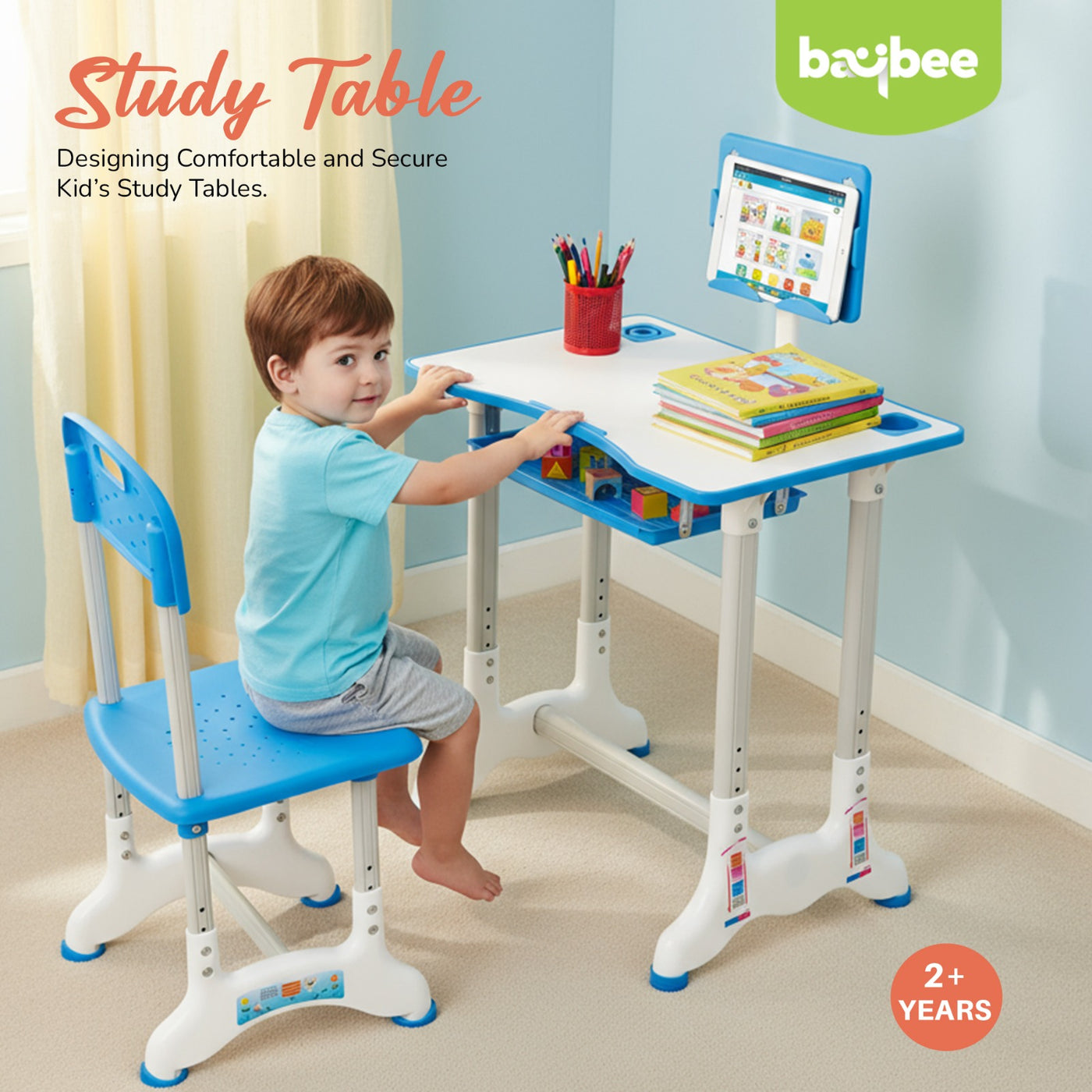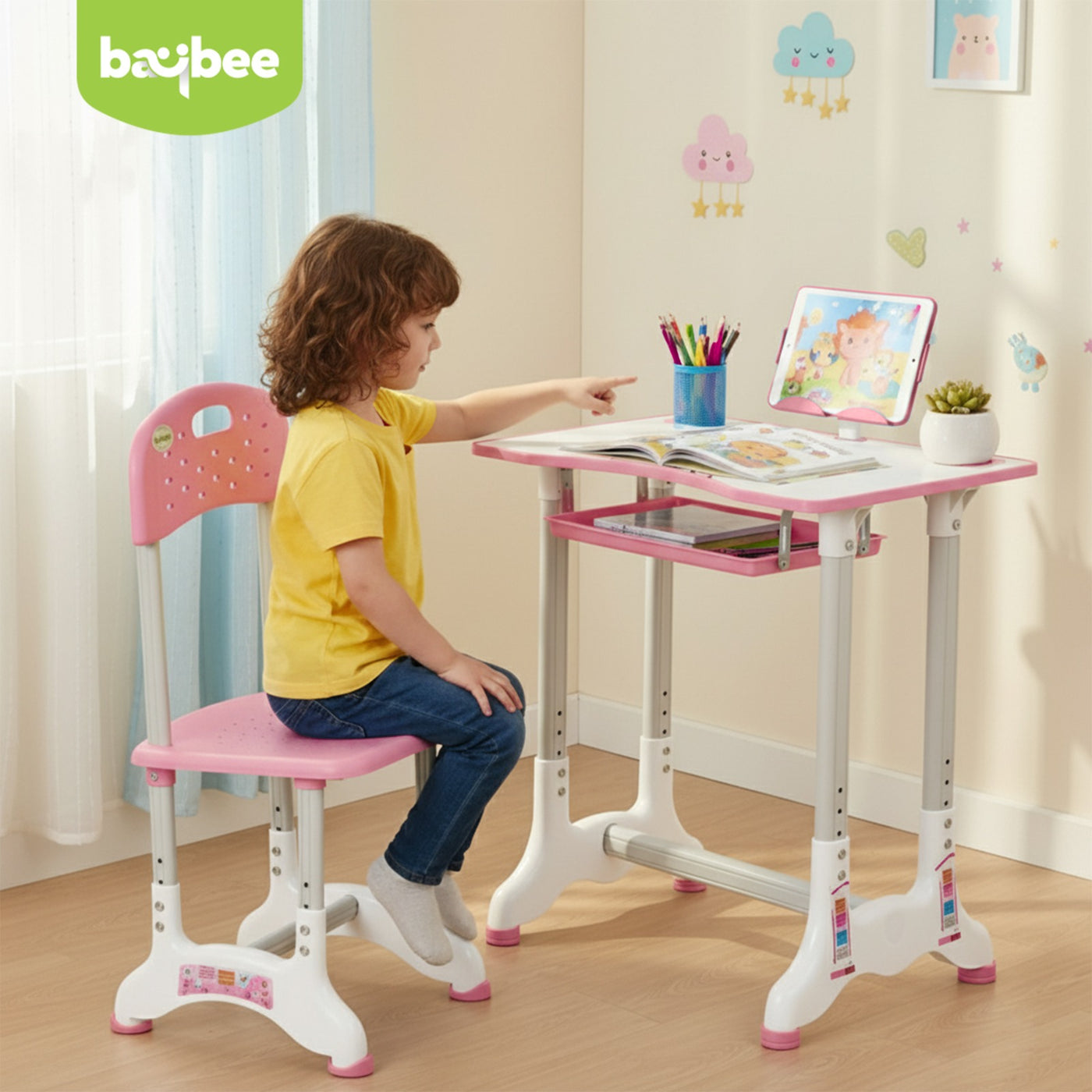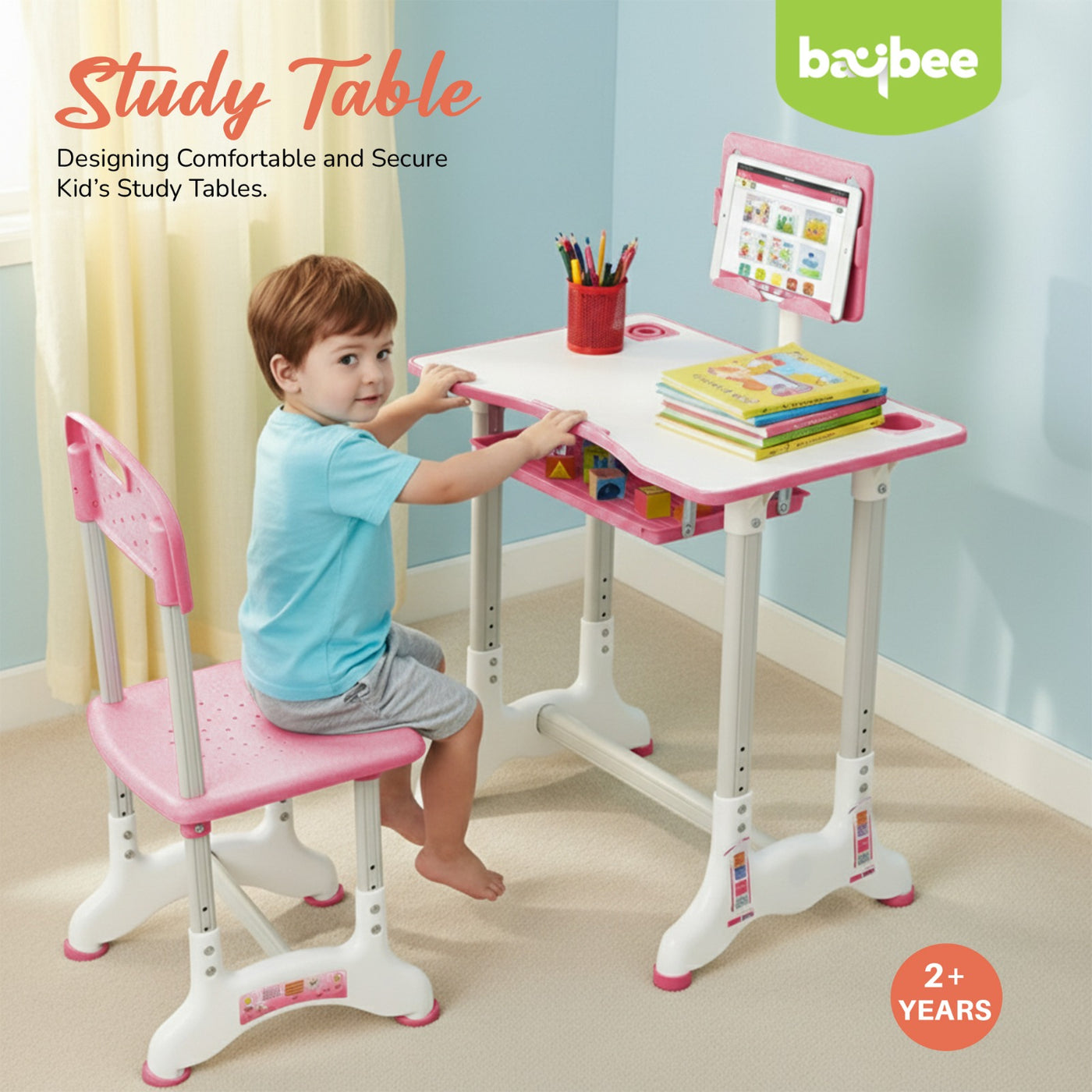 Introducing the Baybee High Adjustable Study Table Set for Kids with Chair, a multifunctional and portable solution designed to enhance your child's learning experience! Specially crafted with the needs of growing minds in mind, this set offers a comfortable and dynamic workspace for boys and girls alike. The study table features an innovative height adjustment mechanism, allowing it to grow with your child. Whether your little one is starting kindergarten or entering their pre-teen years, this table can adapt to their height for a perfect fit. Additionally, the tiltable desktop offers a versatile angle, ensuring an ideal reading and writing position, reducing strain on their neck and eyes. Accompanying the table is an ergonomic chair designed to provide excellent back support and posture correction. Say goodbye to discomfort and promote healthy sitting habits with this thoughtfully designed chair, ensuring your child's focus remains on learning and not on discomfort. The Baybee study table comes equipped with a variety of functional features to keep everything organized. A convenient bookstand keeps textbooks and notebooks within easy reach, while a practical hook offers a spot to hang their school bag, keeping the study area tidy. The built-in drawer provides ample storage space for stationery, art supplies, or other essentials, promoting a clutter-free environment. Crafted from high-quality materials, this study table set ensures durability and stability. Its compact and lightweight design makes it easily portable, allowing you to set up a comfortable learning space anywhere in your home or even take it on family trips. Creating an inspiring learning environment is essential for fostering curiosity and creativity in children. The Baybee study table set promotes a positive study atmosphere, encouraging your little ones to explore their academic interests and unleash their imagination. Give your child the gift of a comfortable and engaging learning experience.