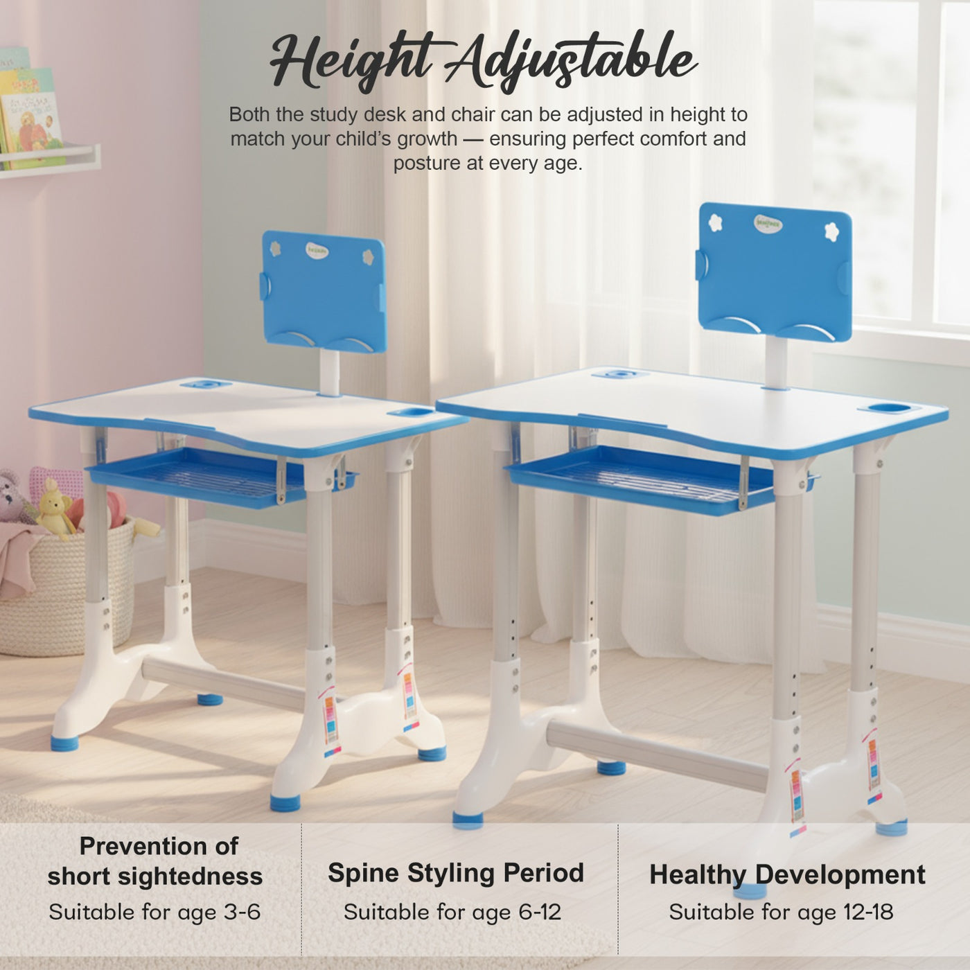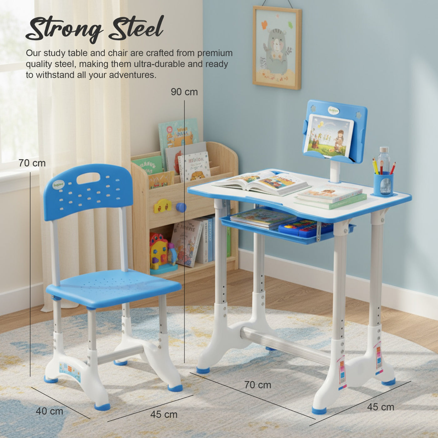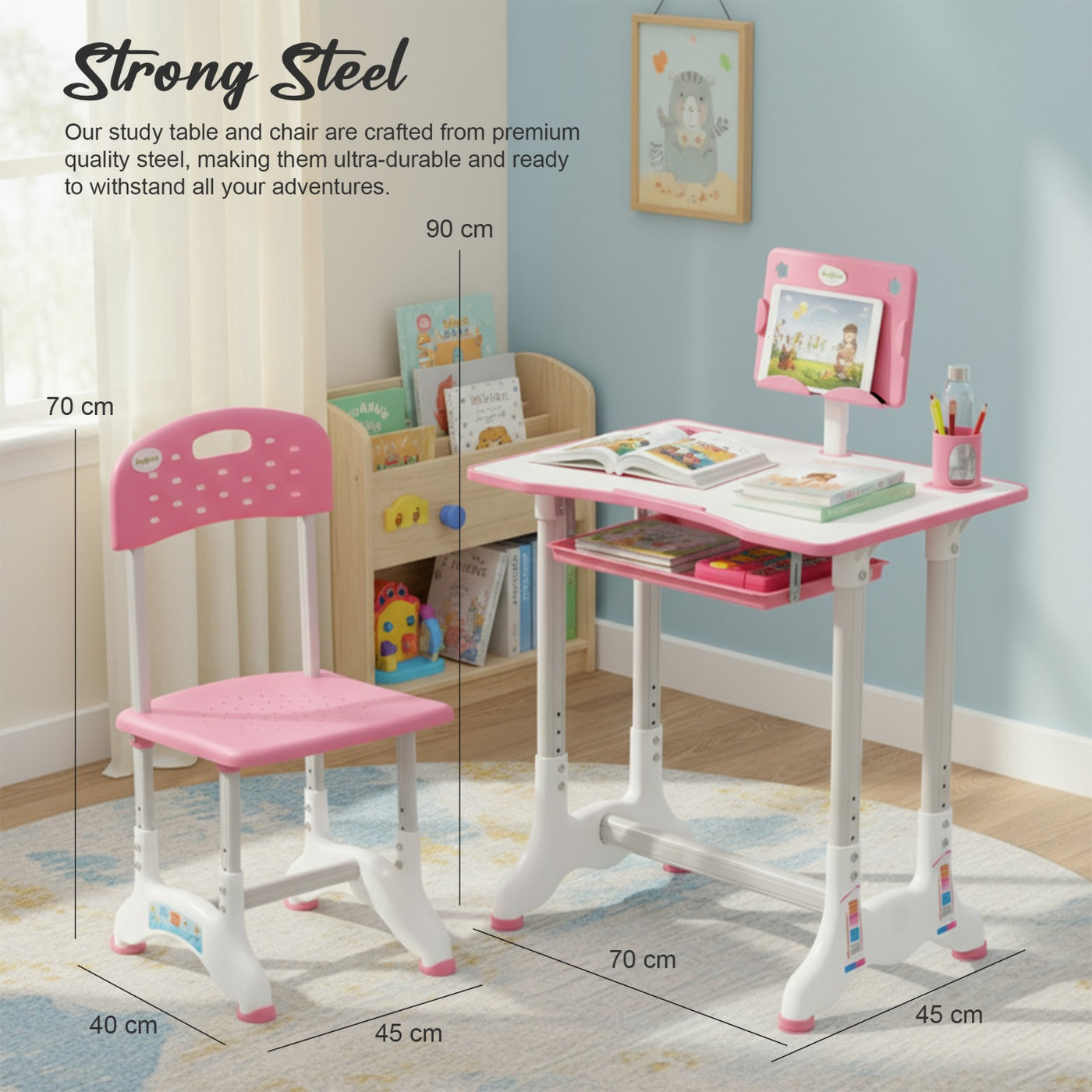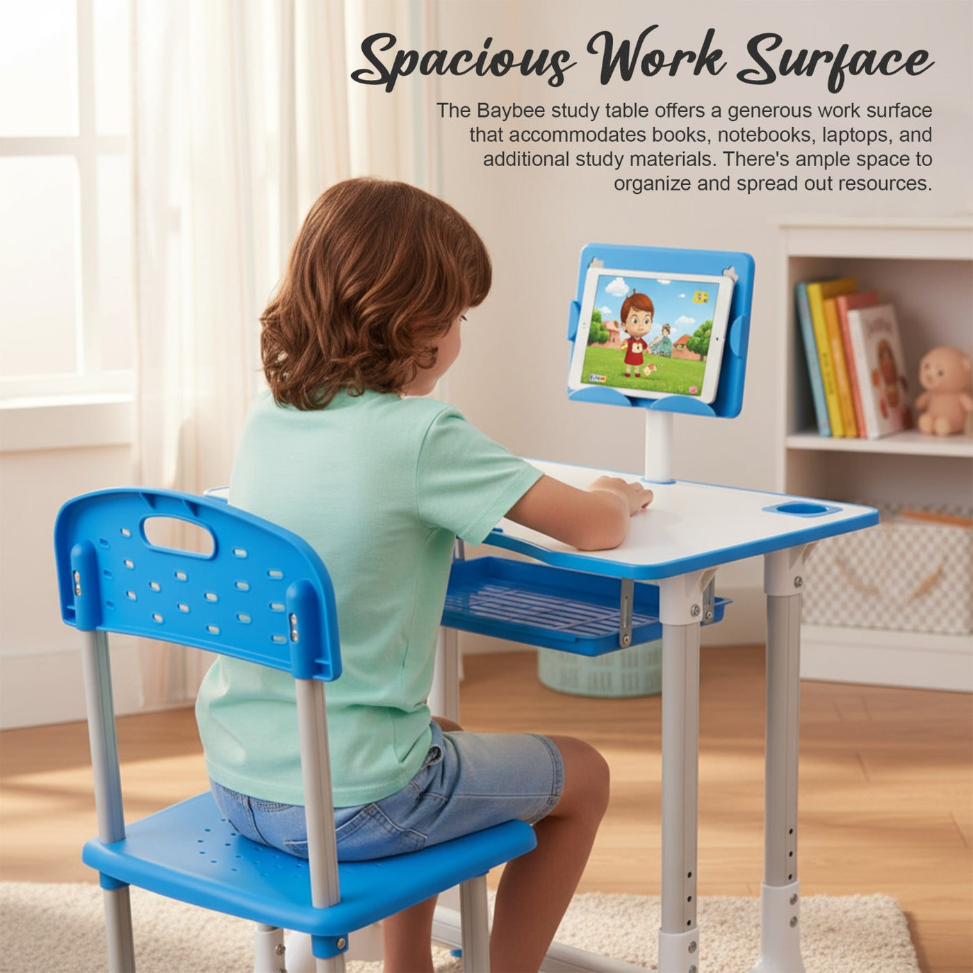 Introducing the Baybee High Adjustable Study Table Set for Kids with Chair, a multifunctional and portable solution designed to enhance your child's learning experience! Specially crafted with the needs of growing minds in mind, this set offers a comfortable and dynamic workspace for boys and girls alike. The study table features an innovative height adjustment mechanism, allowing it to grow with your child. Whether your little one is starting kindergarten or entering their pre-teen years, this table can adapt to their height for a perfect fit. Additionally, the tiltable desktop offers a versatile angle, ensuring an ideal reading and writing position, reducing strain on their neck and eyes. Accompanying the table is an ergonomic chair designed to provide excellent back support and posture correction. Say goodbye to discomfort and promote healthy sitting habits with this thoughtfully designed chair, ensuring your child's focus remains on learning and not on discomfort. The Baybee study table comes equipped with a variety of functional features to keep everything organized. A convenient bookstand keeps textbooks and notebooks within easy reach, while a practical hook offers a spot to hang their school bag, keeping the study area tidy. The built-in drawer provides ample storage space for stationery, art supplies, or other essentials, promoting a clutter-free environment. Crafted from high-quality materials, this study table set ensures durability and stability. Its compact and lightweight design makes it easily portable, allowing you to set up a comfortable learning space anywhere in your home or even take it on family trips. Creating an inspiring learning environment is essential for fostering curiosity and creativity in children. The Baybee study table set promotes a positive study atmosphere, encouraging your little ones to explore their academic interests and unleash their imagination. Give your child the gift of a comfortable and engaging learning experience.