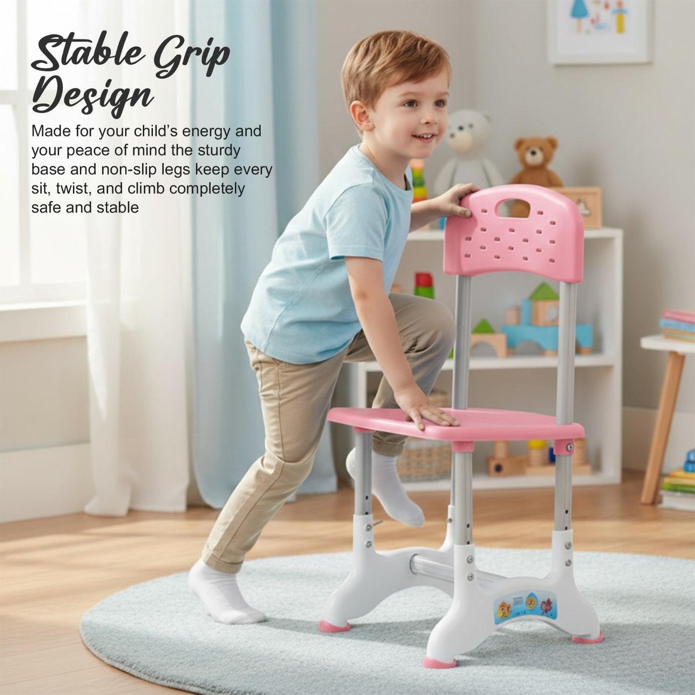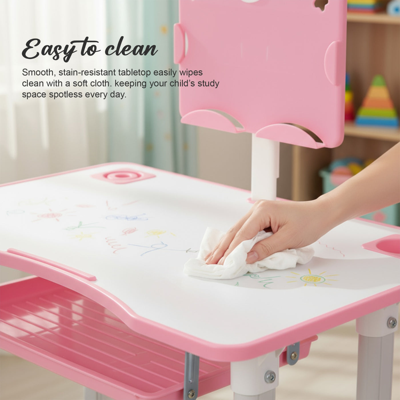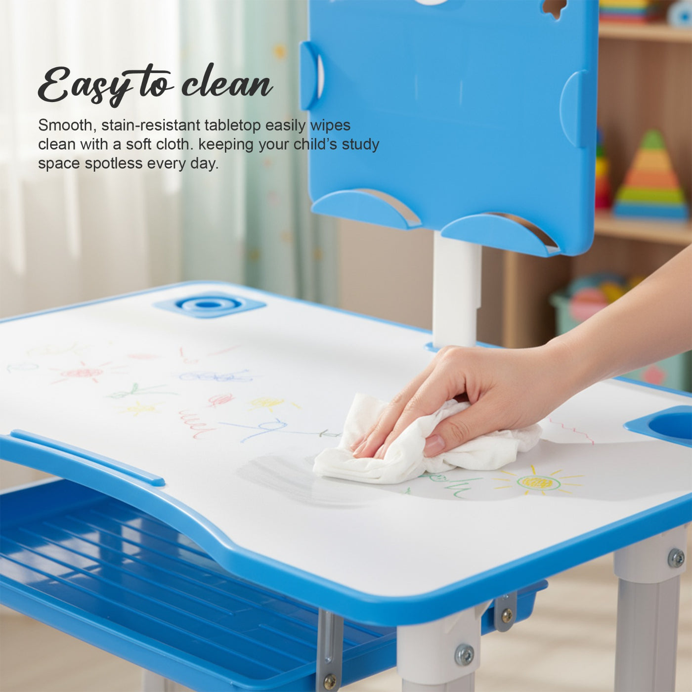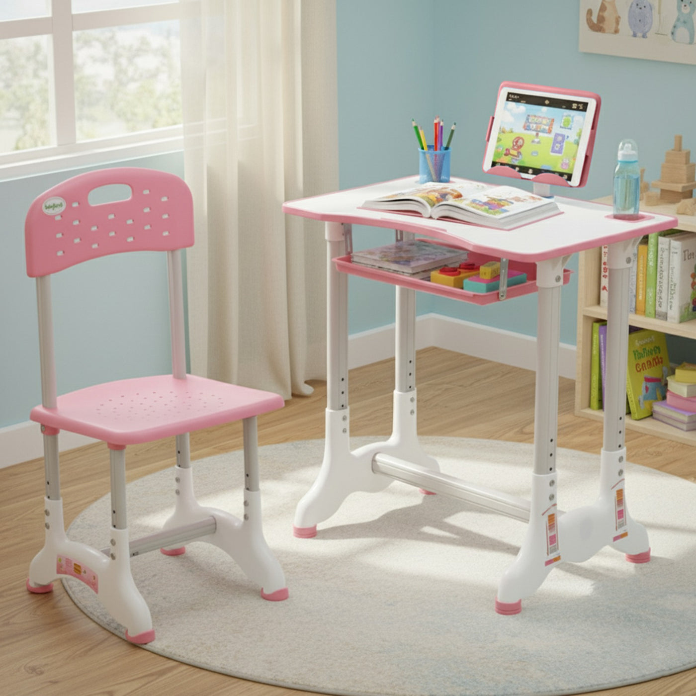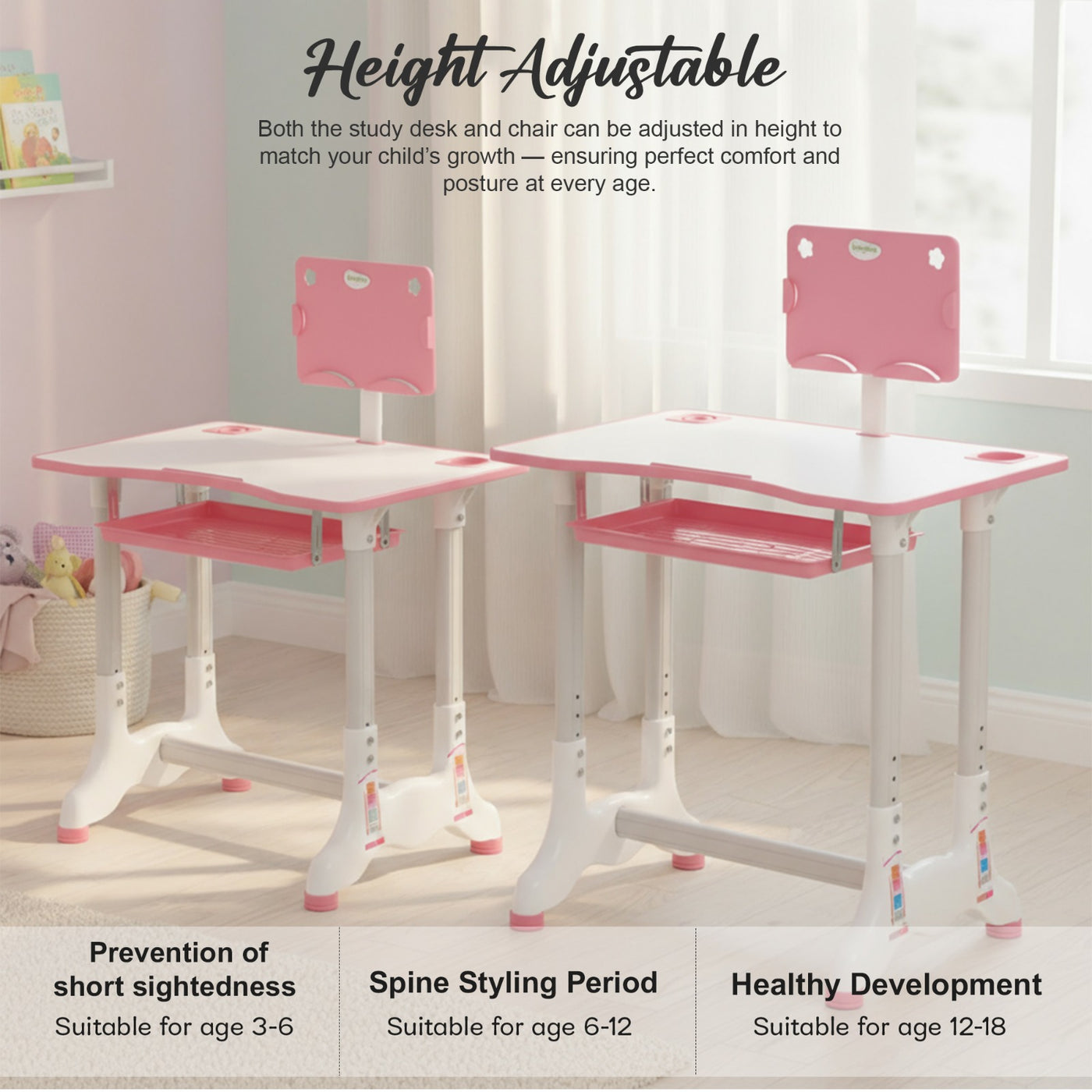 Introducing the Baybee High Adjustable Study Table Set for Kids with Chair, a multifunctional and portable solution designed to enhance your child's learning experience! Specially crafted with the needs of growing minds in mind, this set offers a comfortable and dynamic workspace for boys and girls alike. The study table features an innovative height adjustment mechanism, allowing it to grow with your child. Whether your little one is starting kindergarten or entering their pre-teen years, this table can adapt to their height for a perfect fit. Additionally, the tiltable desktop offers a versatile angle, ensuring an ideal reading and writing position, reducing strain on their neck and eyes. Accompanying the table is an ergonomic chair designed to provide excellent back support and posture correction. Say goodbye to discomfort and promote healthy sitting habits with this thoughtfully designed chair, ensuring your child's focus remains on learning and not on discomfort. The Baybee study table comes equipped with a variety of functional features to keep everything organized. A convenient bookstand keeps textbooks and notebooks within easy reach, while a practical hook offers a spot to hang their school bag, keeping the study area tidy. The built-in drawer provides ample storage space for stationery, art supplies, or other essentials, promoting a clutter-free environment. Crafted from high-quality materials, this study table set ensures durability and stability. Its compact and lightweight design makes it easily portable, allowing you to set up a comfortable learning space anywhere in your home or even take it on family trips. Creating an inspiring learning environment is essential for fostering curiosity and creativity in children. The Baybee study table set promotes a positive study atmosphere, encouraging your little ones to explore their academic interests and unleash their imagination. Give your child the gift of a comfortable and engaging learning experience.