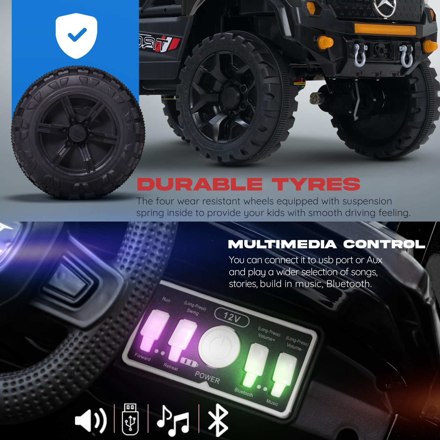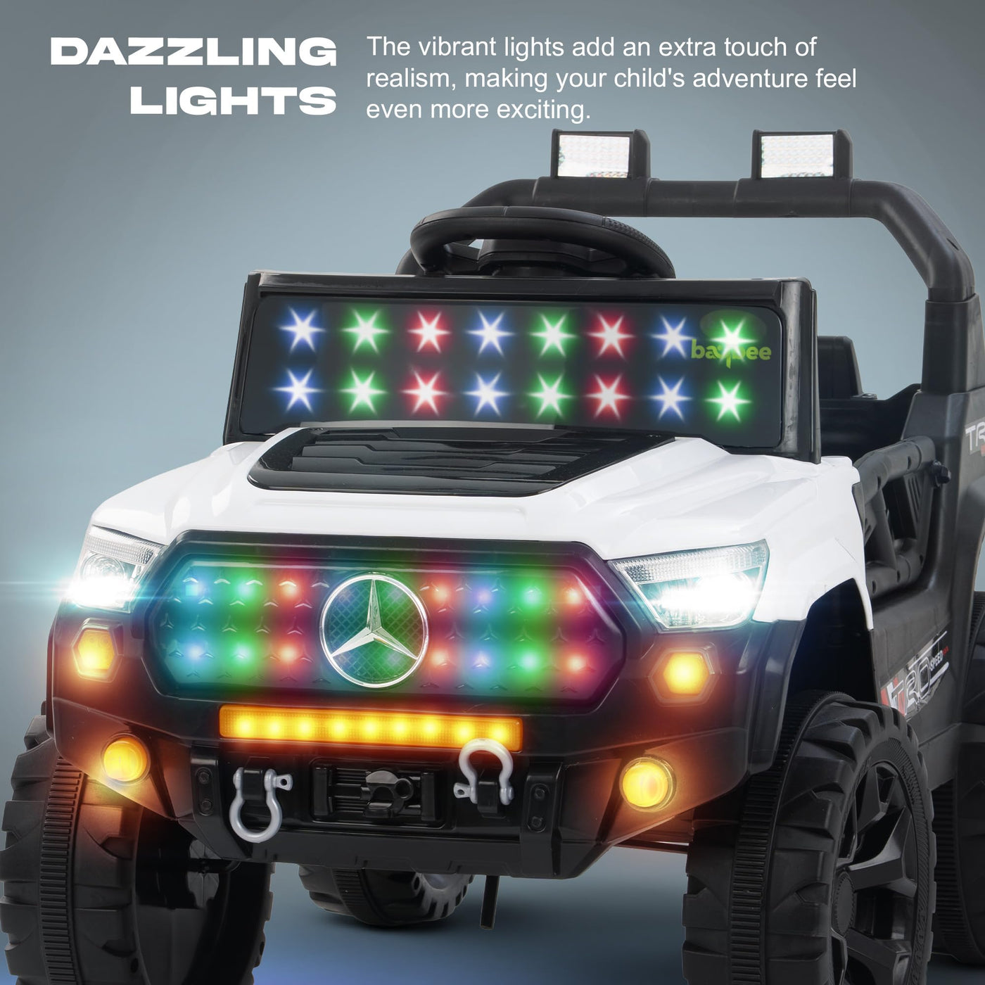 The Baybee Troben 4x4 12V Battery Operated Jeep Car for Kids is designed to deliver an exciting and immersive driving experience for children aged 2 to 6 years. Equipped with a 12V 4.5AH rechargeable battery and four powerful 45W motors, this battery-operated car ensures smooth acceleration, robust performance, and the ability to navigate various terrains effortlessly. This electric jeep for kids features dual driving modes, allowing parents to take control using the 2.4G wireless remote for added safety, while kids can drive independently for a thrilling ride. The durable tyres provide excellent grip and stability, making it ideal for outdoor adventures. Designed to replicate a realistic jeep, this big car for kids is packed with exciting features, including RGB windshield lights, Swing Mode, and a premium multimedia system. Children can enjoy their favorite tunes via USB, Aux, Bluetooth, or preloaded music, adding entertainment to every ride. For maximum comfort and safety, the ergonomic seat and secure seat belt ensure a snug fit, while the shock-absorbing suspension system guarantees a smooth and stable ride. The user-friendly controls, including a forward/reverse switch and foot pedal accelerator, help enhance children's motor skills and coordination while making driving fun and easy. With a long-lasting battery life, this battery car for kids offers extended playtime on a single charge, making it perfect for both indoor and outdoor use. Whether cruising around the backyard, garden, or park, this driving car for kids promises an unforgettable adventure. Designed for young explorers, this stylish and rugged electric jeep makes an ideal gift for little car enthusiasts, combining safety, entertainment, and endless fun in one incredible ride!
