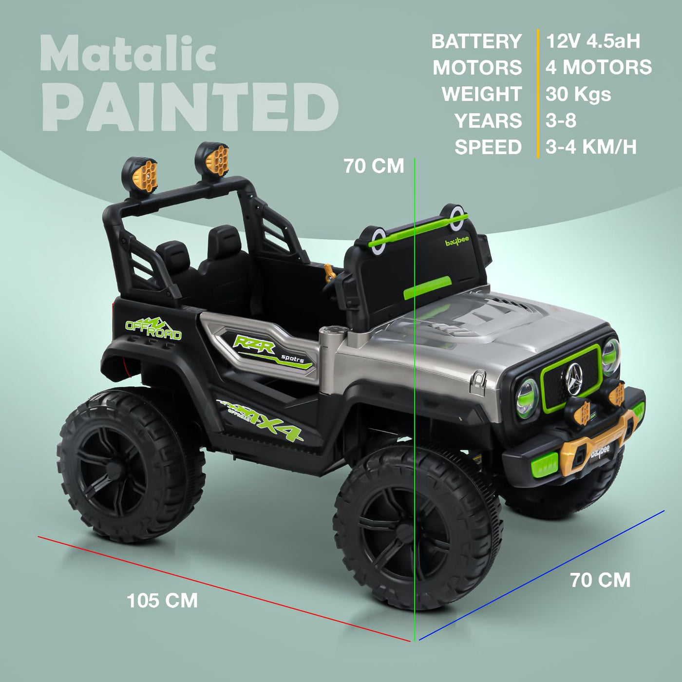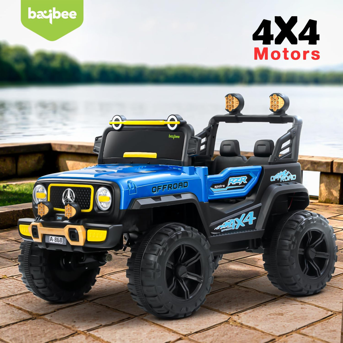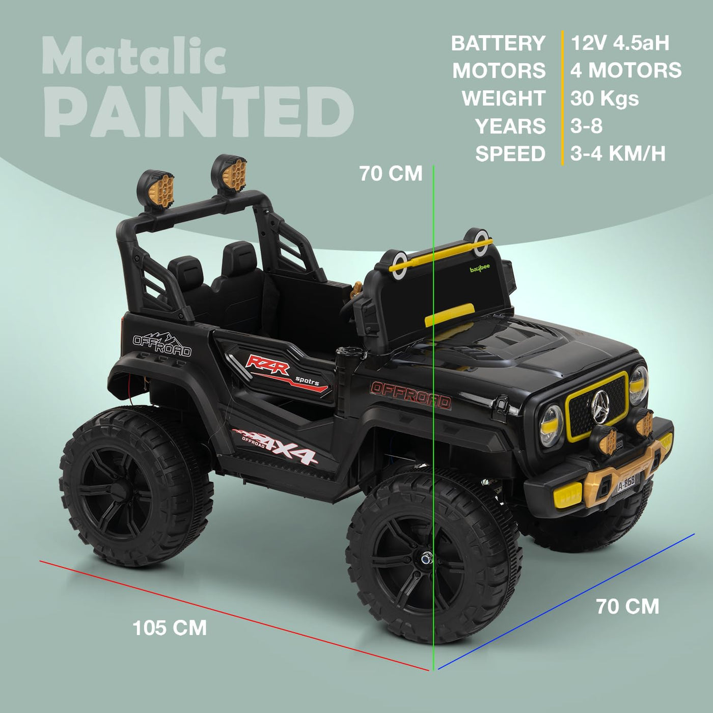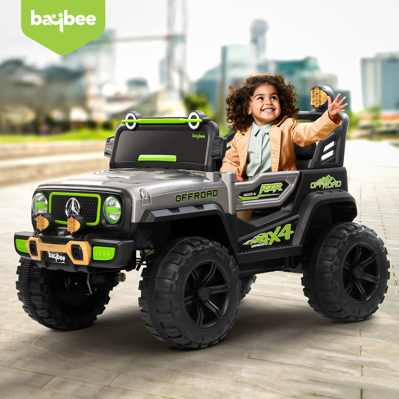 The Baybee Rechargeable Battery Operated Jeep is designed to provide your little ones with the thrill of driving their very own car. With dual control modes, parents can guide their kids using the 2.4G wireless remote controller, or kids can take the wheel and drive independently. This engaging feature promotes hand-eye-foot coordination, enhances courage, and builds confidence as they navigate forward and backward movements with ease. Perfect for nurturing their early driving skills! Realistic Design with Exciting Features: Crafted to mimic the look and feel of a real vehicle, this electric car for kids offers a truly immersive experience. Equipped with Swing mode, a horn, LED headlights, RGB lighting on the windshield, inbuilt music, USB, Aux connectivity, and a remote controller, the Baybee Wrangler Jeep makes every ride exciting and entertaining. The twin butterfly doors, hidden charging port, and user-friendly controls add an extra layer of fun to playtime, making it a standout jeep for kids. Comfort Meets Durability: The Baybee Wrangler is not just about looks—it's built for comfort and longevity. Featuring two wear-resistant seats, this ride-on kids car ensures your children enjoy every journey in comfort. The four sturdy, wear-resistant wheels are equipped with suspension springs, providing a smooth ride across various terrains. Designed to endure countless adventures, this battery-operated jeep is a reliable companion for outdoor fun. Safety-First Engineering: Your child’s safety is our top priority. The Baybee Wrangler Jeep comes with a powerful 4 Motor engine and bright LED lights on both the front and back for enhanced visibility during night-time drives. The steering wheel is thoughtfully designed to make slight directional changes, reducing the risk of overturning and ensuring a secure and enjoyable experience. With this battery car for kids, peace of mind is always included. Long-Lasting Fun: Equipped with a robust 12V battery, the Baybee Wrangler offers up to 40 minutes of continuous play on a full charge. This electric car for kids is perfect for extended play sessions, providing hours of entertainment and adventure. Whether it's a fun ride around the park or a thrilling backyard adventure, this jeep for kids delivers endless fun. Easy Assembly, Ready for Play: Setting up the Baybee Wrangler is a breeze. The product requires easy self-assembly, and an instruction manual is provided to guide you through the process quickly. Once assembled, your child is ready to embark on exciting journeys with their new favorite ride!
