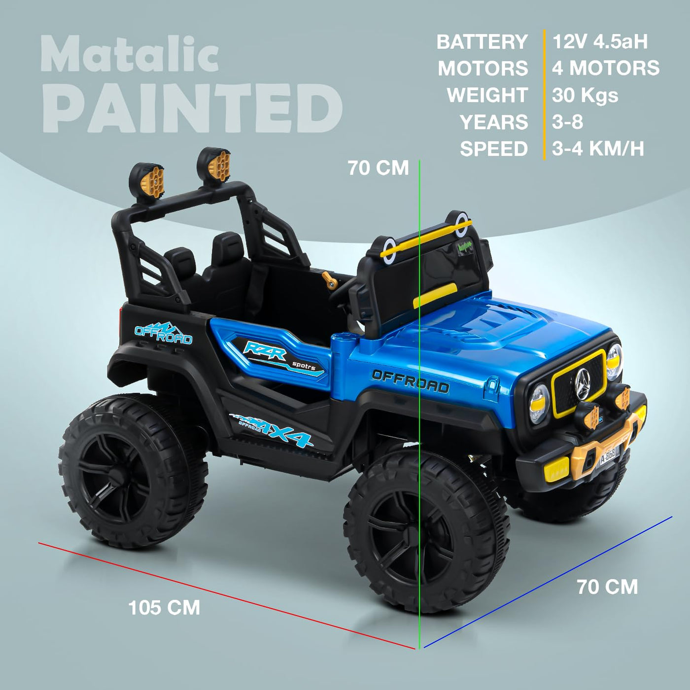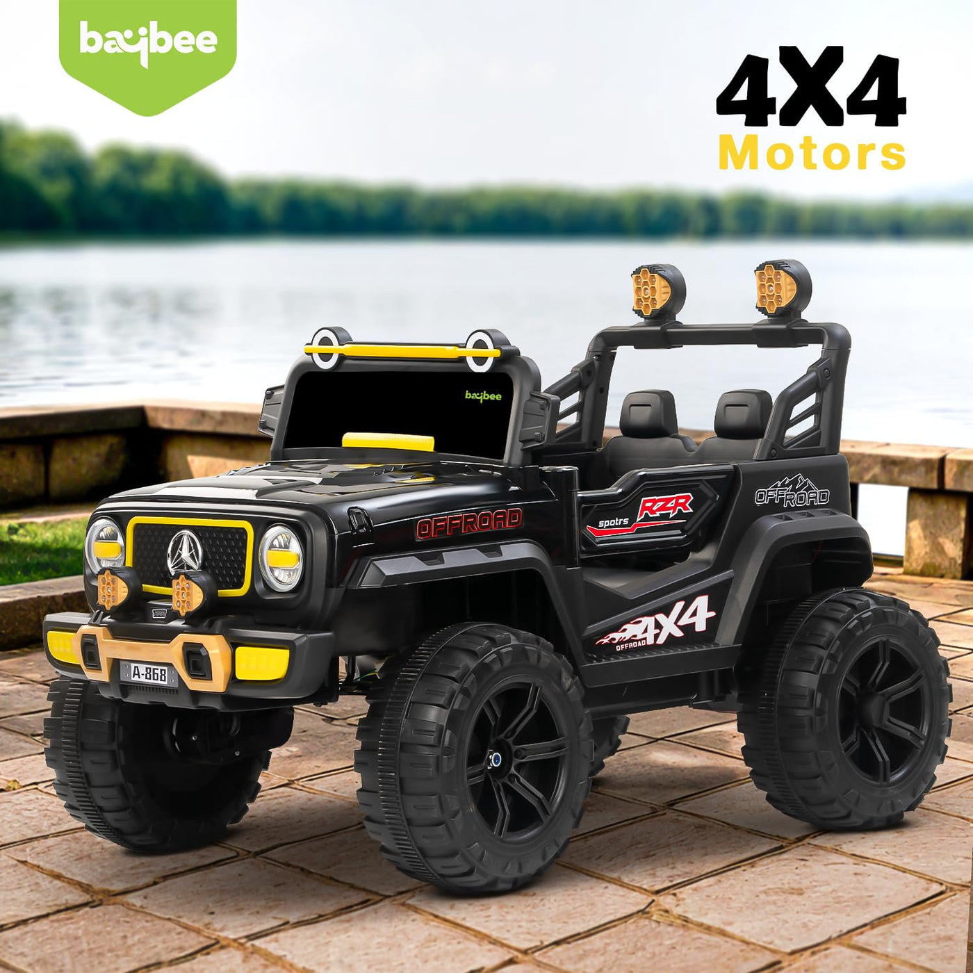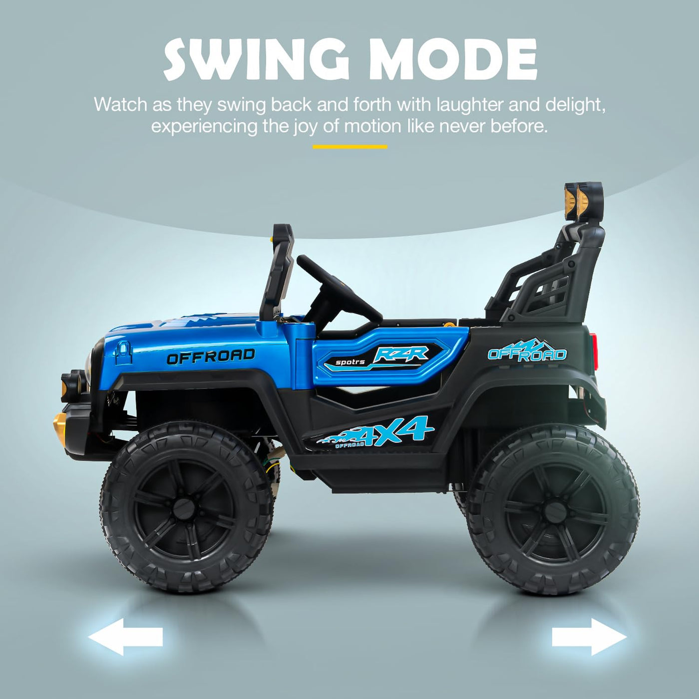 The Baybee Rechargeable Battery Operated Jeep is designed to provide your little ones with the thrill of driving their very own car. With dual control modes, parents can guide their kids using the 2.4G wireless remote controller, or kids can take the wheel and drive independently. This engaging feature promotes hand-eye-foot coordination, enhances courage, and builds confidence as they navigate forward and backward movements with ease. Perfect for nurturing their early driving skills! Realistic Design with Exciting Features: Crafted to mimic the look and feel of a real vehicle, this electric car for kids offers a truly immersive experience. Equipped with Swing mode, a horn, LED headlights, RGB lighting on the windshield, inbuilt music, USB, Aux connectivity, and a remote controller, the Baybee Wrangler Jeep makes every ride exciting and entertaining. The twin butterfly doors, hidden charging port, and user-friendly controls add an extra layer of fun to playtime, making it a standout jeep for kids. Comfort Meets Durability: The Baybee Wrangler is not just about looks—it's built for comfort and longevity. Featuring two wear-resistant seats, this ride-on kids car ensures your children enjoy every journey in comfort. The four sturdy, wear-resistant wheels are equipped with suspension springs, providing a smooth ride across various terrains. Designed to endure countless adventures, this battery-operated jeep is a reliable companion for outdoor fun. Safety-First Engineering: Your child’s safety is our top priority. The Baybee Wrangler Jeep comes with a powerful 4 Motor engine and bright LED lights on both the front and back for enhanced visibility during night-time drives. The steering wheel is thoughtfully designed to make slight directional changes, reducing the risk of overturning and ensuring a secure and enjoyable experience. With this battery car for kids, peace of mind is always included. Long-Lasting Fun: Equipped with a robust 12V battery, the Baybee Wrangler offers up to 40 minutes of continuous play on a full charge. This electric car for kids is perfect for extended play sessions, providing hours of entertainment and adventure. Whether it's a fun ride around the park or a thrilling backyard adventure, this jeep for kids delivers endless fun. Easy Assembly, Ready for Play: Setting up the Baybee Wrangler is a breeze. The product requires easy self-assembly, and an instruction manual is provided to guide you through the process quickly. Once assembled, your child is ready to embark on exciting journeys with their new favorite ride!