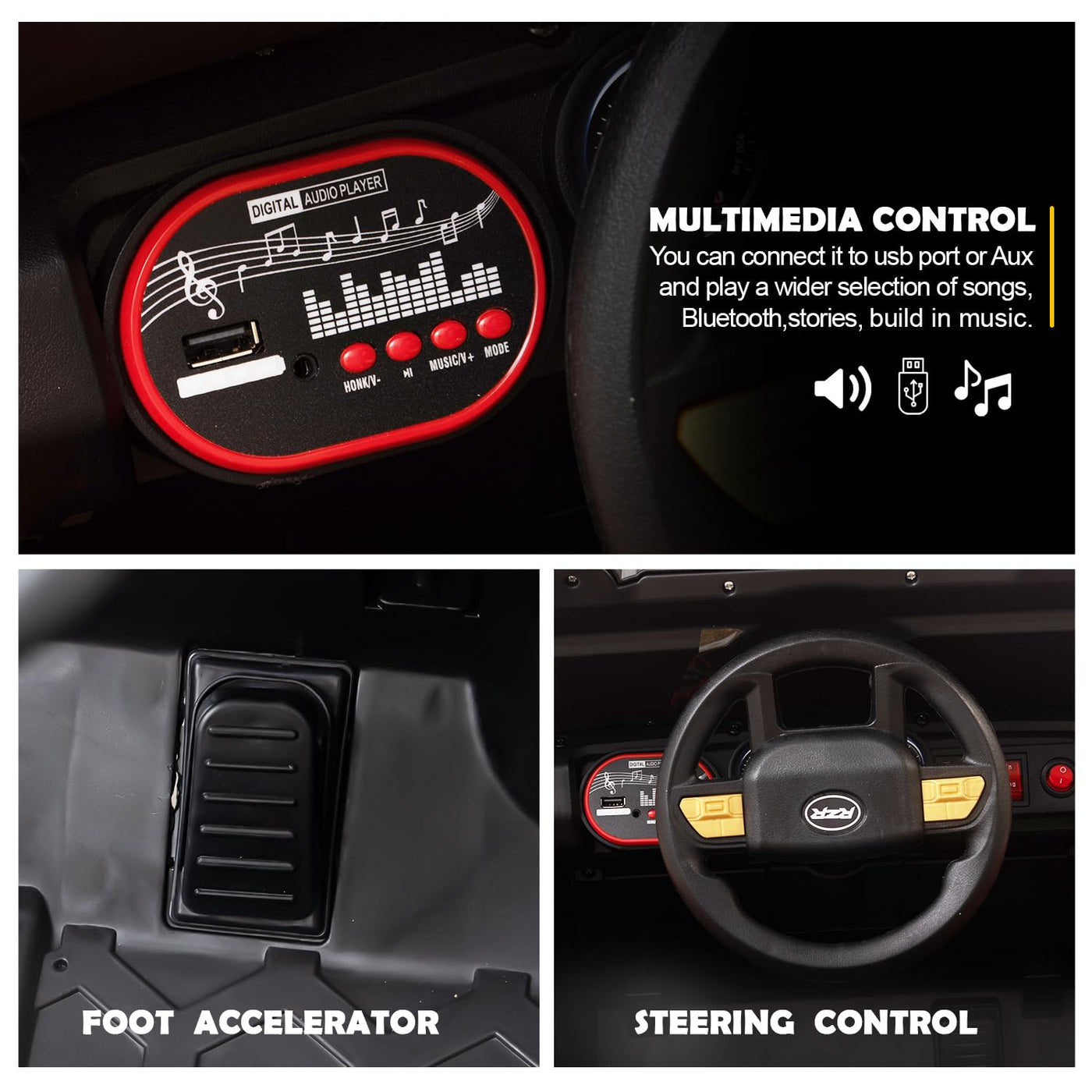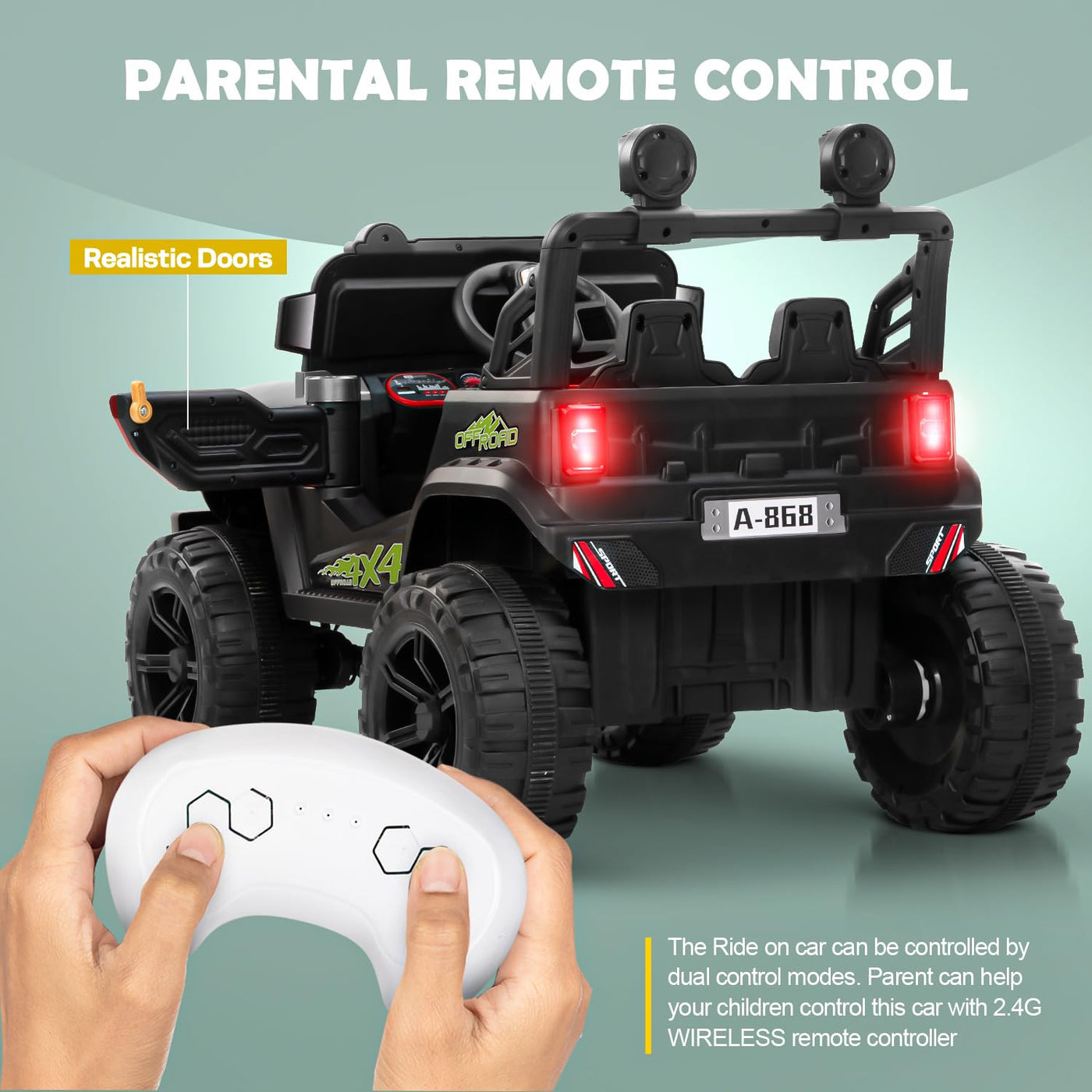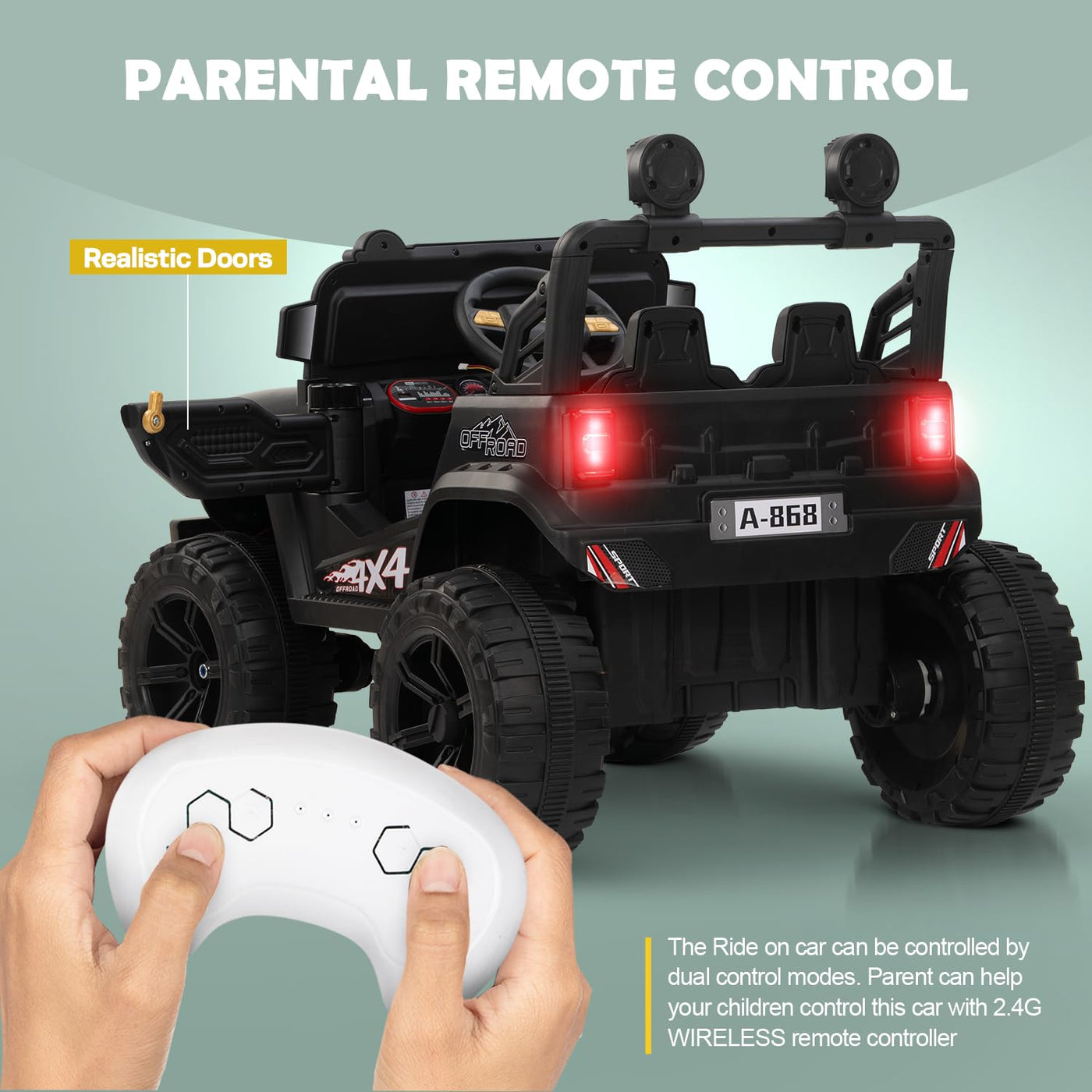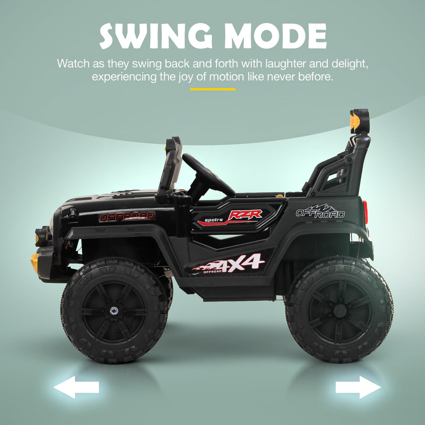 The Baybee Rechargeable Battery Operated Jeep is designed to provide your little ones with the thrill of driving their very own car. With dual control modes, parents can guide their kids using the 2.4G wireless remote controller, or kids can take the wheel and drive independently. This engaging feature promotes hand-eye-foot coordination, enhances courage, and builds confidence as they navigate forward and backward movements with ease. Perfect for nurturing their early driving skills! Realistic Design with Exciting Features: Crafted to mimic the look and feel of a real vehicle, this electric car for kids offers a truly immersive experience. Equipped with Swing mode, a horn, LED headlights, RGB lighting on the windshield, inbuilt music, USB, Aux connectivity, and a remote controller, the Baybee Wrangler Jeep makes every ride exciting and entertaining. The twin butterfly doors, hidden charging port, and user-friendly controls add an extra layer of fun to playtime, making it a standout jeep for kids. Comfort Meets Durability: The Baybee Wrangler is not just about looks—it's built for comfort and longevity. Featuring two wear-resistant seats, this ride-on kids car ensures your children enjoy every journey in comfort. The four sturdy, wear-resistant wheels are equipped with suspension springs, providing a smooth ride across various terrains. Designed to endure countless adventures, this battery-operated jeep is a reliable companion for outdoor fun. Safety-First Engineering: Your child’s safety is our top priority. The Baybee Wrangler Jeep comes with a powerful 4 Motor engine and bright LED lights on both the front and back for enhanced visibility during night-time drives. The steering wheel is thoughtfully designed to make slight directional changes, reducing the risk of overturning and ensuring a secure and enjoyable experience. With this battery car for kids, peace of mind is always included. Long-Lasting Fun: Equipped with a robust 12V battery, the Baybee Wrangler offers up to 40 minutes of continuous play on a full charge. This electric car for kids is perfect for extended play sessions, providing hours of entertainment and adventure. Whether it's a fun ride around the park or a thrilling backyard adventure, this jeep for kids delivers endless fun. Easy Assembly, Ready for Play: Setting up the Baybee Wrangler is a breeze. The product requires easy self-assembly, and an instruction manual is provided to guide you through the process quickly. Once assembled, your child is ready to embark on exciting journeys with their new favorite ride!